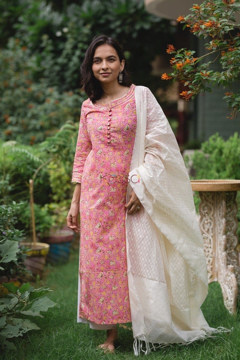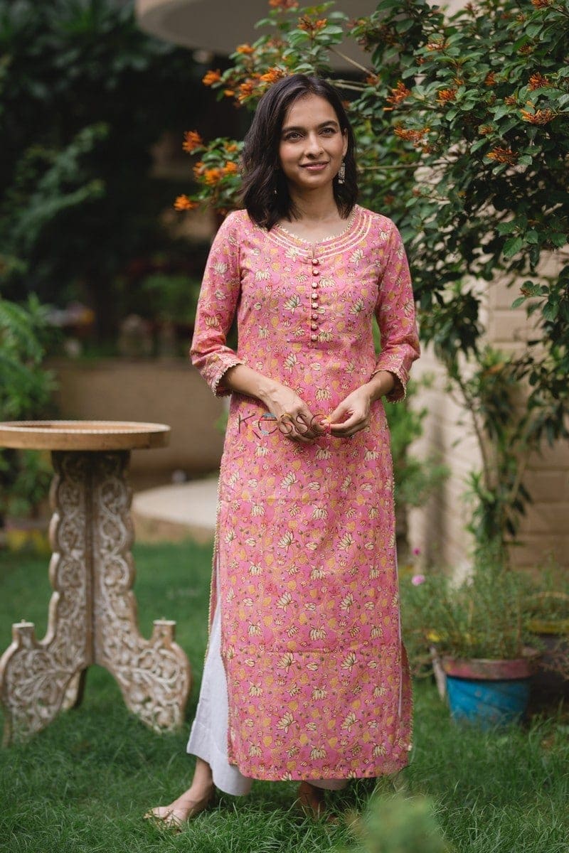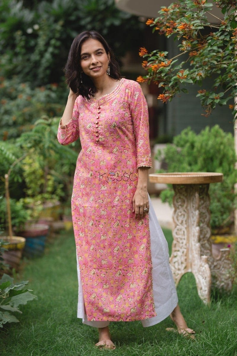 SKU: WS449 This straight fit kurta displays a labyrinth of lotus motifs in white and orange. The kurta is beautifully detailed with gota work along the neck, sleeves and side slits. The yoke features a row of flower decorated buttons and the kurta comes with 3/4th sleeves.