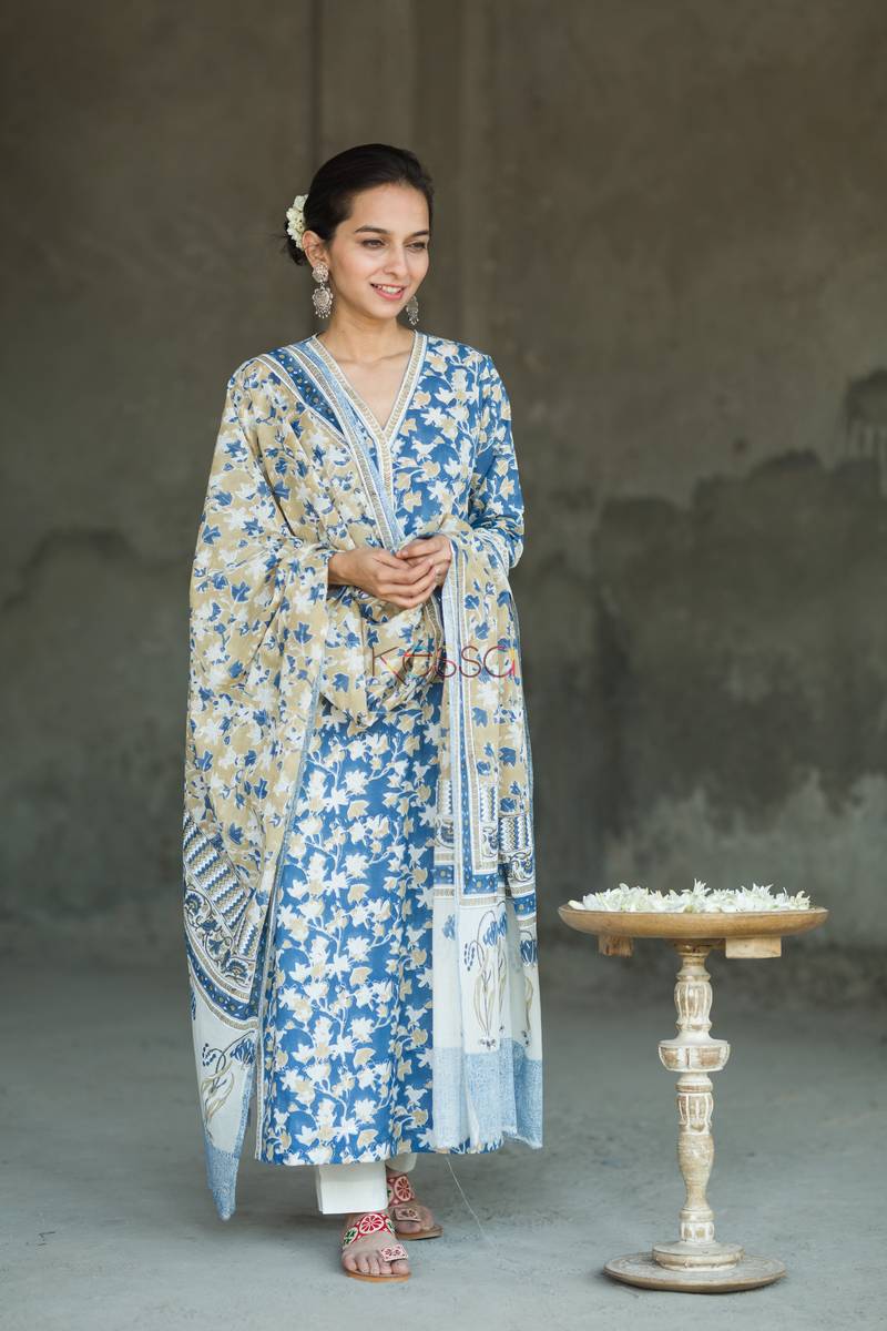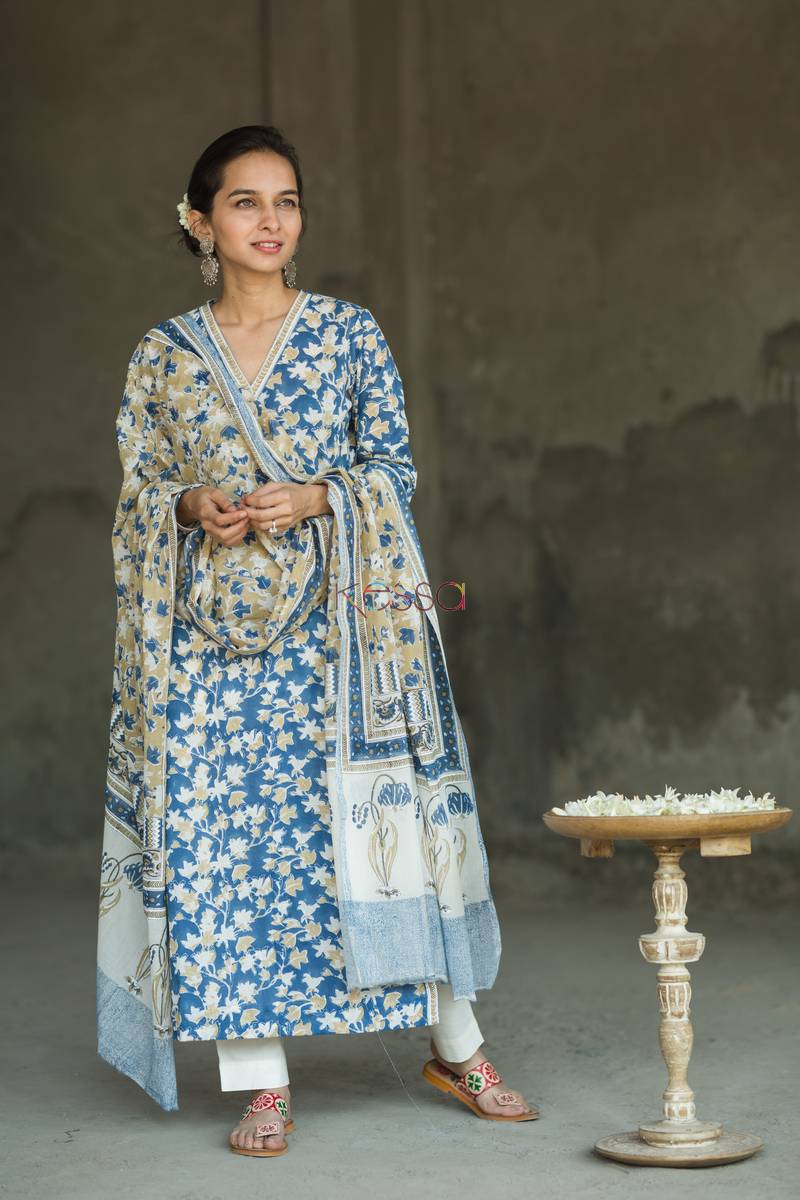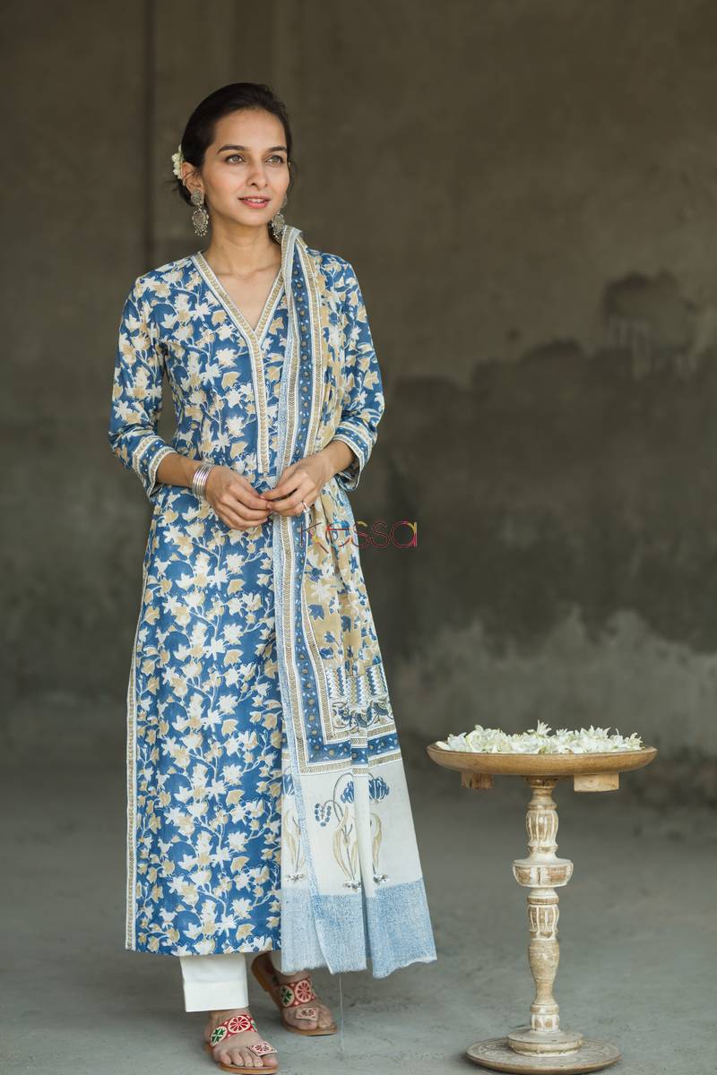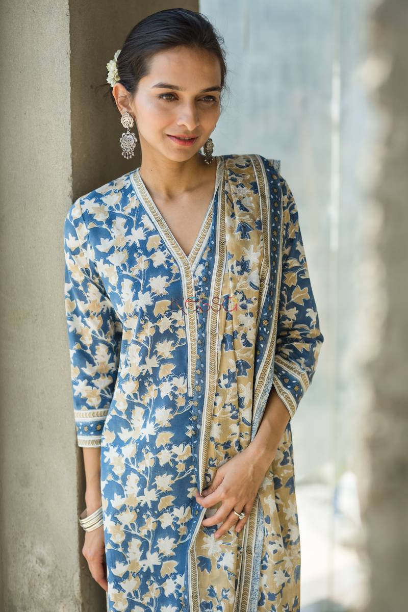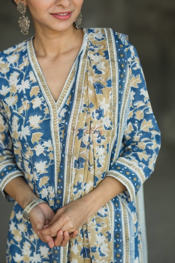 SKU: KUOJ61 This suit set – Kurta with dupatta, is perfect art of the chippas from Rajasthan. The jaal print is done using sheesham wood block and aligning the pattern to get this look. The dupattas are all concept based and have exclusive print. This suit dupatta has border and whole base print is traditional jaal print of Rajasthan.