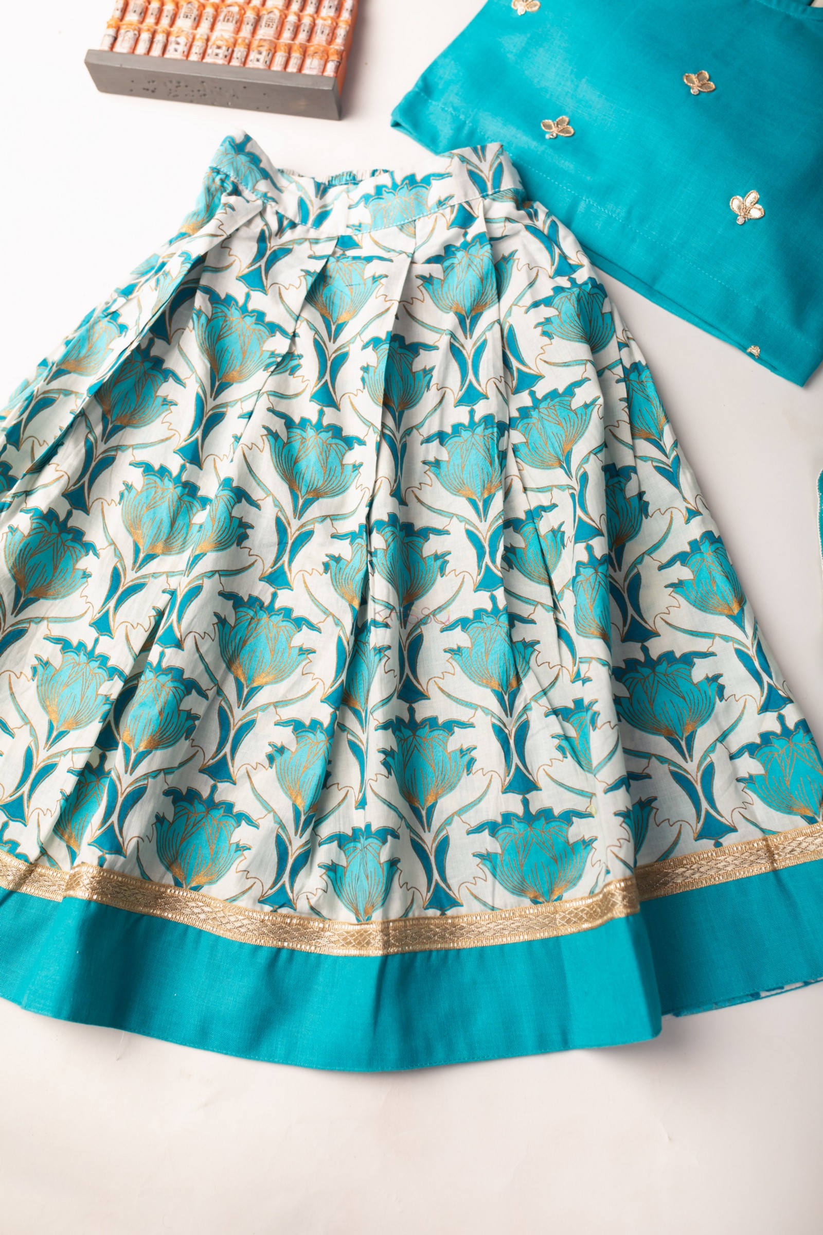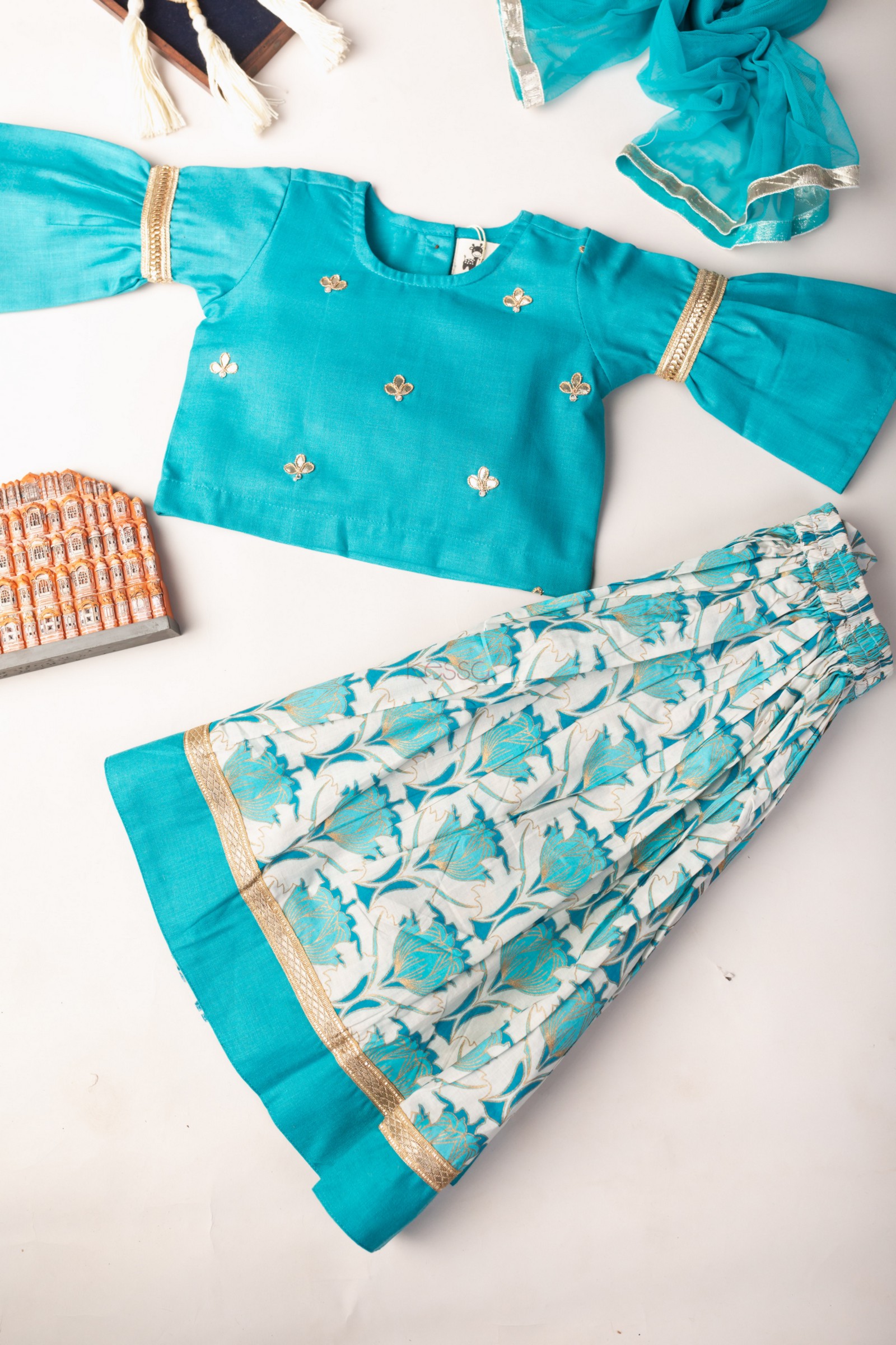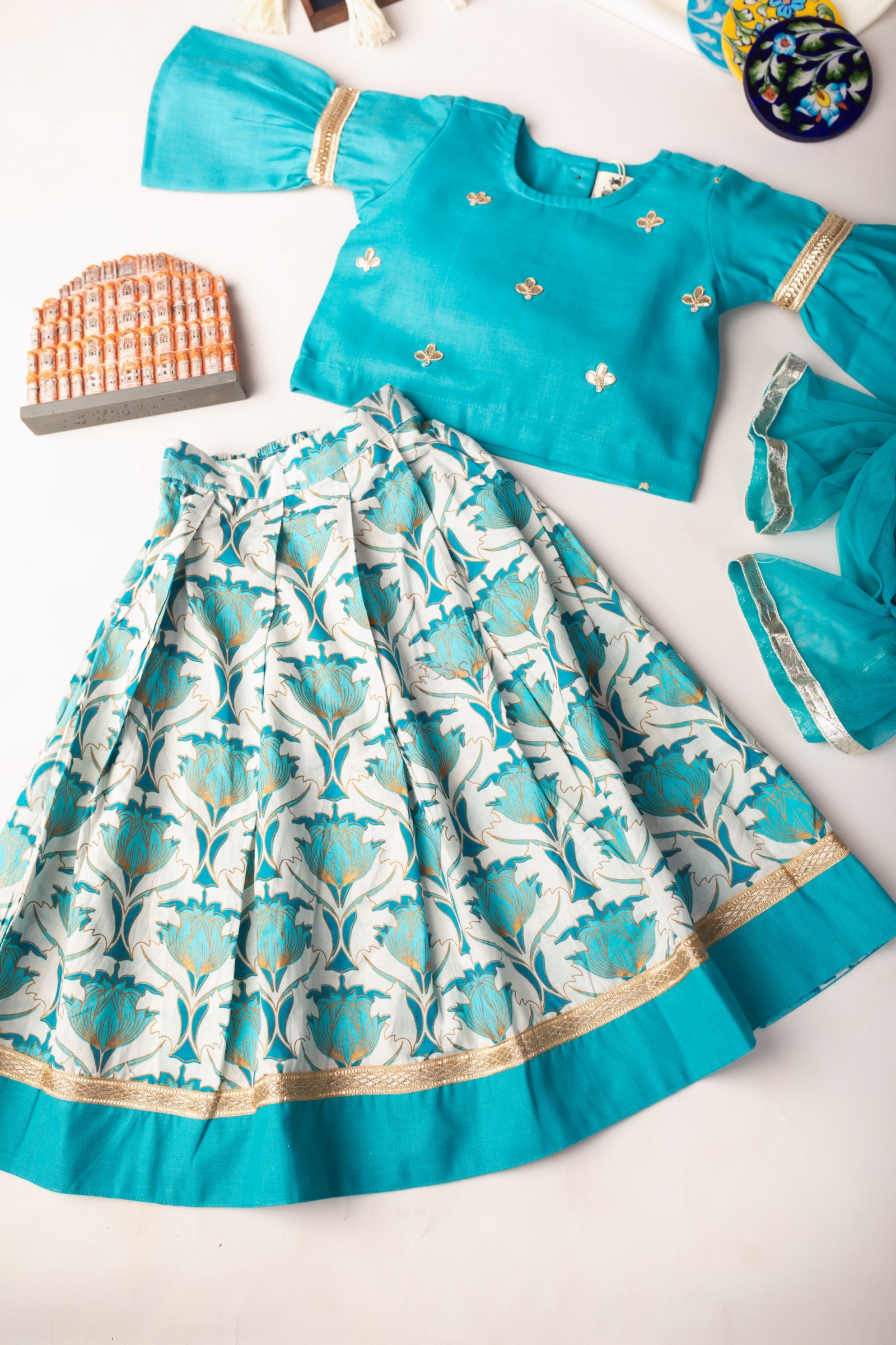 SKU: AJ72 The 100% premium cotton lehenga set, beautiful gota patti work on top and sleeves Highlighted with Gota lace. The Bright Turquoise blue top with an round style neckline is beautifully complemented with the matching blue and off white lehenga. The lehenga highlighted with gota lace. The set comes with Soft net dupatta one side highlighted with Gota lace.
