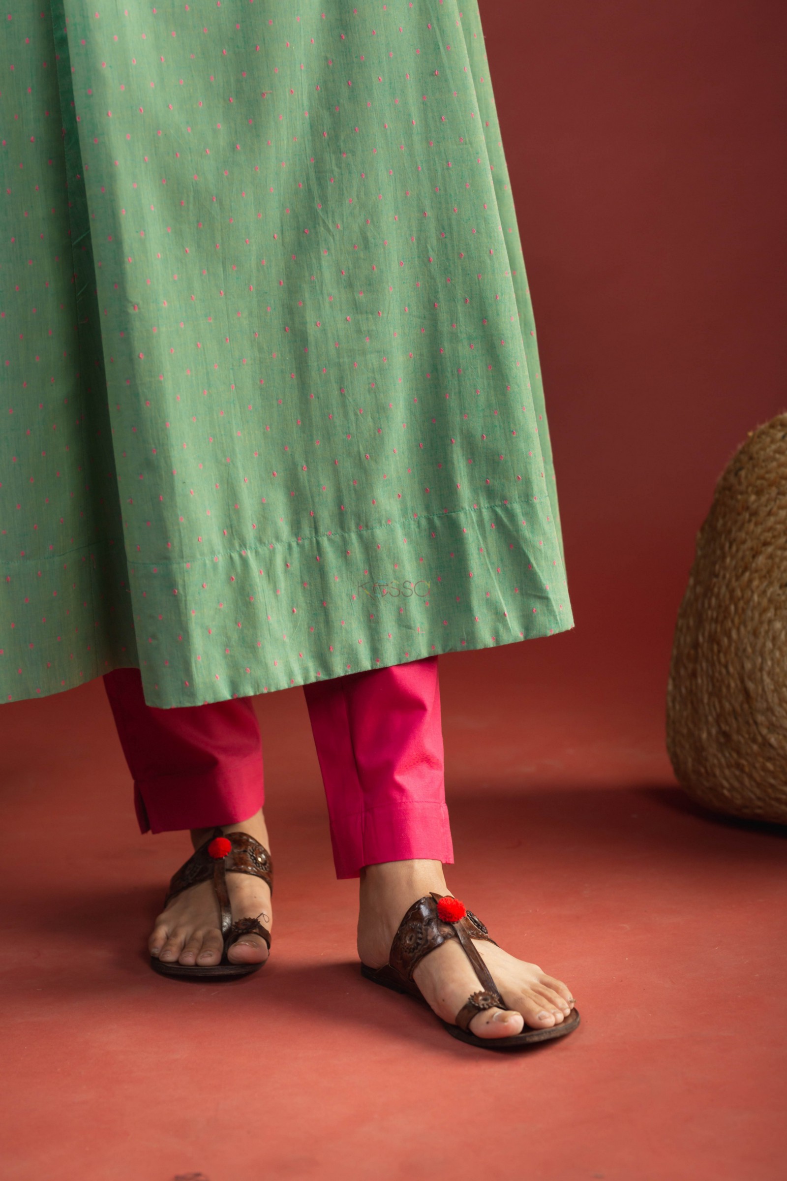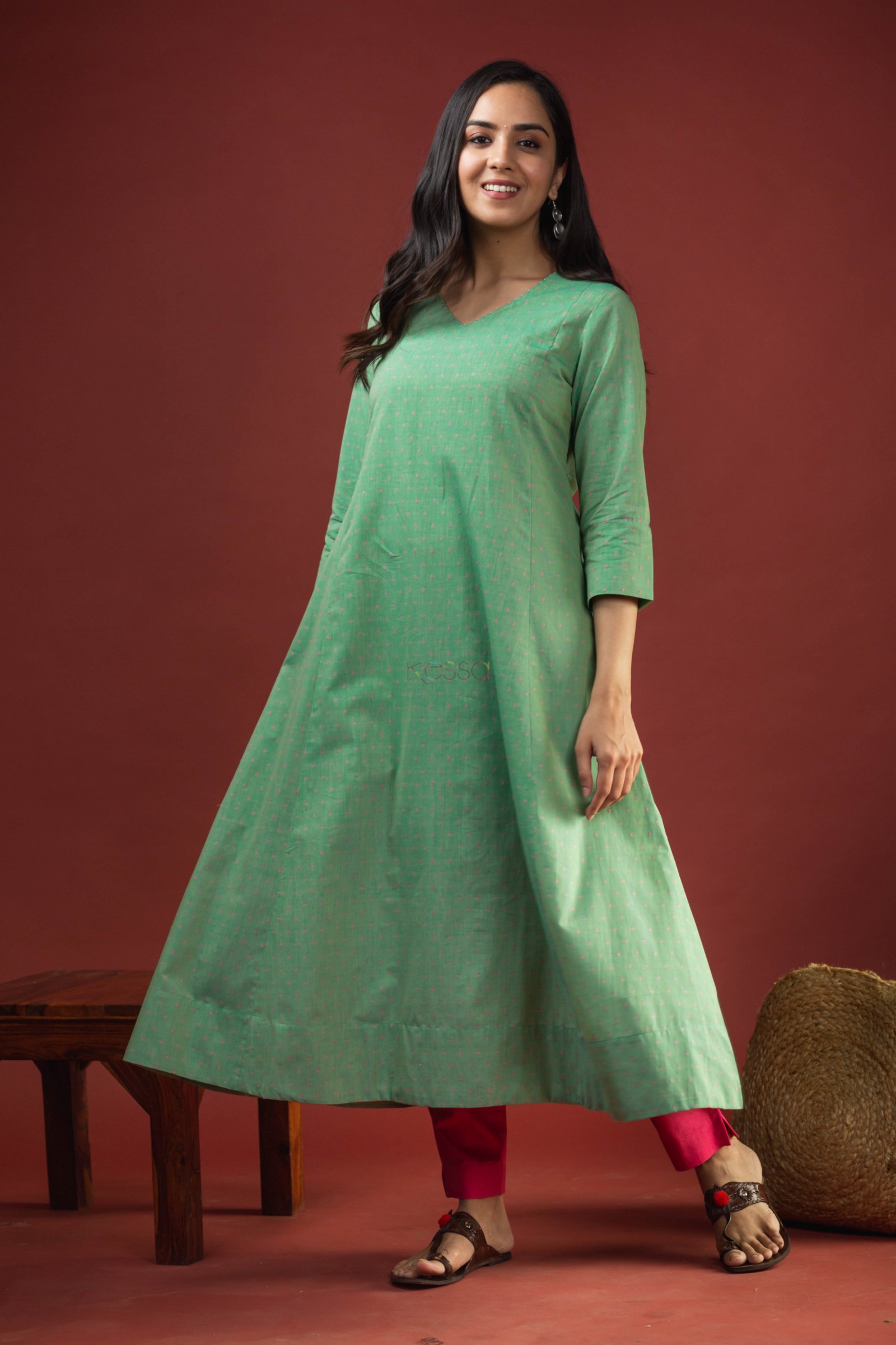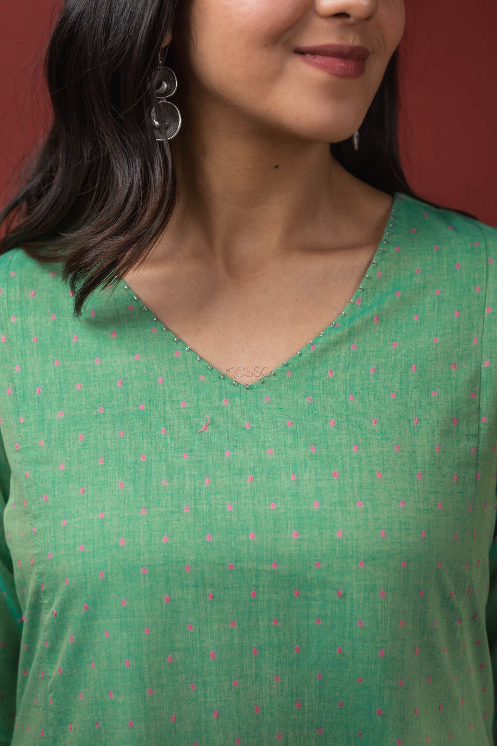 SKU: AVDAF206 This cotton A-line kurta features intricate beadwork on the neckline, adding a touch of glamor to the overall design. The sleeves are adorned with beautiful handkatha work, creating a striking contrast against the green fabric. The kurta has a flattering v-neck and 3/4th sleeves, making it a versatile choice for various occasions. It also includes a convenient side pocket for added functionality. Pair it with our pant for perfect look.