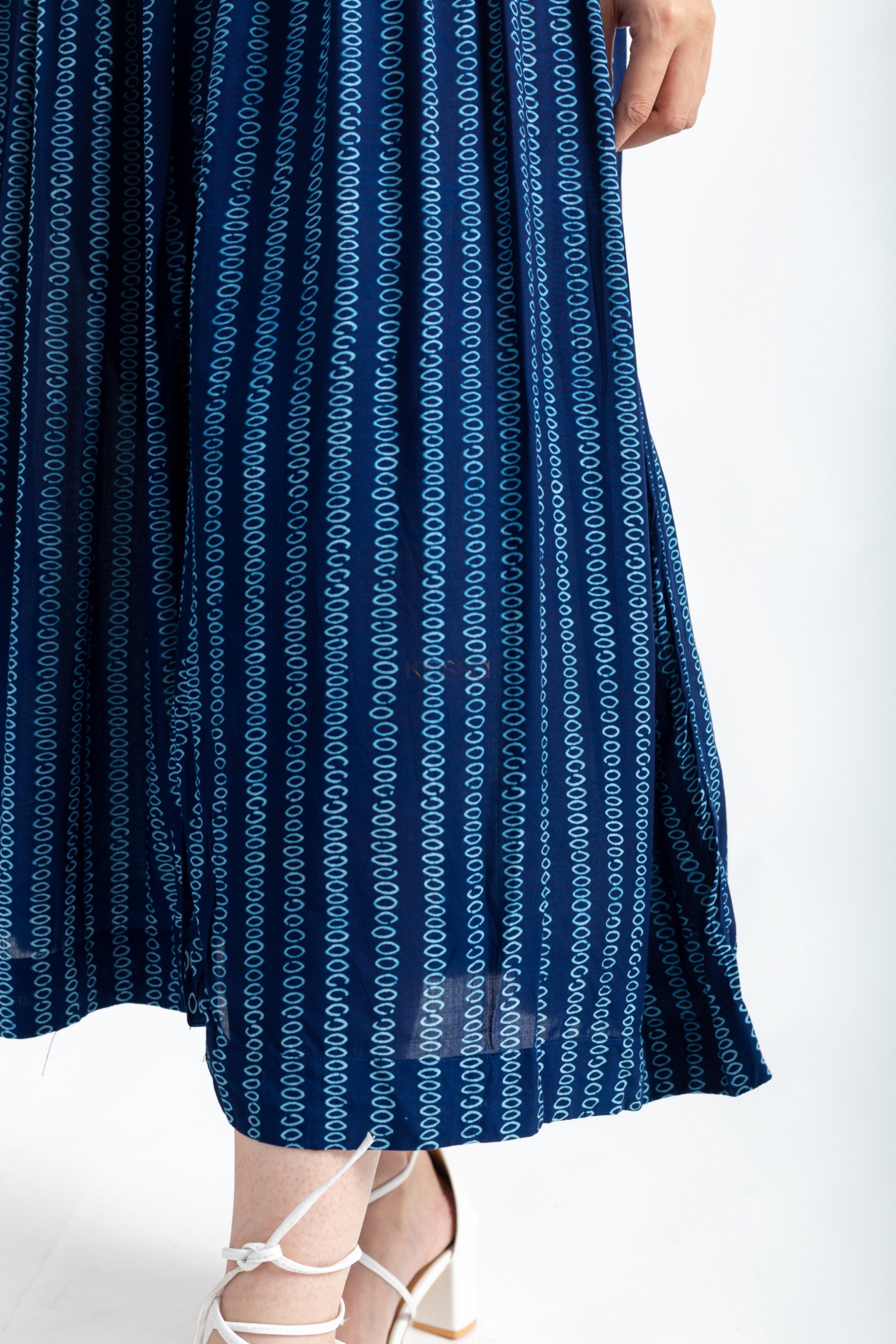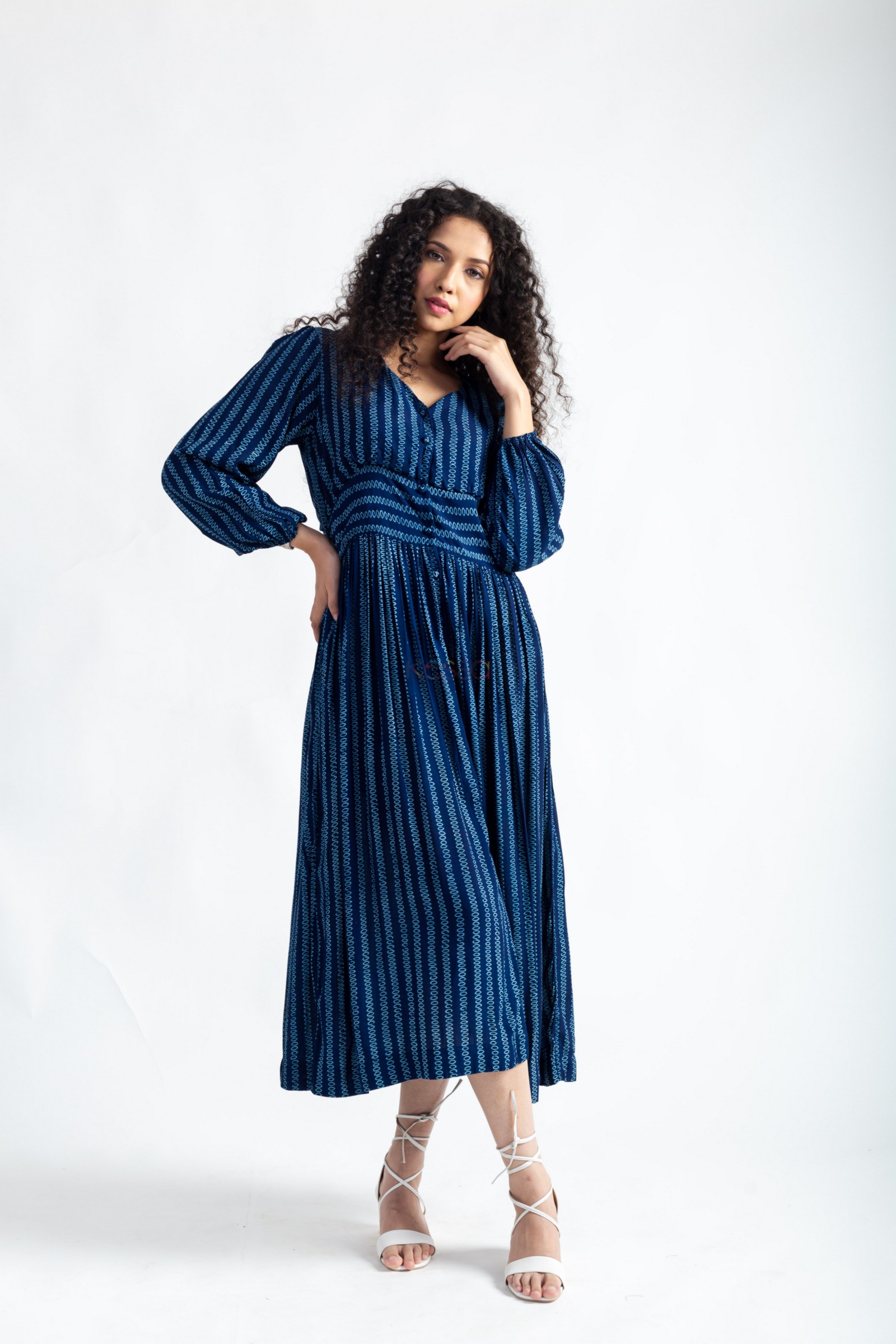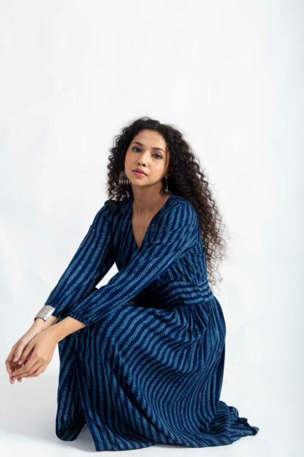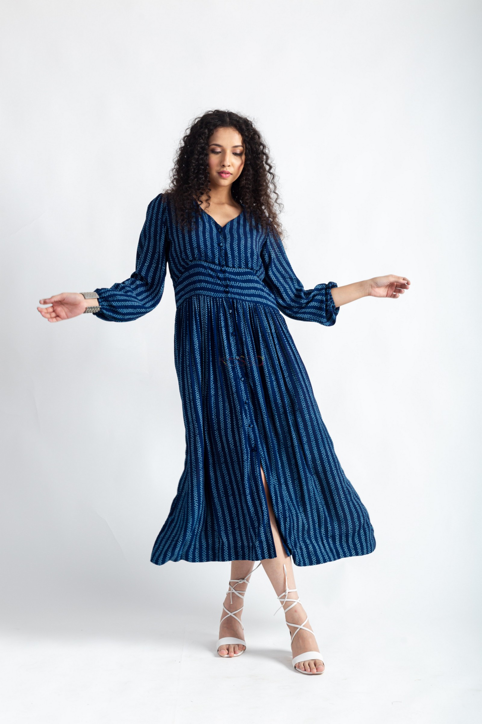 SKU: AVDAF230 The indigo muslin dress is a versatile and stylish garment. It is made from lightweight and breathable muslin fabric, providing comfort throughout the day. The dress features a front button design, a V-neckline, and 3/4th sleeves, giving it a fashionable and flattering look. It also has a convenient side pocket and the dress comes with an inner lining, ensuring comfort and confidence. Whether you dress it up or down, this indigo muslin dress is a chic and comfortable choice for various occasions.