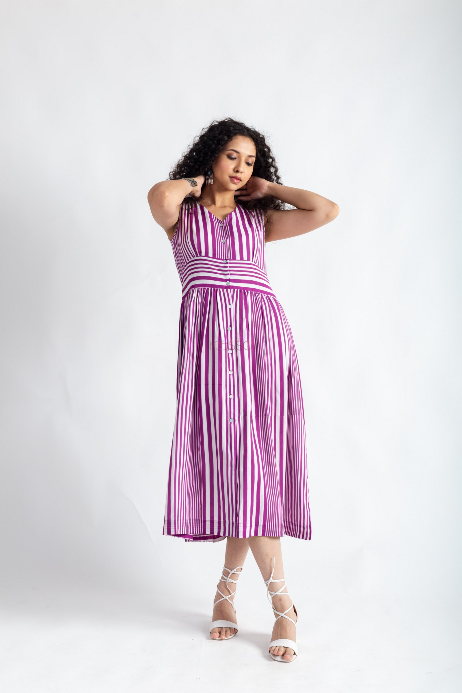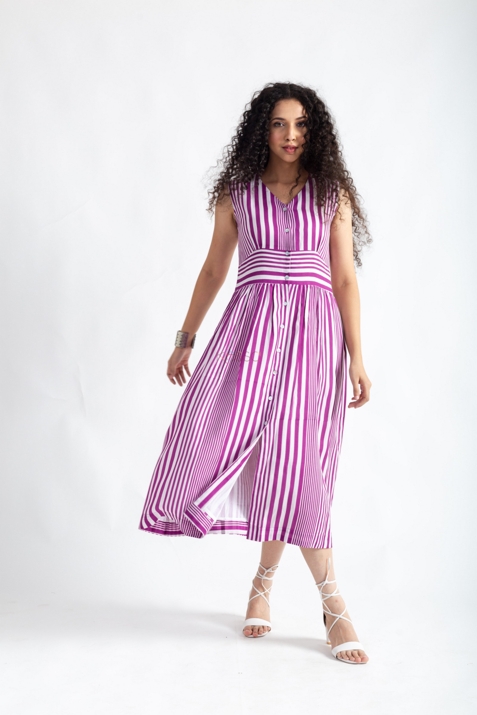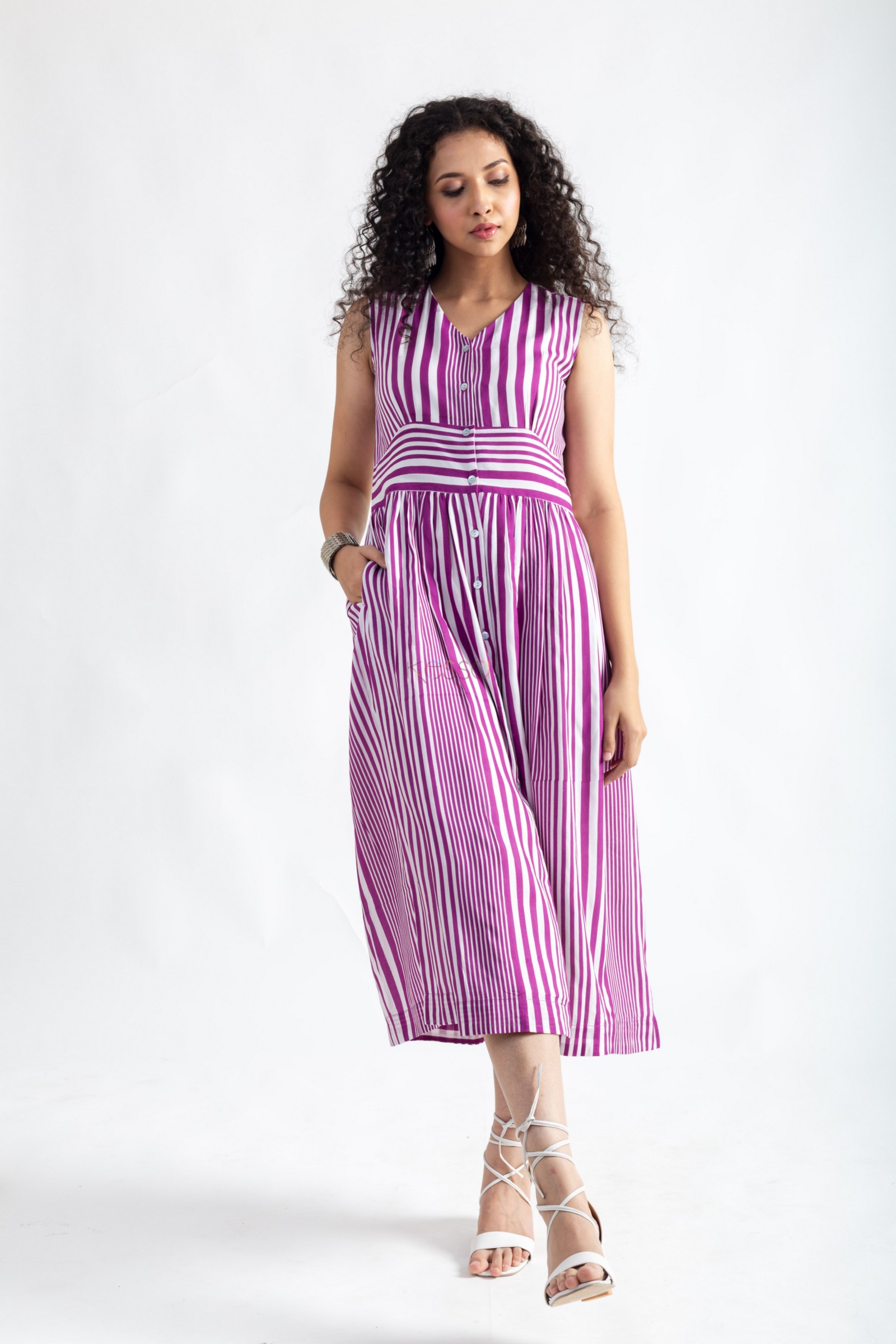 SKU: AVDAF232 The Modal Dress is a stunning purple dress with a V-neckline, sleeveless design, and shell buttons. Additionally, the dress comes with an inner lining, ensuring comfort and confidence. It features a practical one-side pocket, adding functionality to its chic and elegant look.