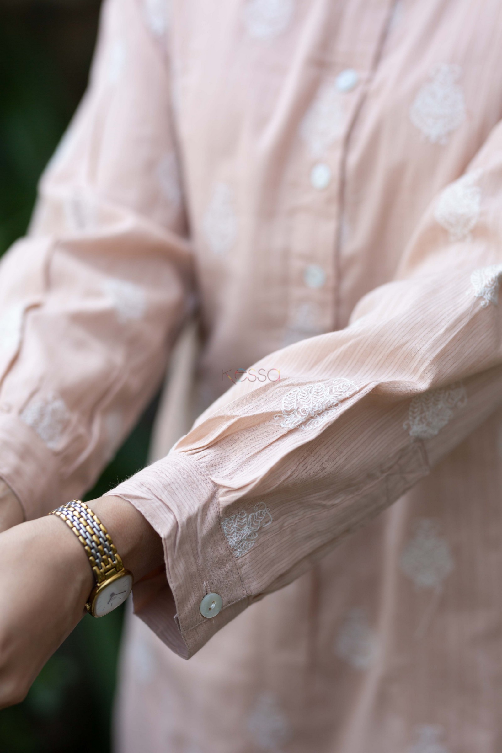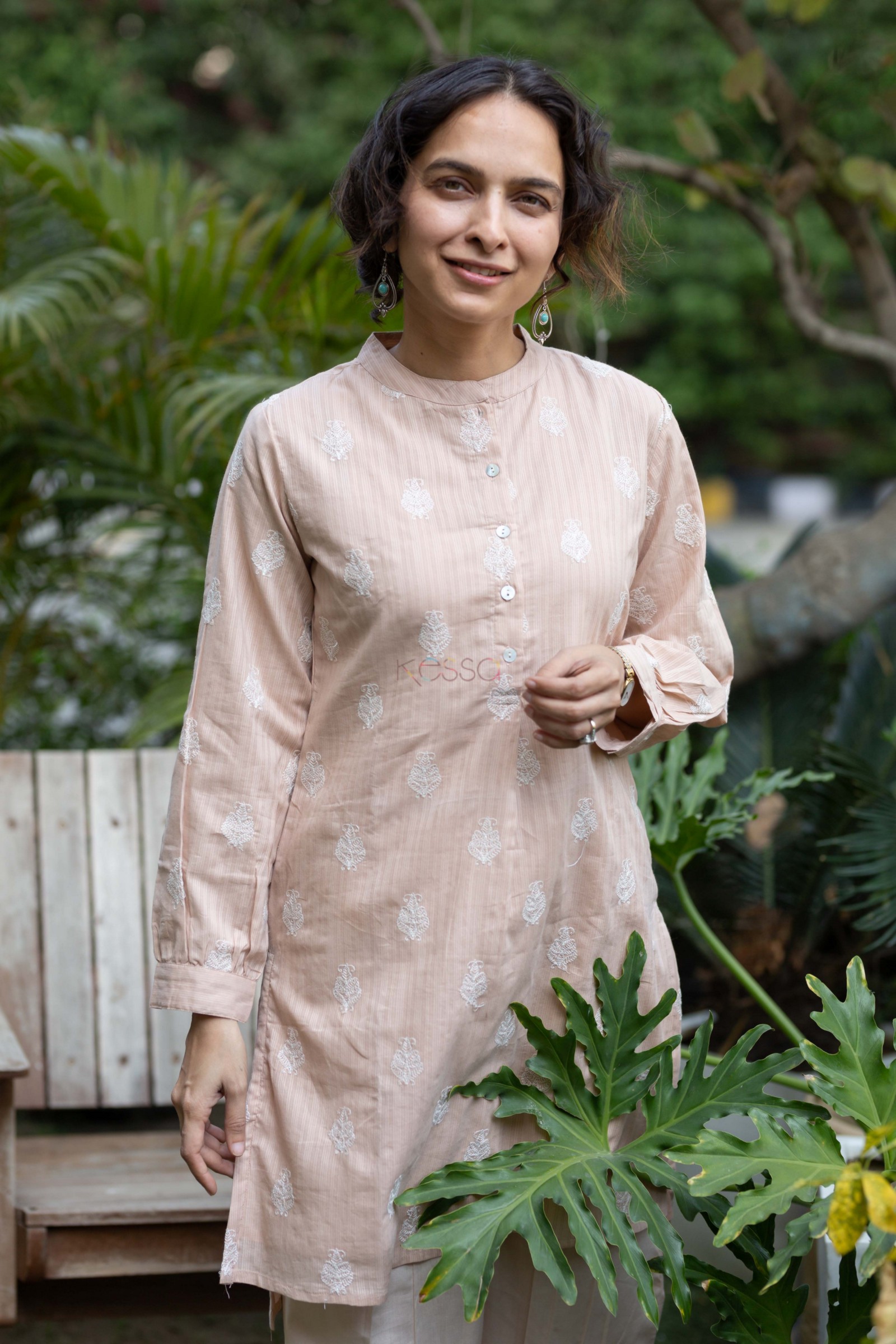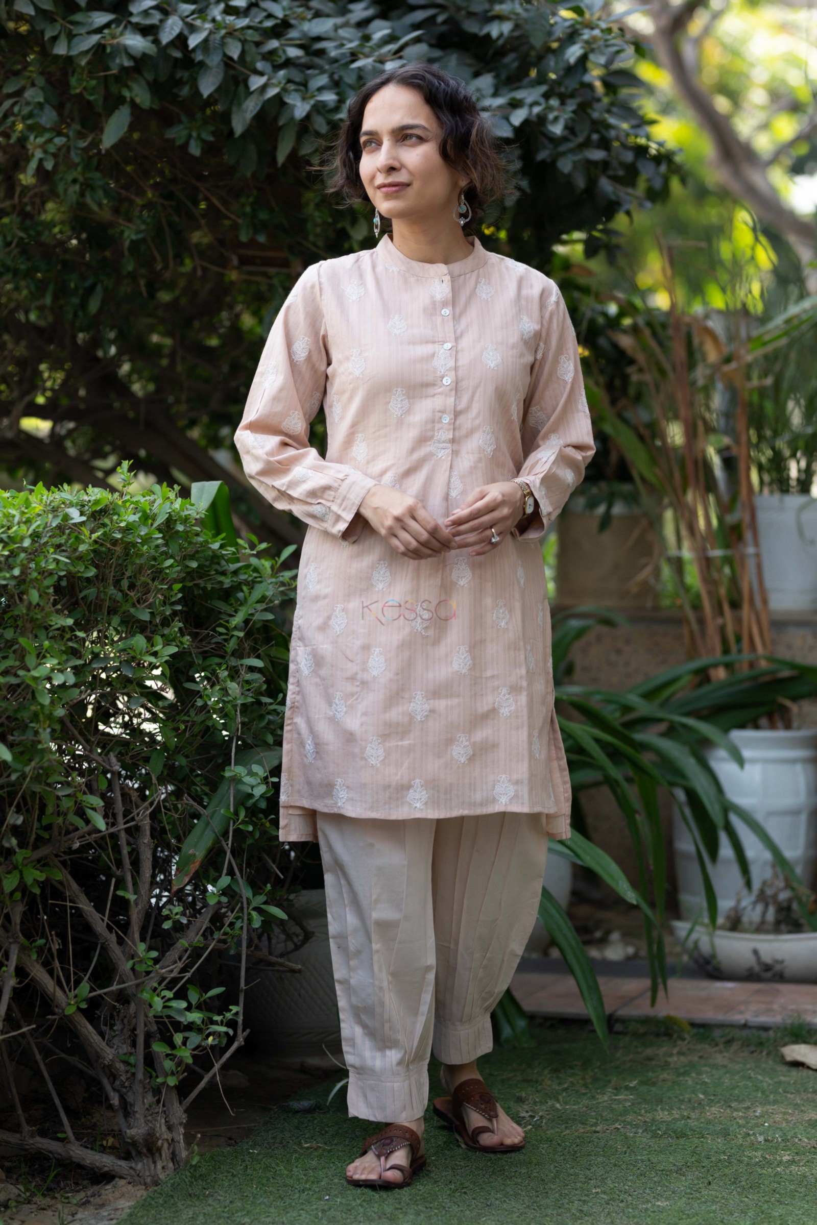 SKU: AVDAF240 This charming cotton straight fit kurta in a delightful light peach color is a perfect addition to your wardrobe. The kurta is beautifully adorned with intricate embroidery work, adding an elegant touch to its design. The shell buttons and collar neck enhance its sophisticated appeal, while the full sleeves offer comfort and versatility. Pair it with our crotia salwar for a cohesive look that exudes confidence.