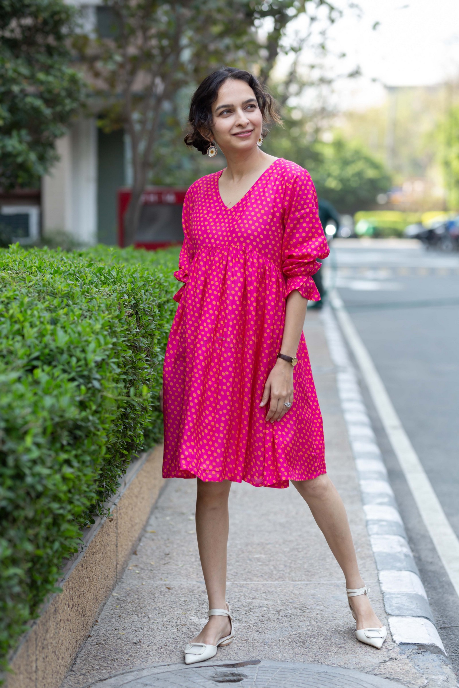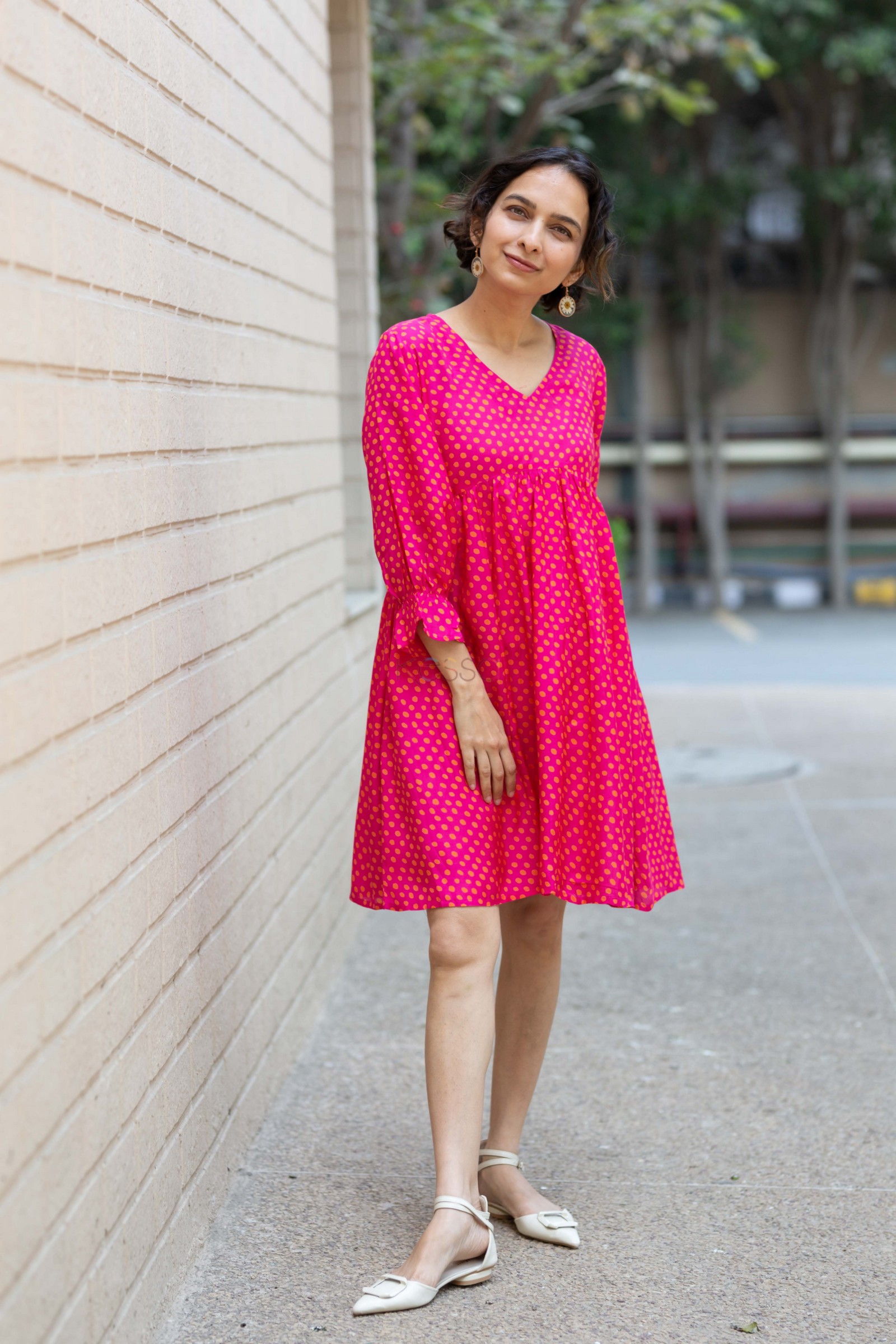SKU: AVDAF253 Experience the perfect blend of comfort and style with our Pink Muslin Dress. The dress features delicate pleats in the front, adding a touch of elegance to your look. Its 3/4th sleeves with elastic at the end ensure a flattering fit, while the charming polka dots print exudes a playful vibe. The V-shaped neck adds a hint of allure, making it a versatile and chic addition to your wardrobe.