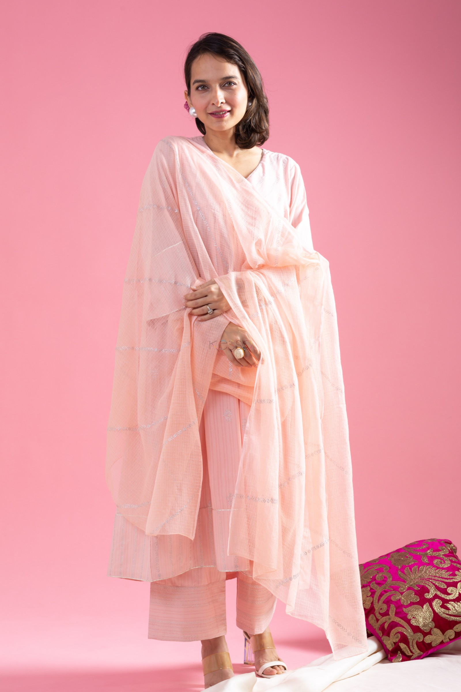 SKU: AVDAF264 Elevate your style with our exquisite cotton complete suit set in a soothing baby pink hue. Crafted from premium cotton dobby fabric, the set includes a charming kurta and plazo ensemble. The kurta, adorned with intricate khadi print and delicate gota lace, features a flattering V-neckline, graceful full sleeves, and a convenient one-sided pocket for added functionality. Complementing this is the plazo and dupatta, both elegantly highlighted with the same khadi print, adding a touch of traditional allure to the ensemble. With its fusion of comfort, sophistication, and artistic detailing, this set is a perfect choice for any occasion.