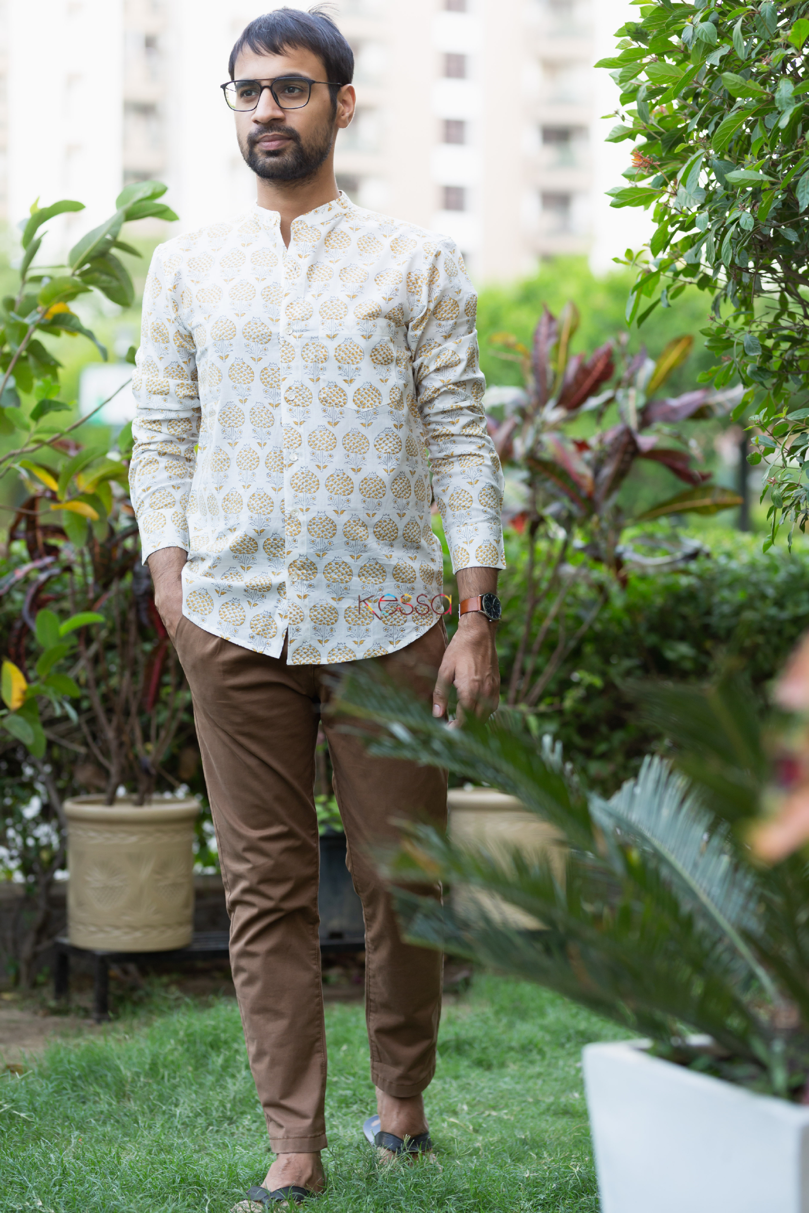 SKU: AWK45 Tailored out of 100% premium cotton, Gyanav offers breathable, airy comfort all day long. The stunning white base cotton is lit up with contrasting brown hand block printed motifs. The comfortable Full sleeves, chest pocket, and chinease collared neckline add to the classic appeal of Gyanav.