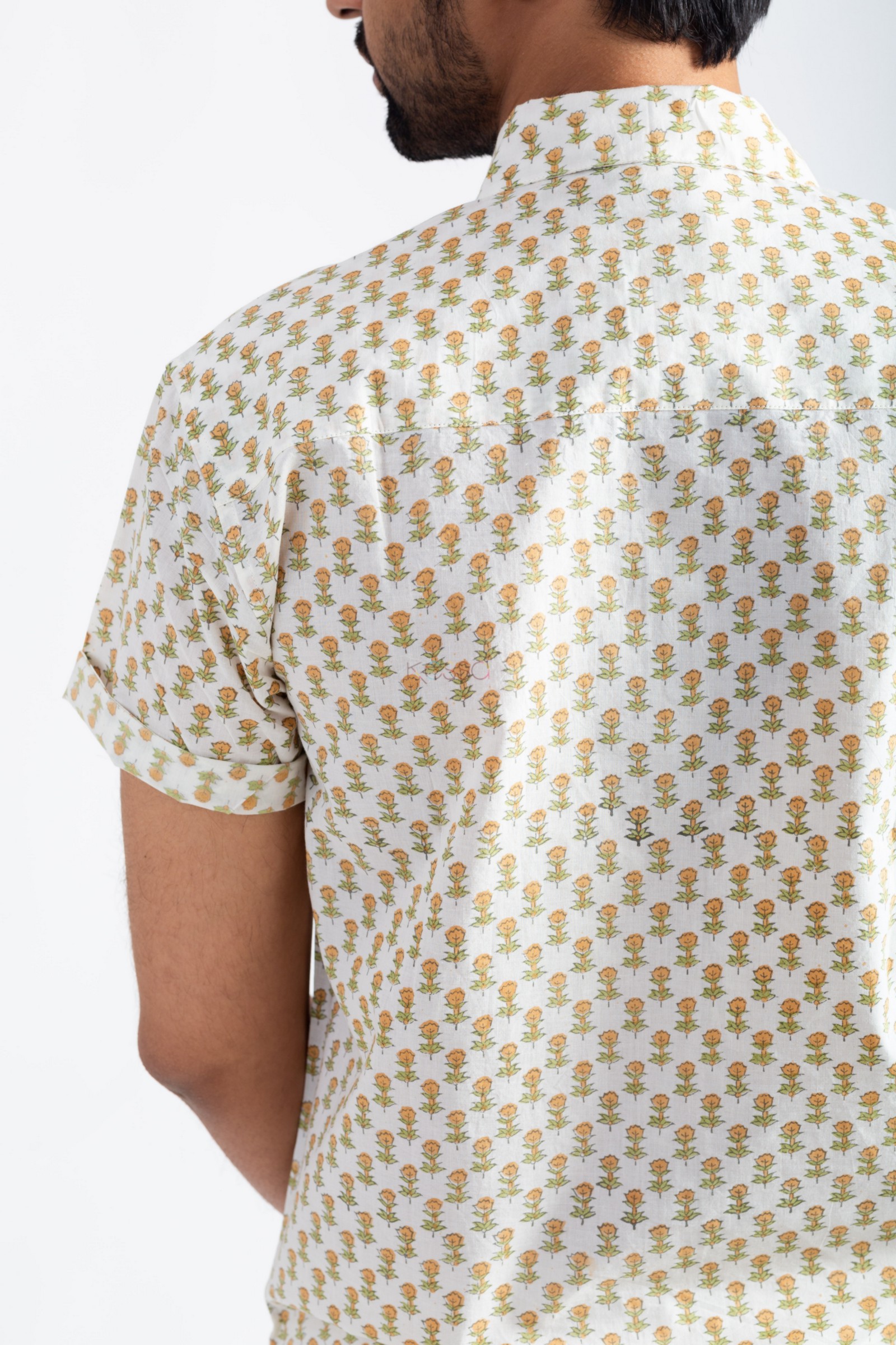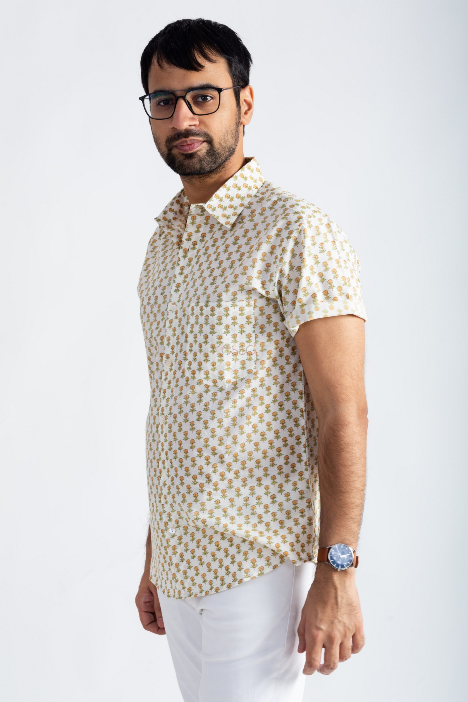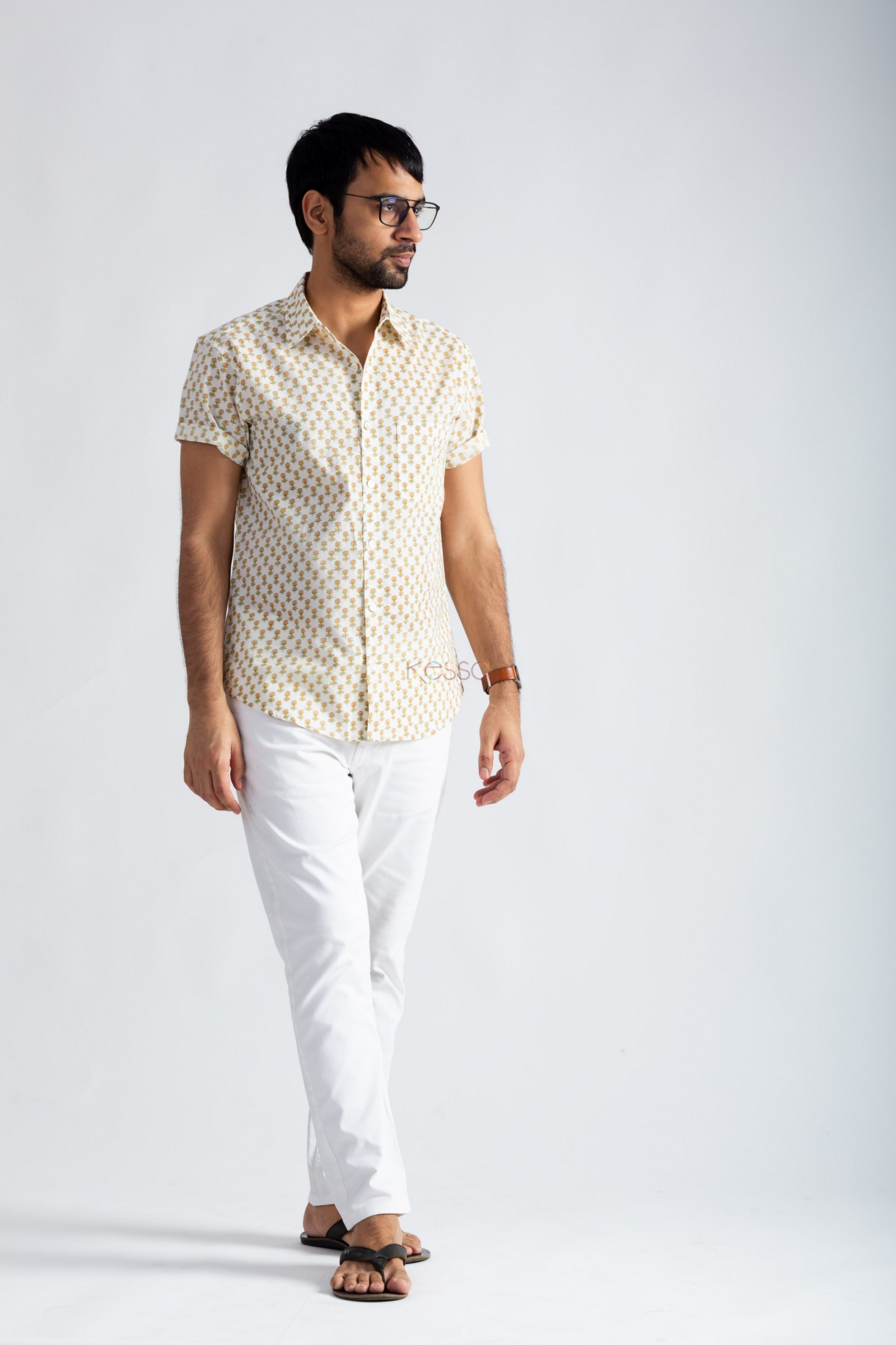 SKU: AWK67 The Cotton Half Sleeves Shirt in off-white with booti print is a timeless and versatile addition to your wardrobe. The shirt features a beautiful handblock print with intricate booti designs, adding a touch of traditional elegance. With a collar neck and half sleeves, this shirt offers a stylish and comfortable fit. The buttons in the front not only serve as functional closures but also add a subtle accent to the design. Made from soft and breathable cotton fabric, this shirt ensures all-day comfort. Elevate your style with this effortlessly chic and versatile cotton shirt.