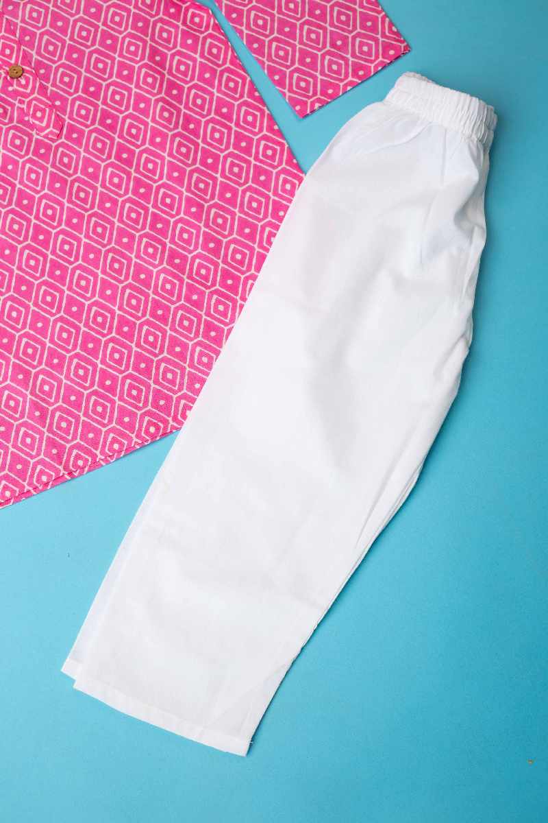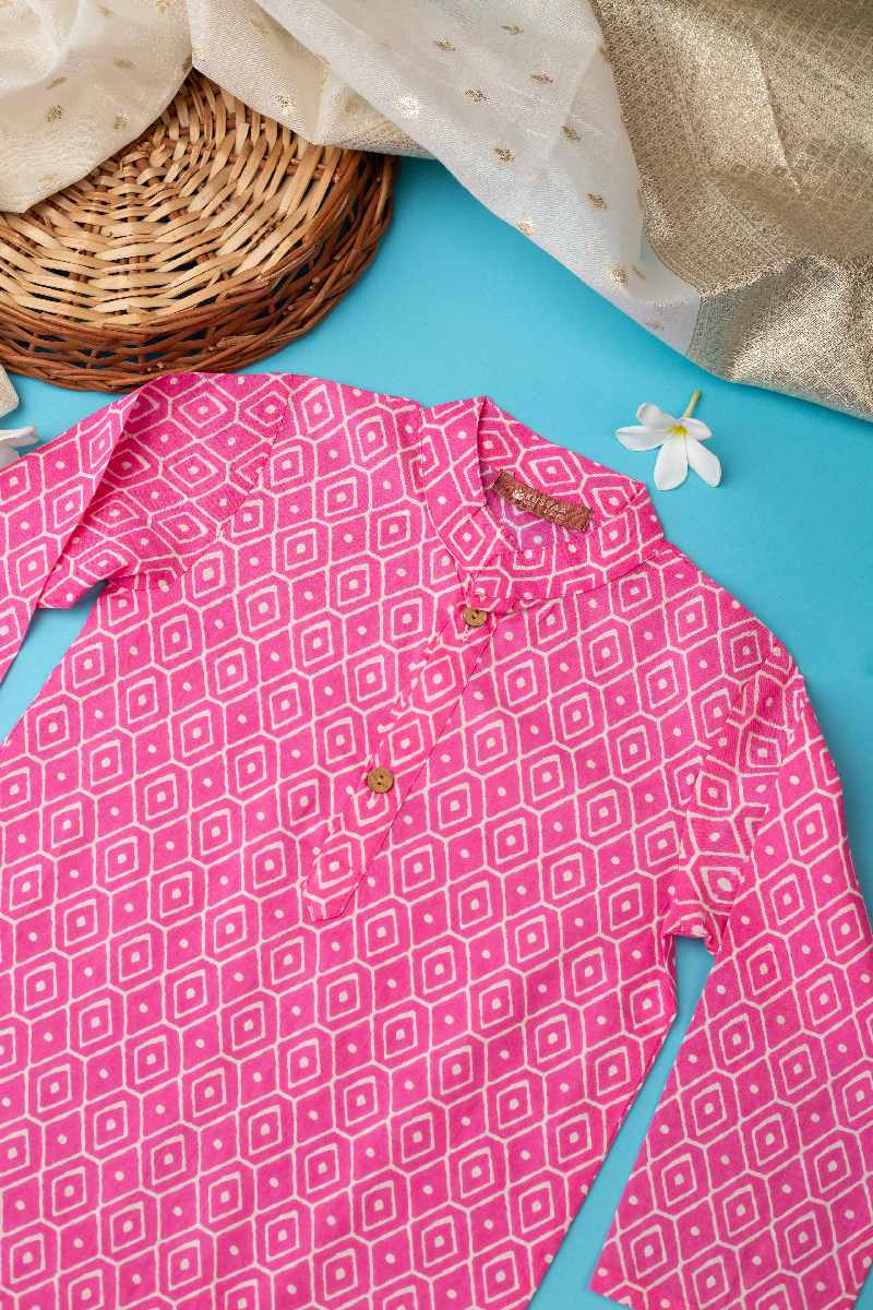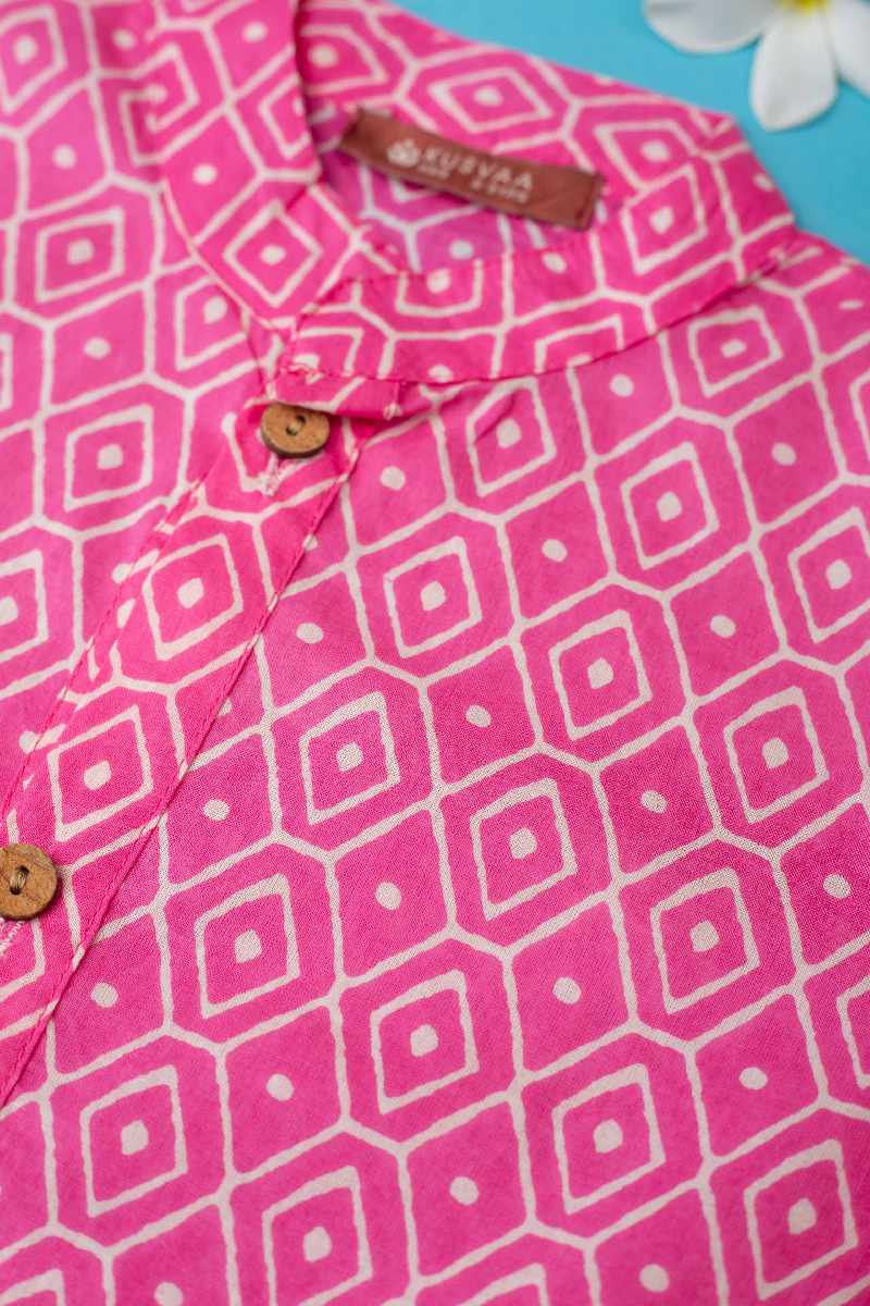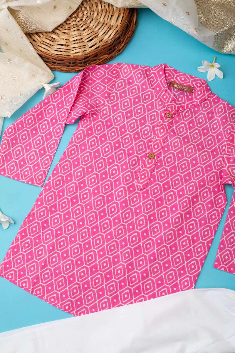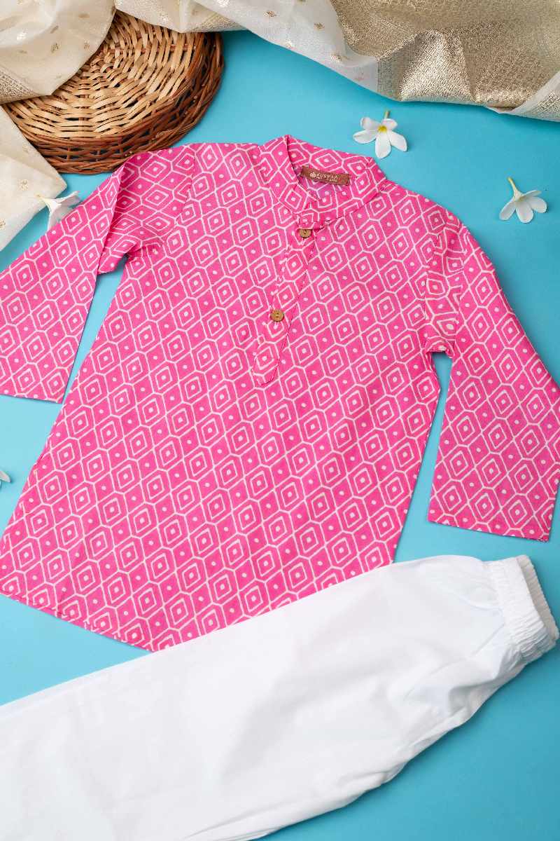 SKU: BYW017 This cotton boys’ kurta pant set in a refreshing pink color is perfect for festive occasions. The kurta features a charming printed design, collar neck with wooden button detailing, and full sleeves, adding a touch of elegance. Paired with a comfortable white pant with an elastic waistband, this set combines style with comfort for young ones.