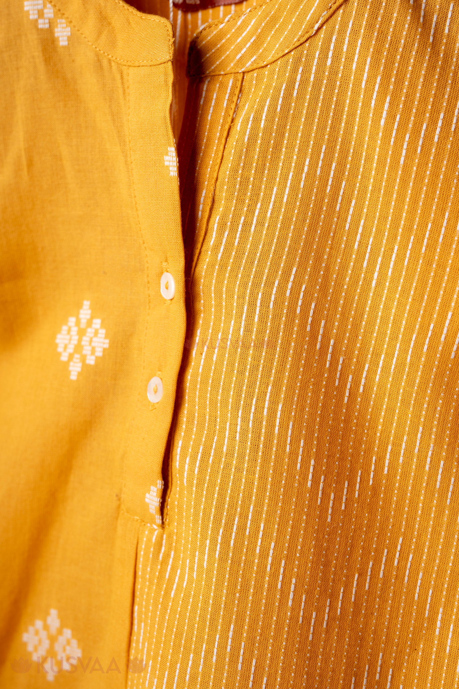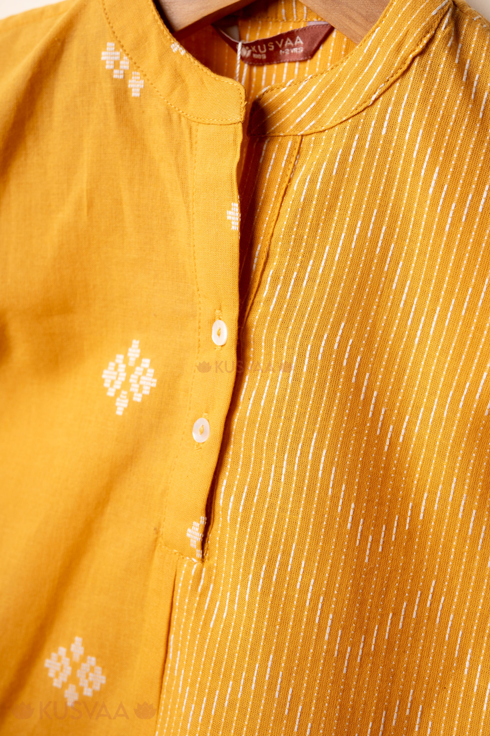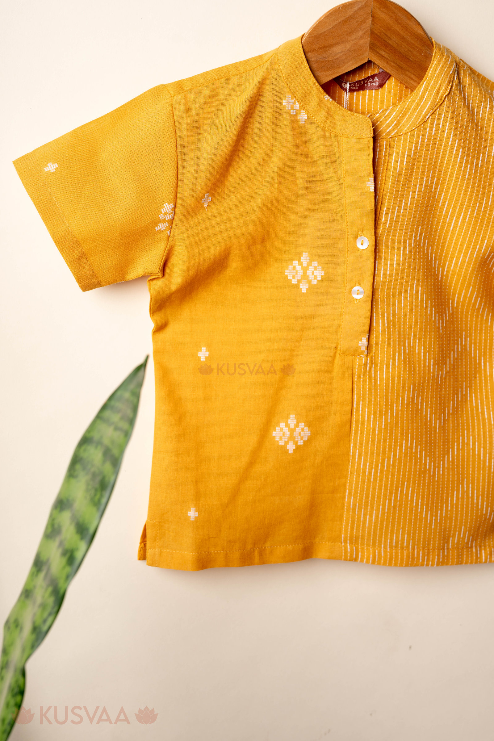 SKU: BYW071 This stylish handloom cotton boys shirt comes in a bright mustard yellow color with subtle traditional woven motif work and a contrasting striped panel in the front. Designed with a smart mandarin collar neck and comfortable half sleeves, it gives a neat ethnic look. The side cut detail adds ease of movement, making it perfect for festive and casual wear.