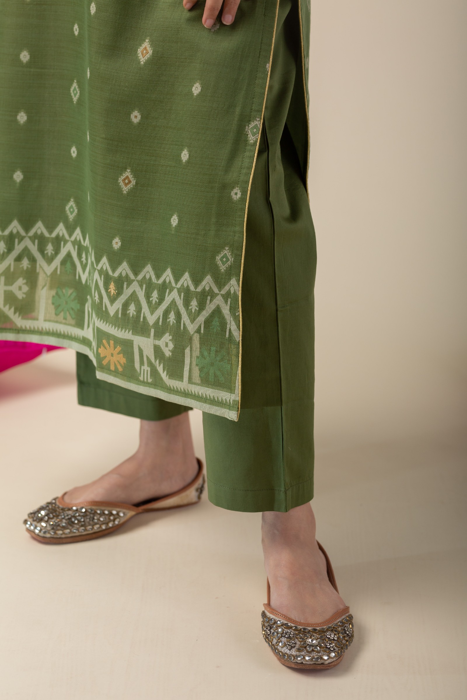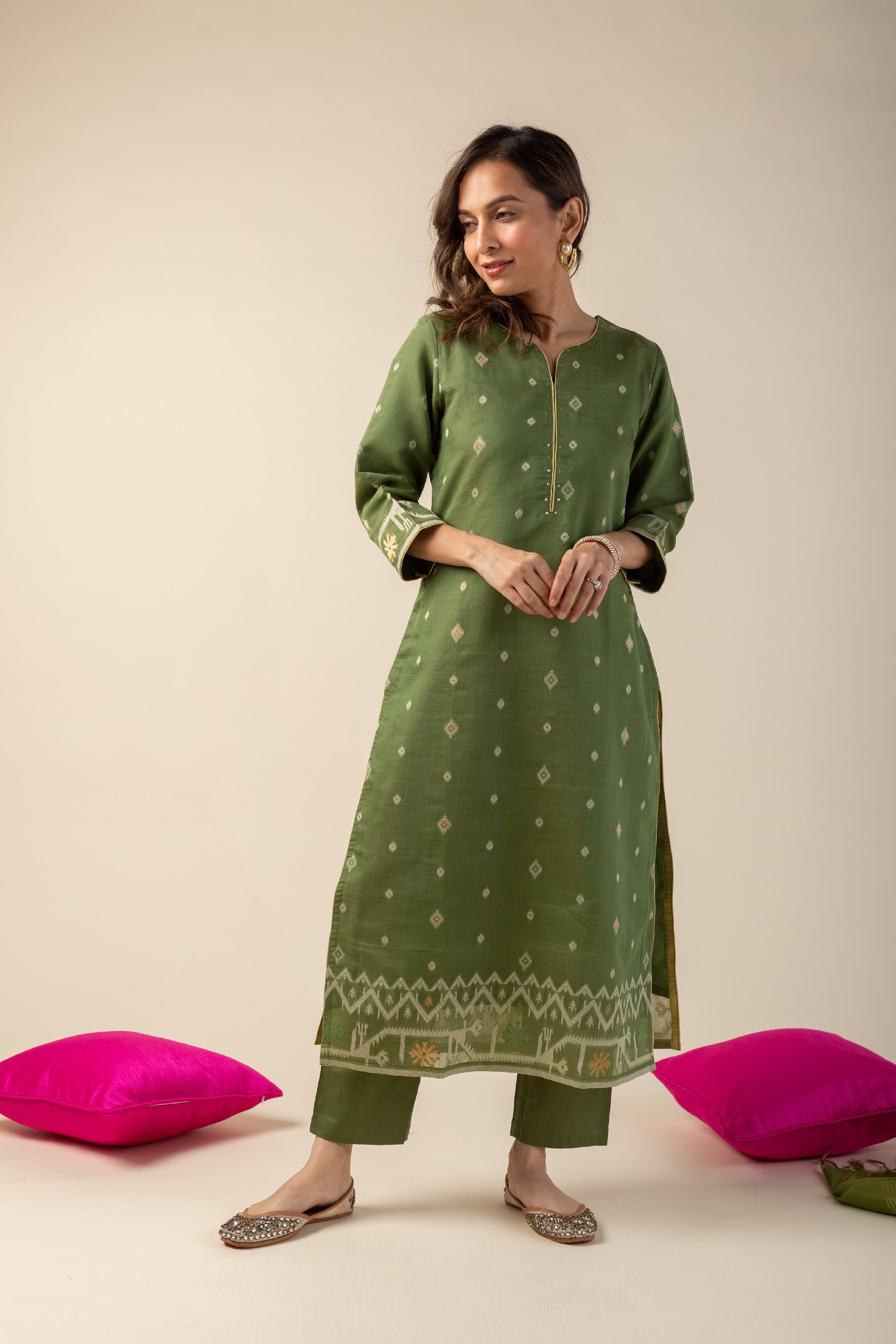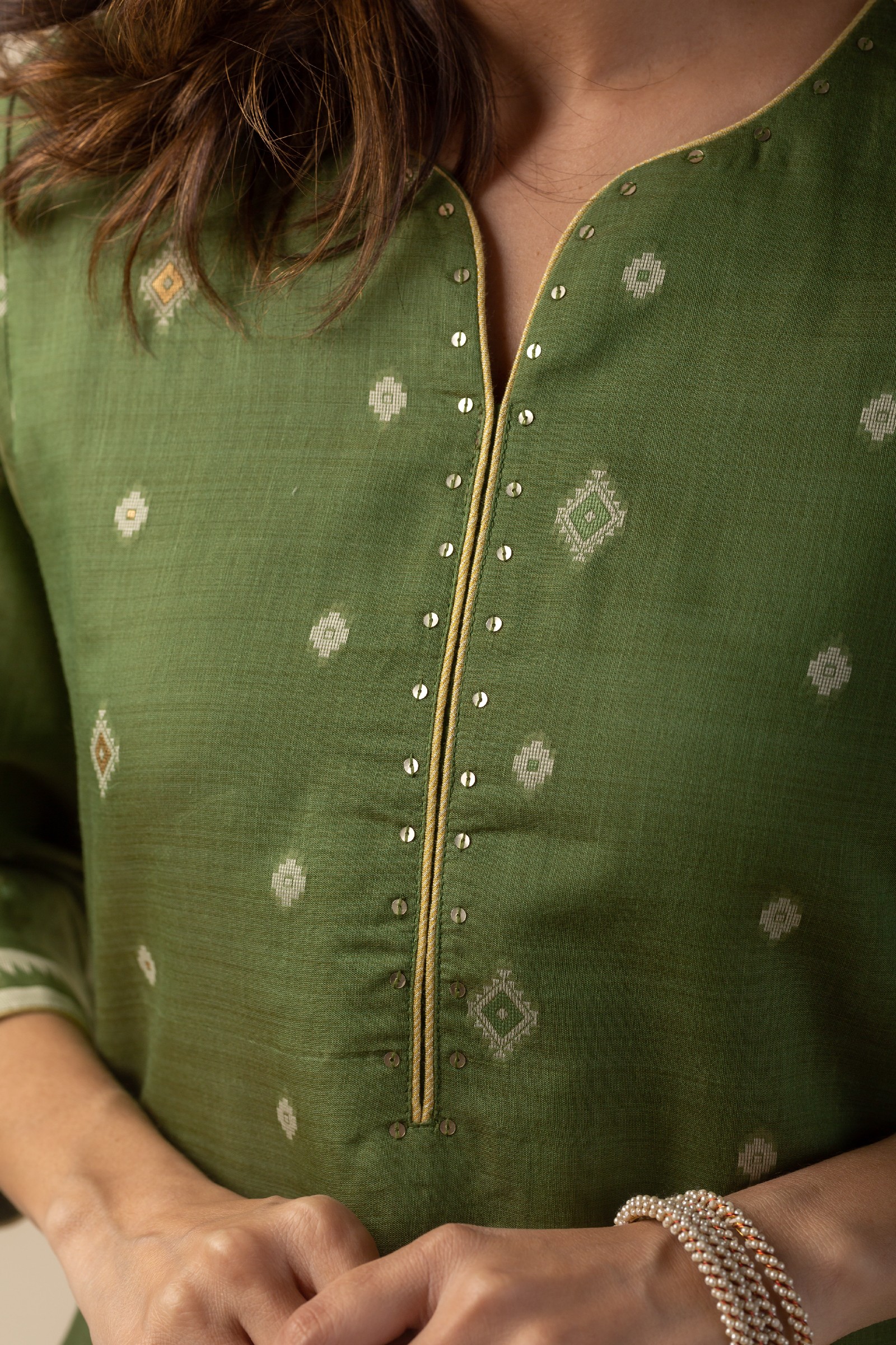 SKU: COOD010 This elegant Chanderi jamdani kurta pant set in a refreshing green color features a V-neck design with a yoke highlighted by delicate sequin work and piping details. The kurta comes with comfortable 3/4th sleeves and a soft cotton lining, ensuring breathability and ease. Paired with matching cotton silk pants with a back elastic waistband, this set combines style and comfort effortlessly, making it perfect for any occasion.