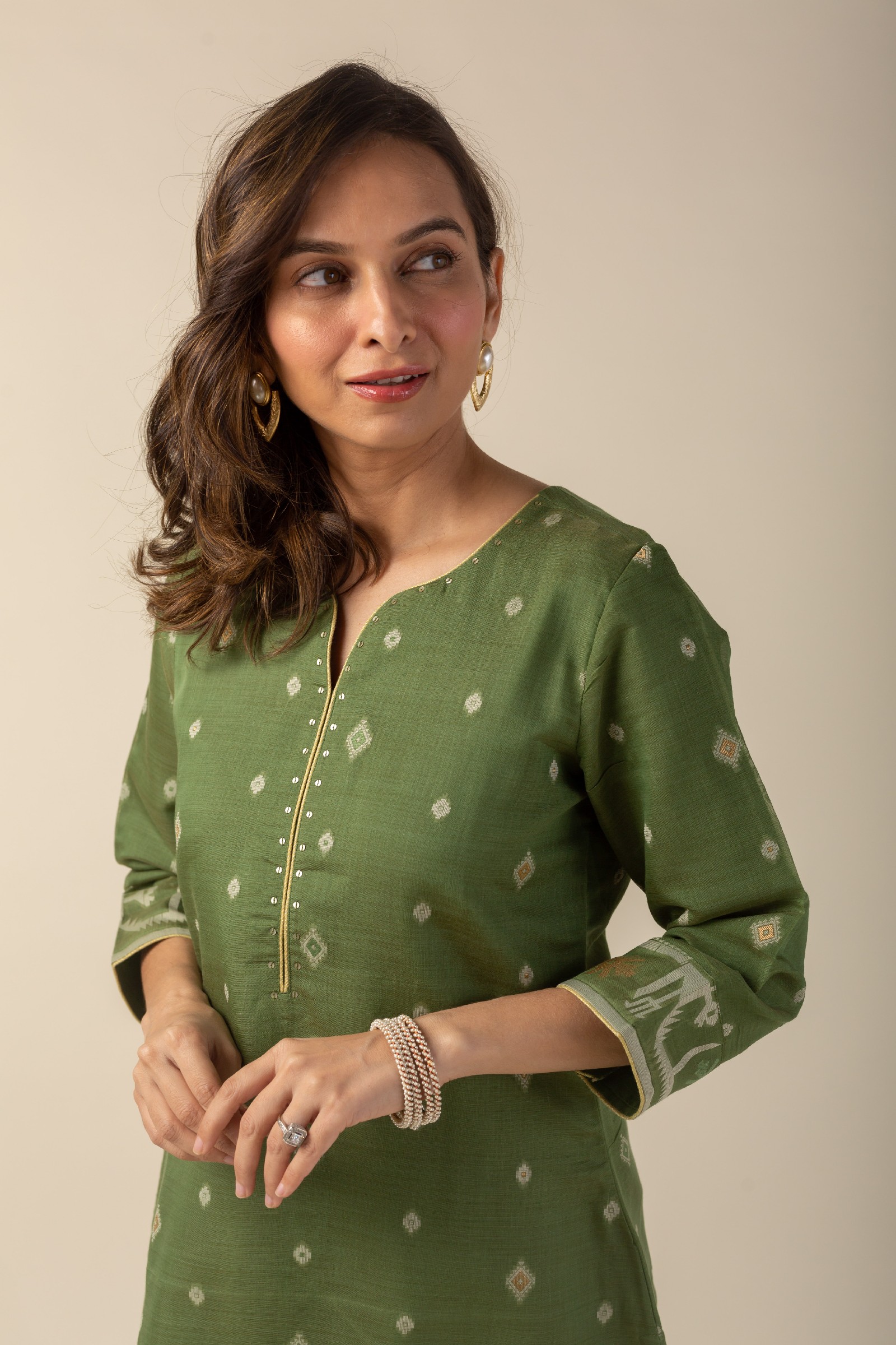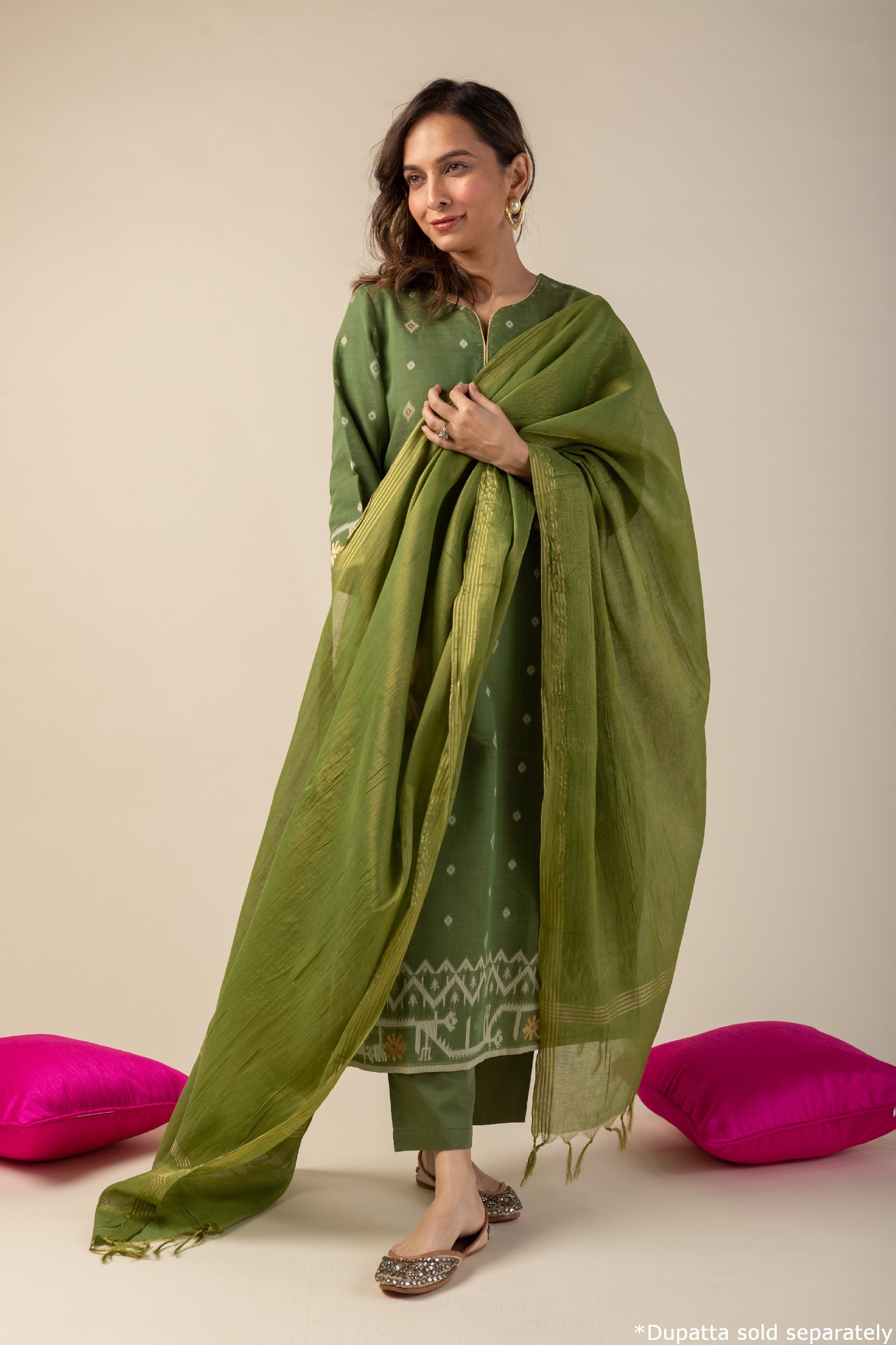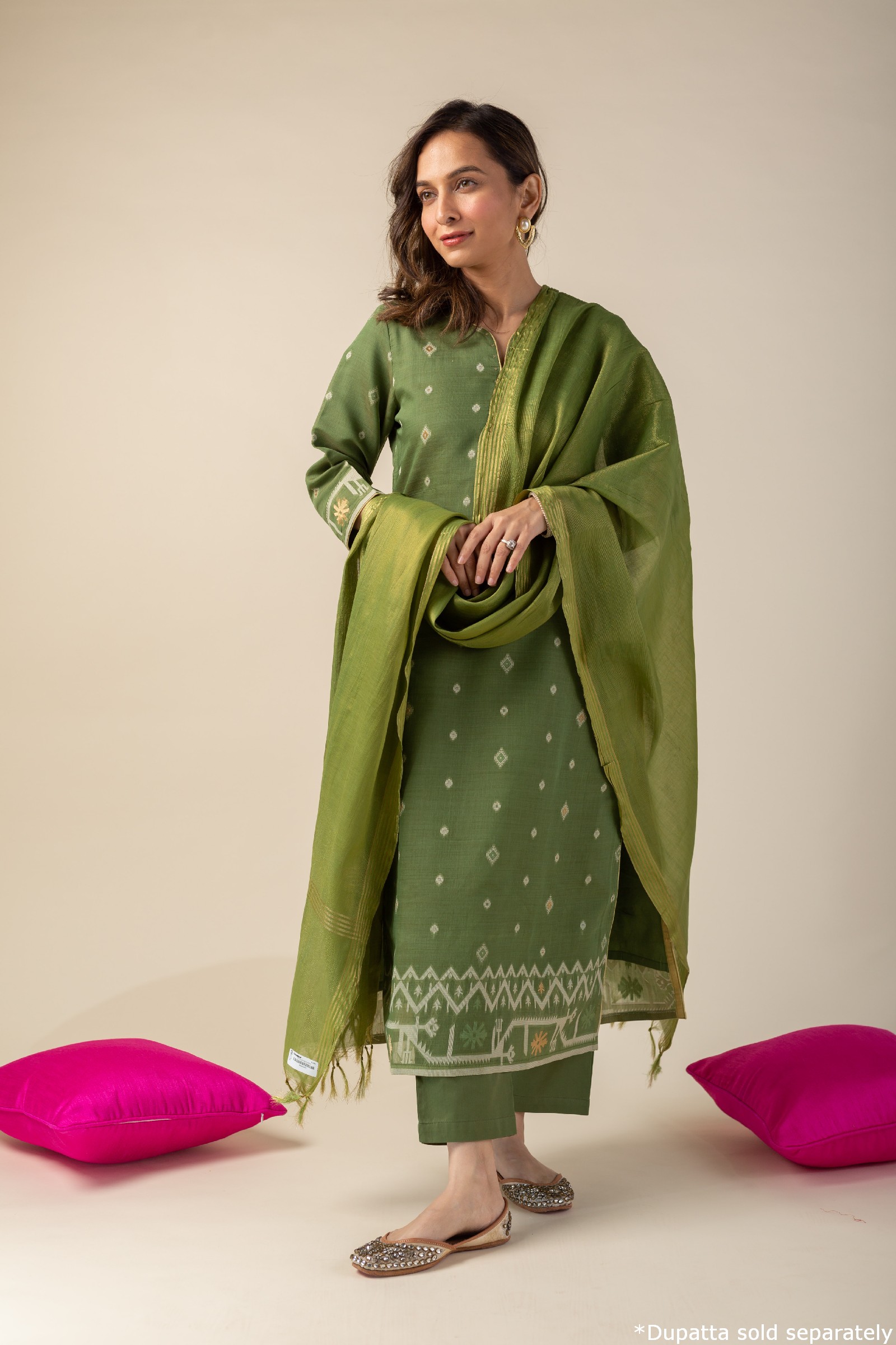 SKU: COOD010 This elegant Chanderi jamdani kurta pant set in a refreshing green color features a V-neck design with a yoke highlighted by delicate sequin work and piping details. The kurta comes with comfortable 3/4th sleeves and a soft cotton lining, ensuring breathability and ease. Paired with matching cotton silk pants with a back elastic waistband, this set combines style and comfort effortlessly, making it perfect for any occasion.