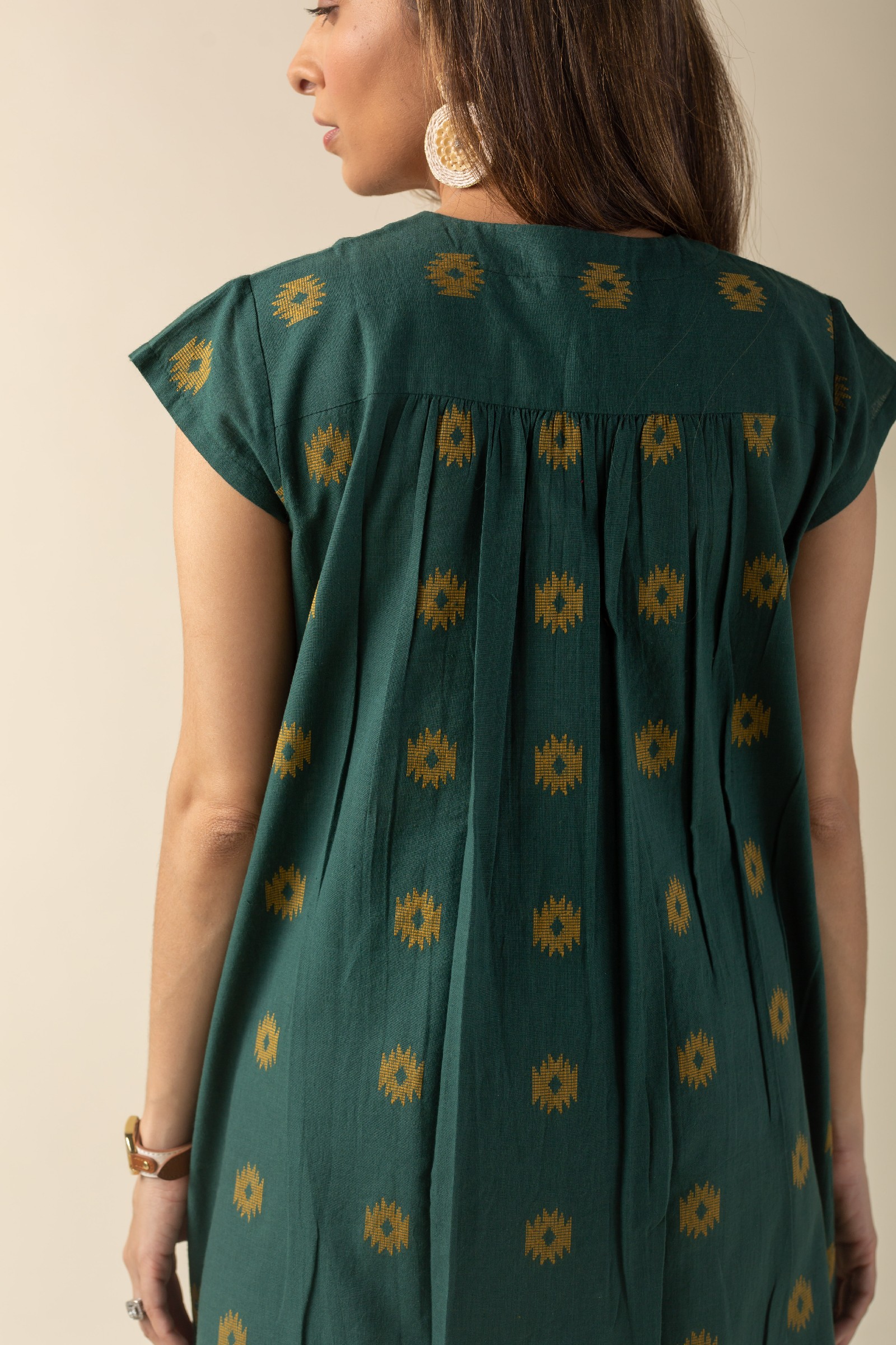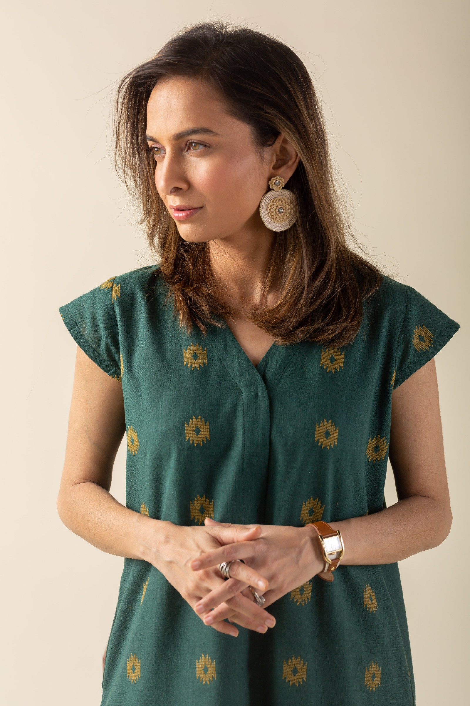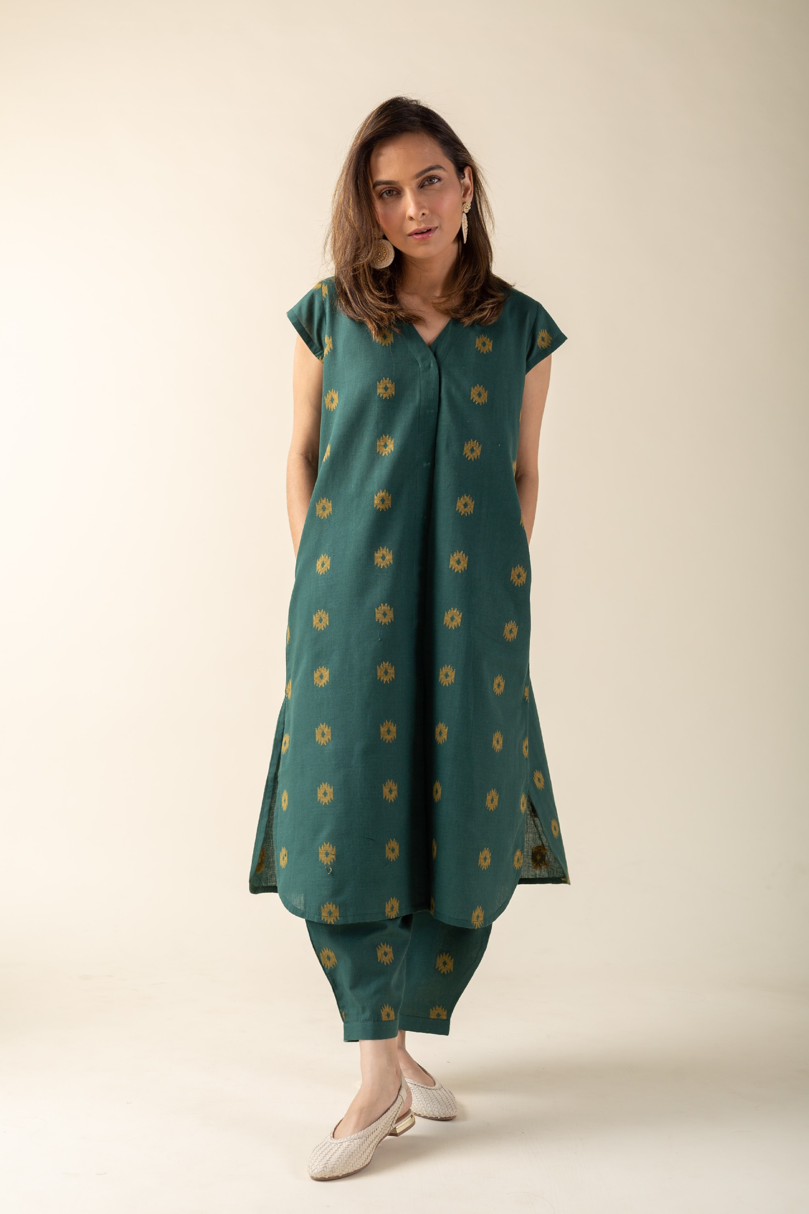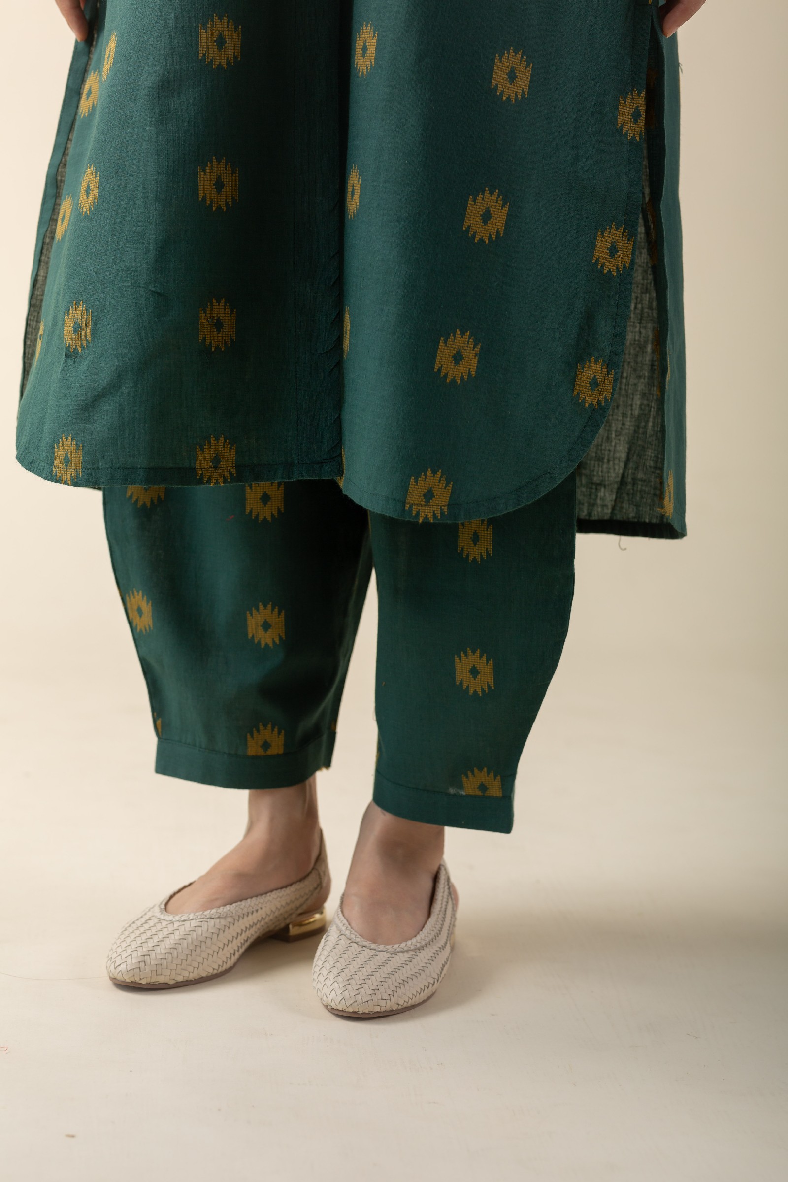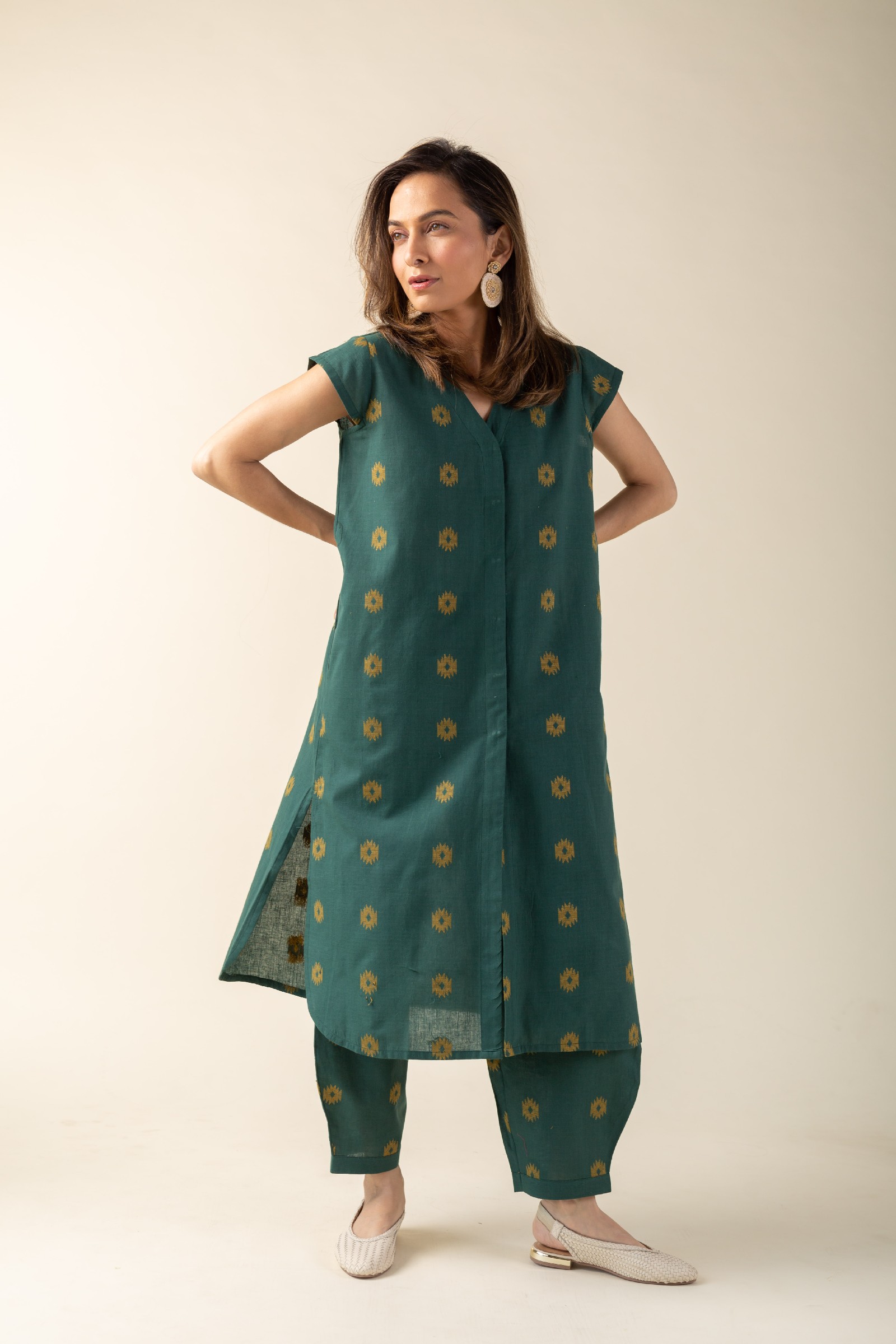 SKU: COOD026 This handloom cotton kurta pant set in green features intricate weave work for a subtle yet elegant look. The kurta has a V-neck, half sleeves, and front hook closure, offering both style and comfort. With a loose fit and pockets on both sides, it’s practical and easy to wear. The matching pants have a back elastic for added flexibility, making this set perfect for a relaxed yet chic look.