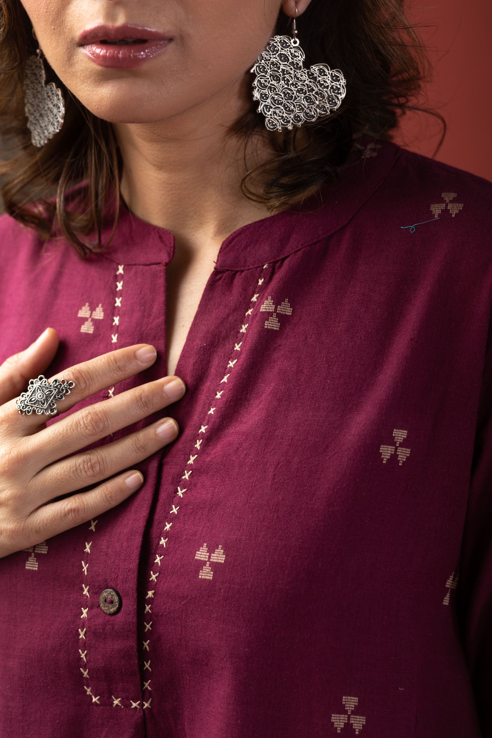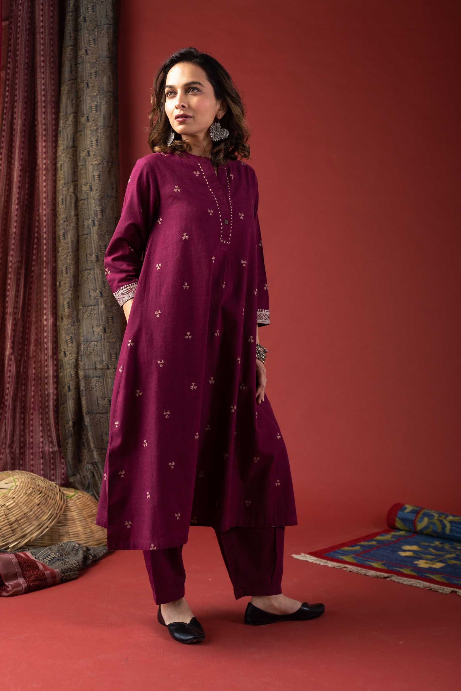 SKU: COOD044 This wine-colored cotton handloom ensemble features intricate weave and thread work, adding elegance to its timeless design. The kurta has a classic collar neck, 3/4th sleeves with a border, and a practical side pocket. Paired with matching pants featuring a comfortable back elastic, this outfit is perfect for effortless style and comfort.