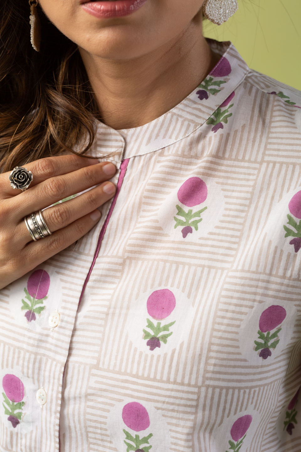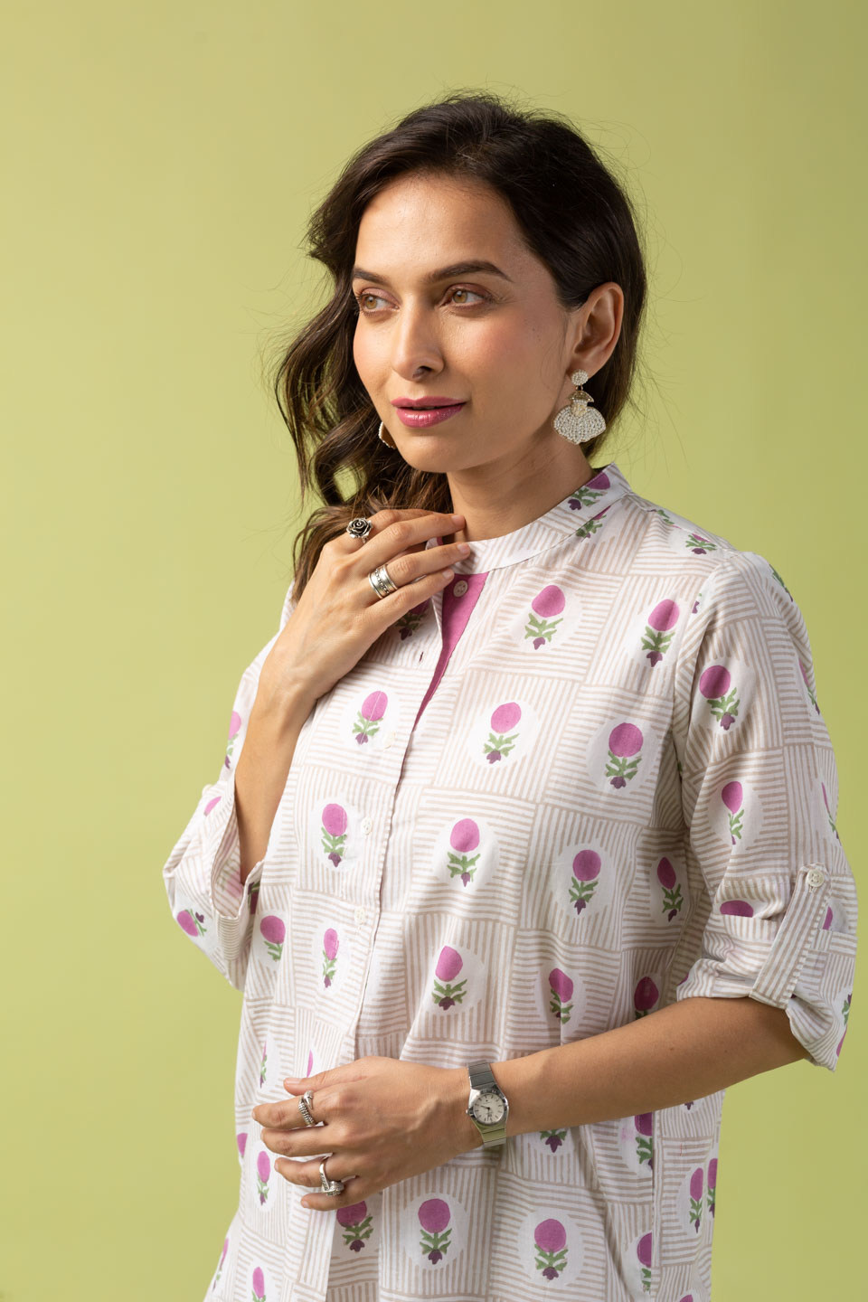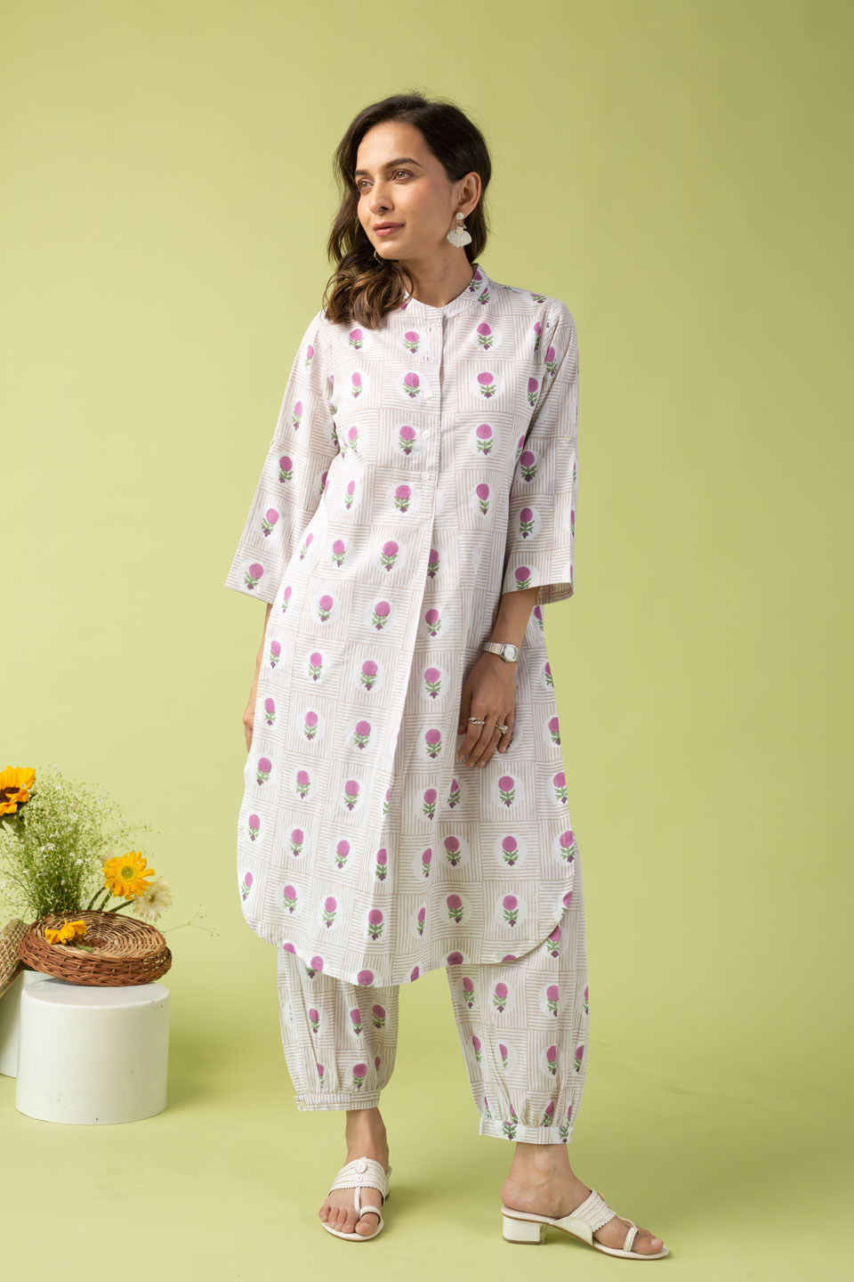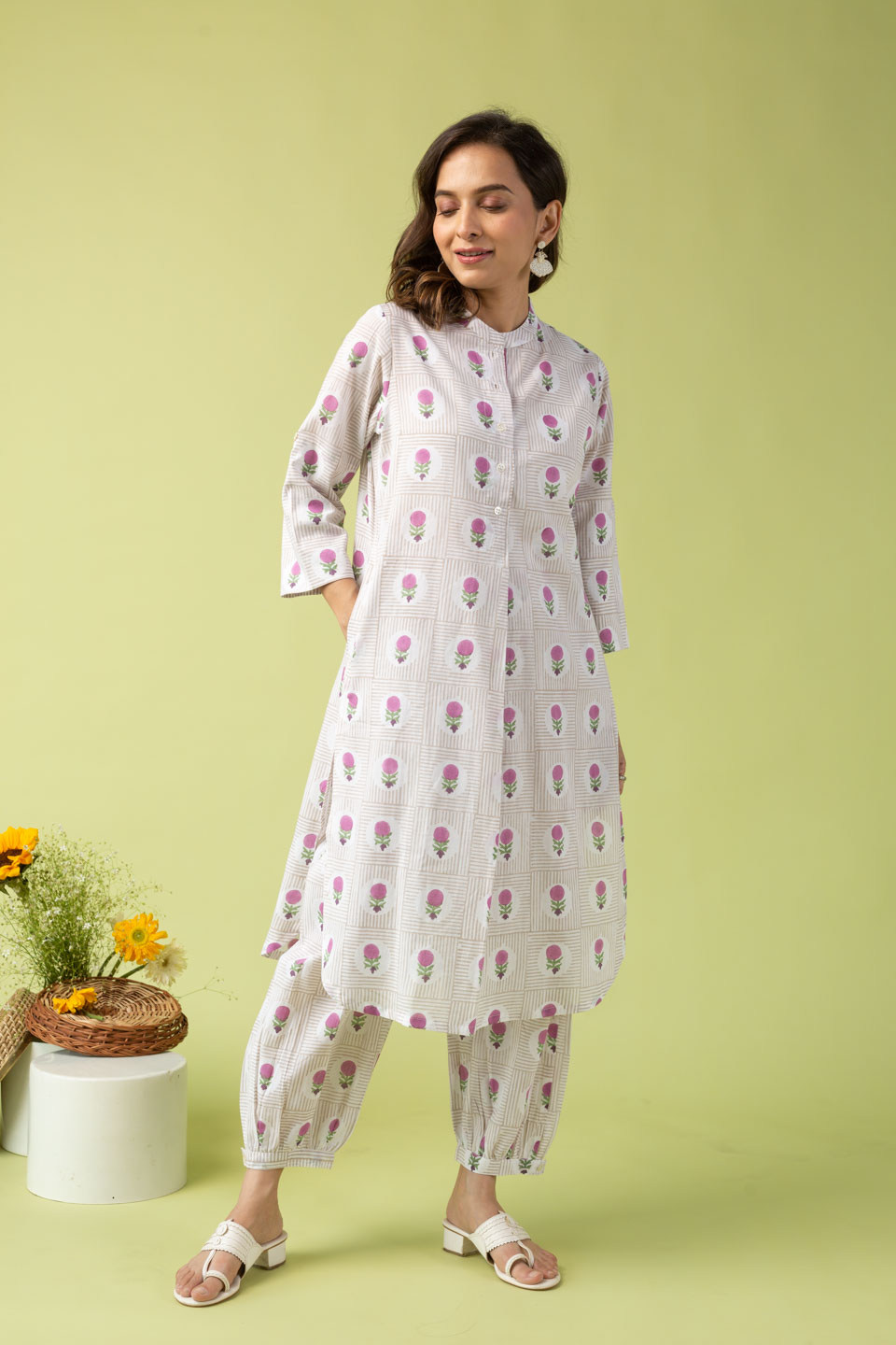 SKU: COOD076 This stylish cotton co-ord set in off-white features a vibrant multi-color block print, exuding a blend of elegance and comfort. The collared neckline, yoke, and 3/4th sleeves are highlighted with delicate shell buttons for a refined touch. The matching pants come with a back elastic and front dori for a perfect fit, while both side pockets add practicality to this chic ensemble.