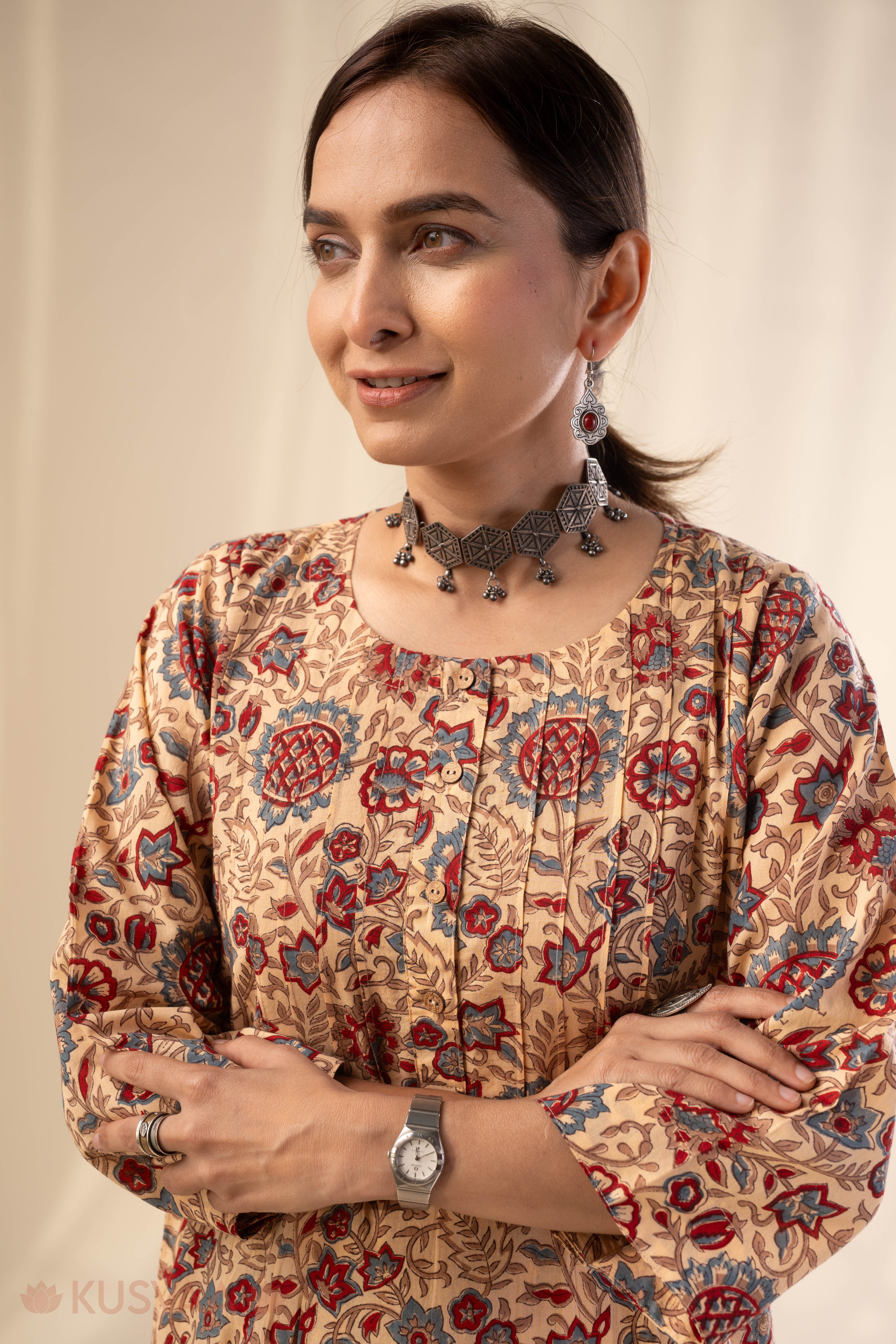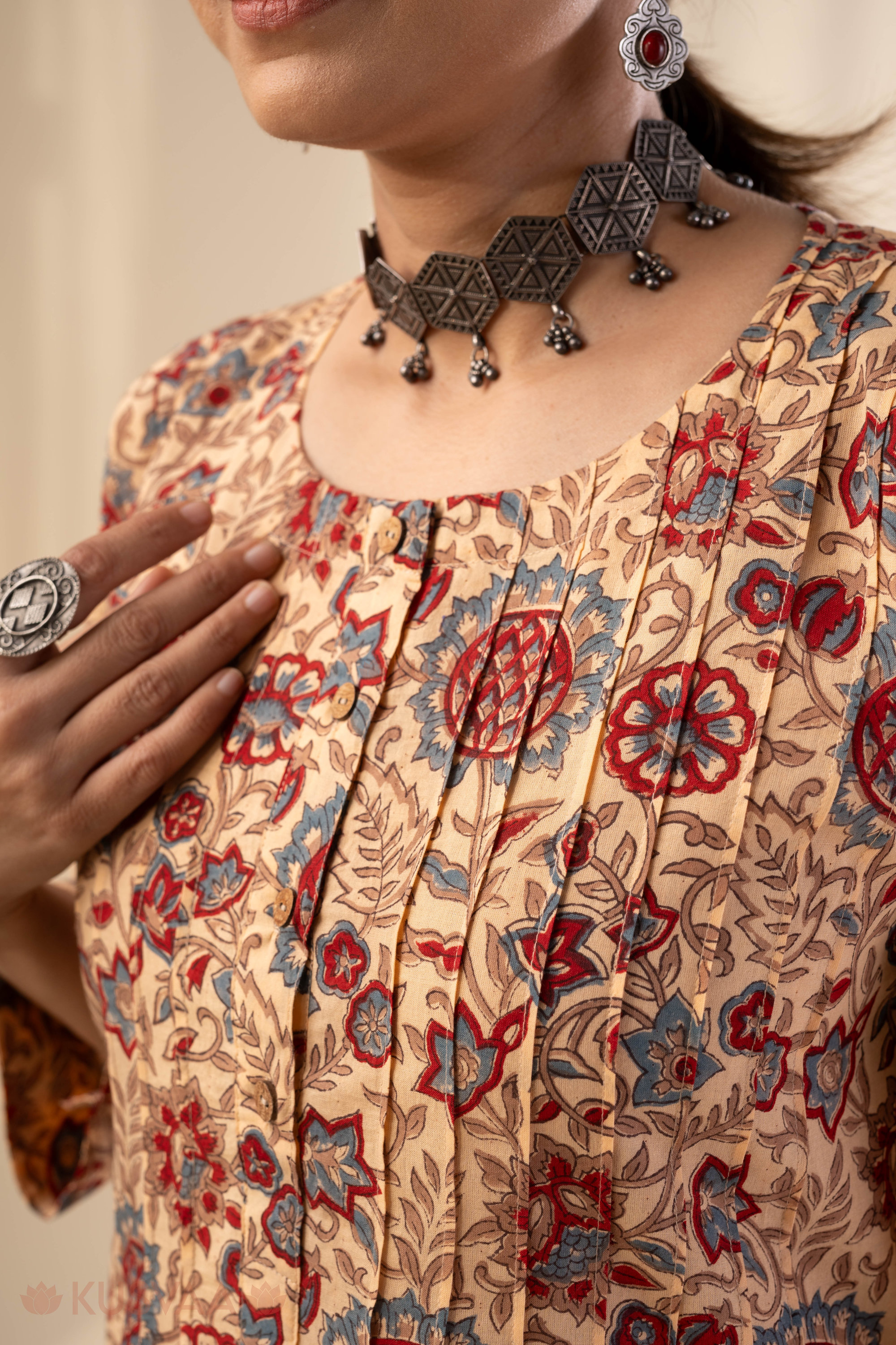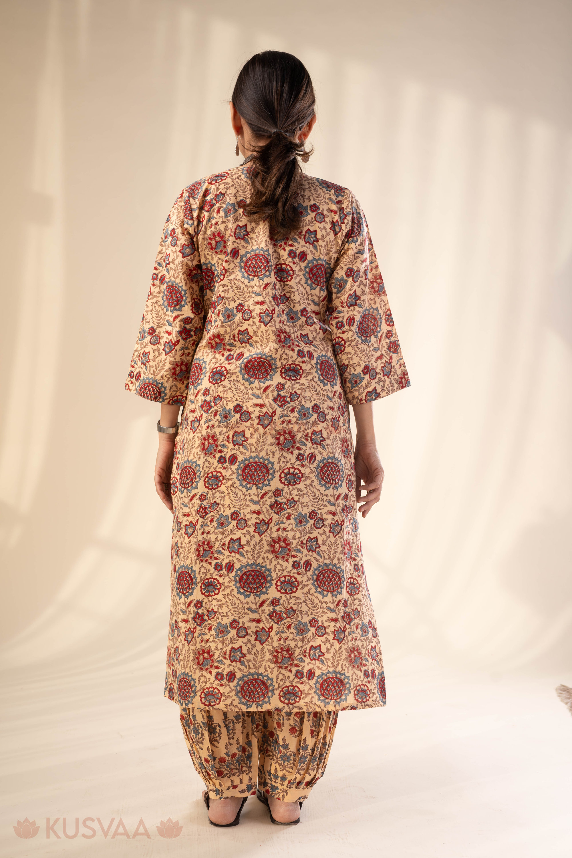 SKU: COOD140 This elegant cotton handblock kurta set comes in a soft beige base adorned with traditional floral block prints in rich red and muted blue tones. The kurta features subtle front pleat detailing with fine thread work, a classic round neckline, and comfortable 3/4th sleeves for an easy everyday look. Styled in a straight, relaxed silhouette with a practical one-side pocket, it blends comfort with ethnic charm. It is paired with a matching salwar featuring an elastic waistband for a perfect fit and all-day ease.