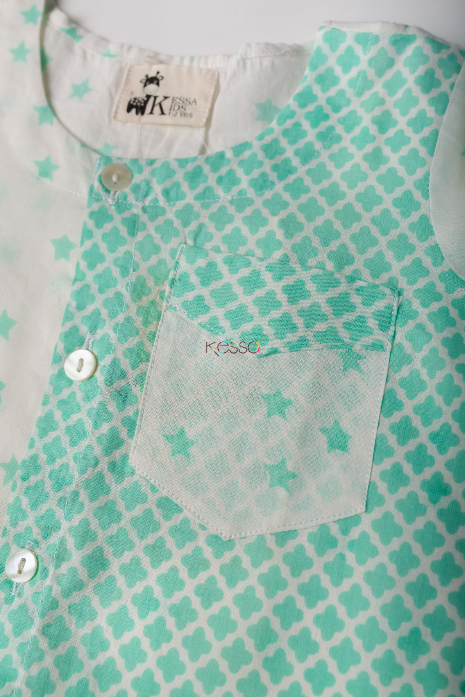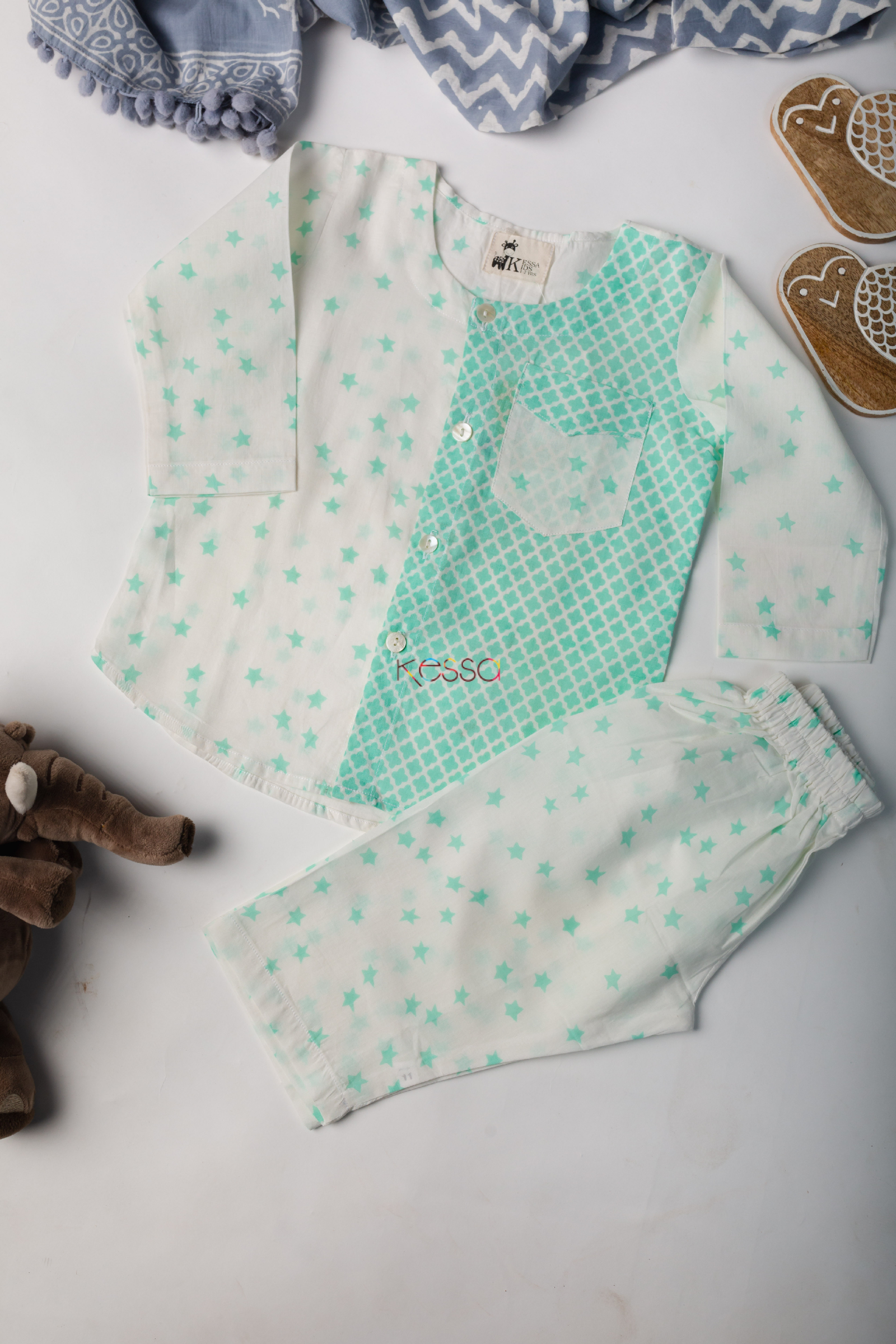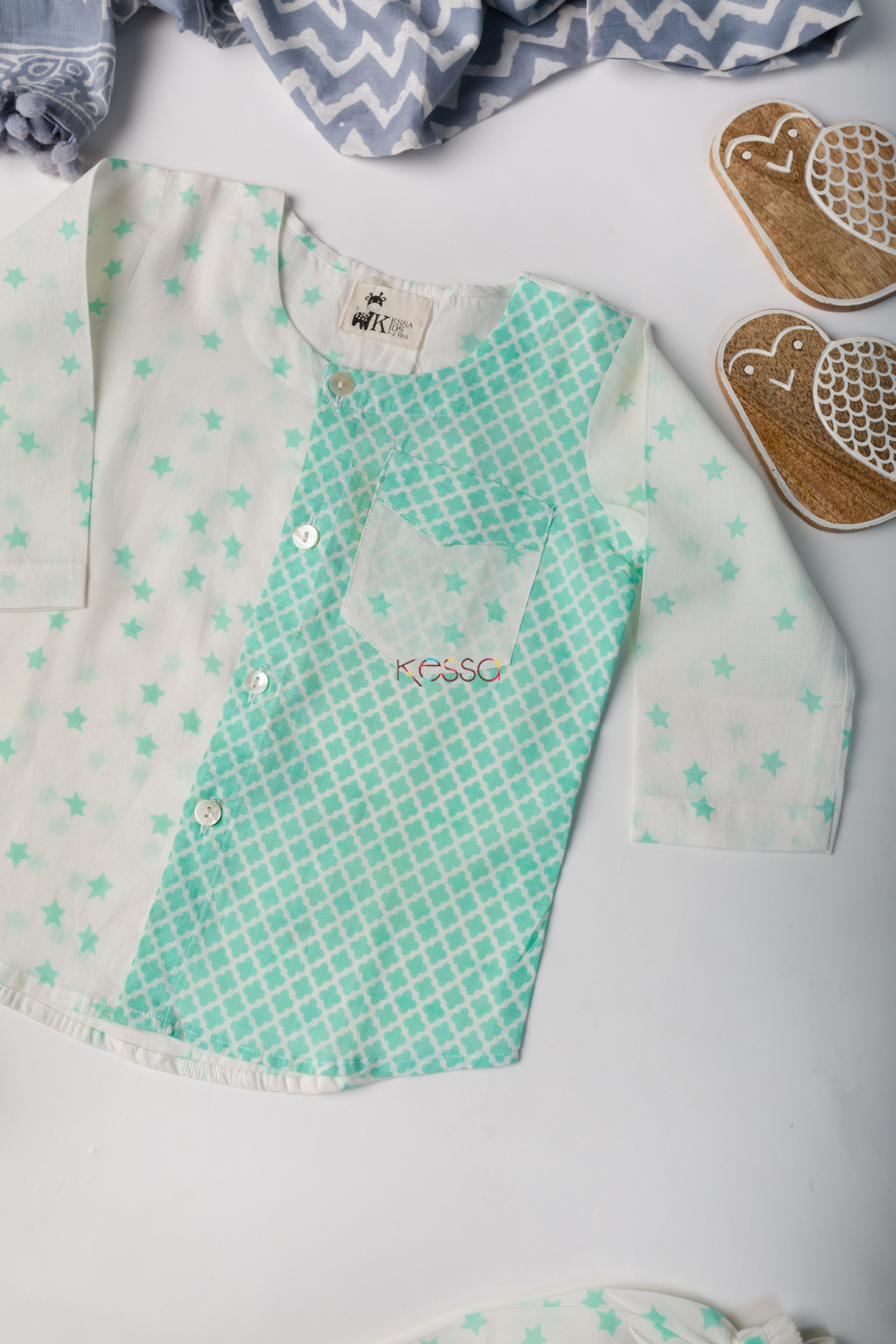 SKU: DEK36 Made out of the softest weave of cotton, Tabrid promises the gentlest touch of love on your baby’s skin. The contemporary kurta features a half-and-half style with a bright baby blue oriental print on one side. And, a white side with blue stars. The Pajama features the same starry print. The full sleeves, classic round neck, and chest pocket further elevate its elegant charm.