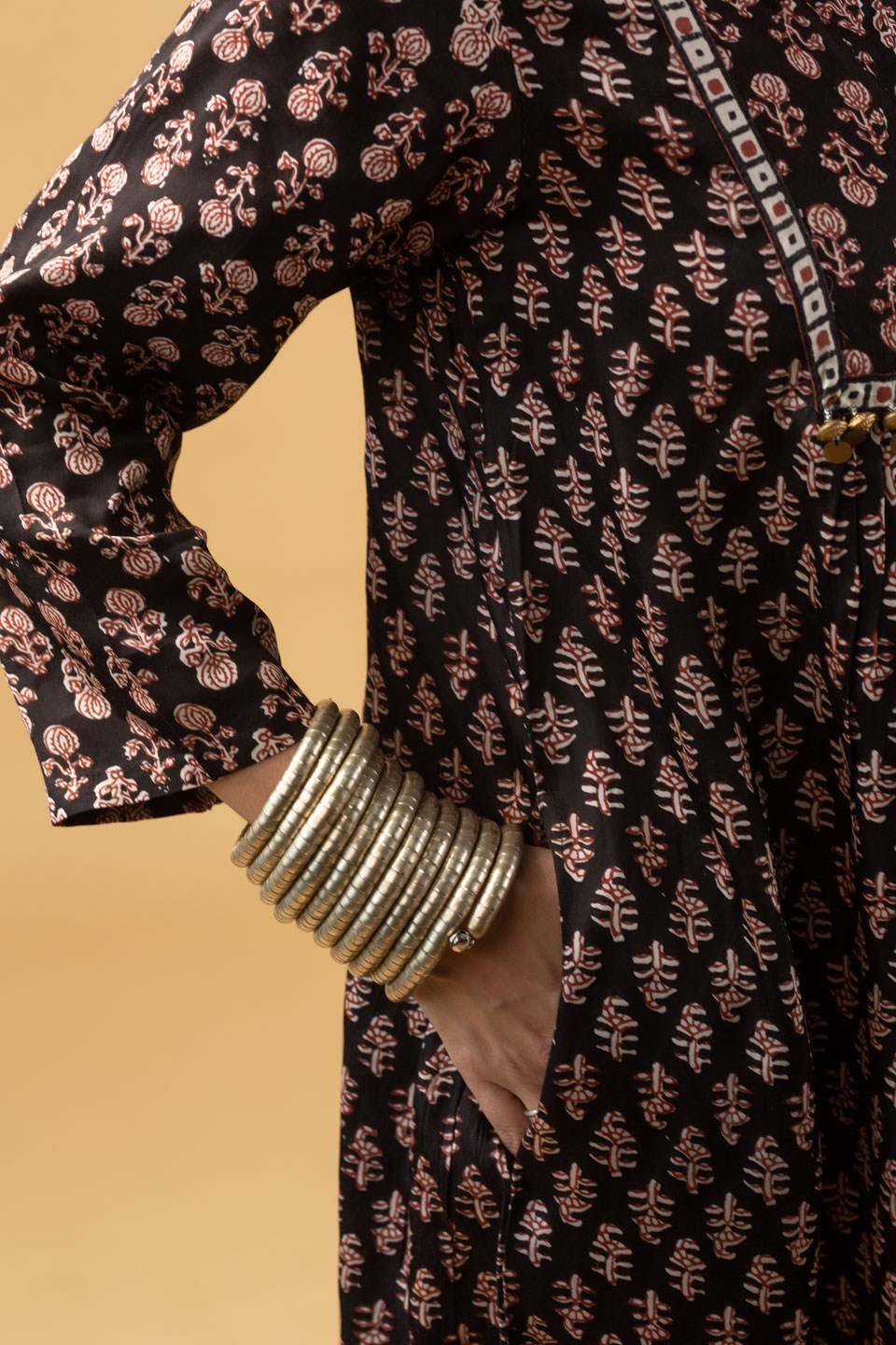 SKU: DR017 This black modal dress features a timeless block print, offering a perfect blend of elegance and comfort. The V-neckline is enhanced with delicate tassel work, adding a touch of charm. Designed in a flattering A-line silhouette with 3/4th sleeves and a convenient side pocket, it’s a versatile choice for any occasion.