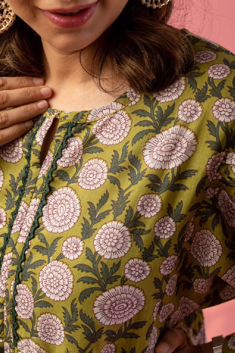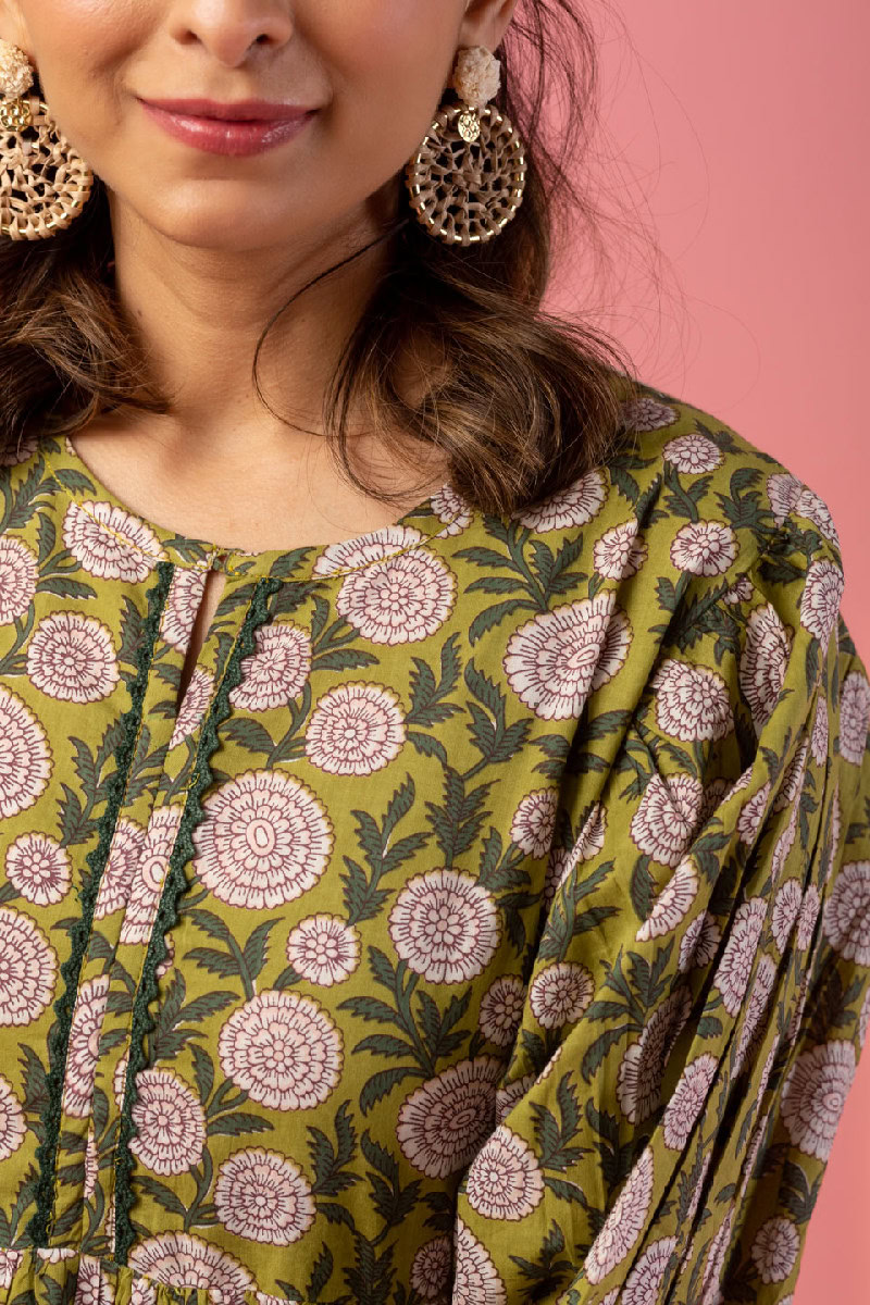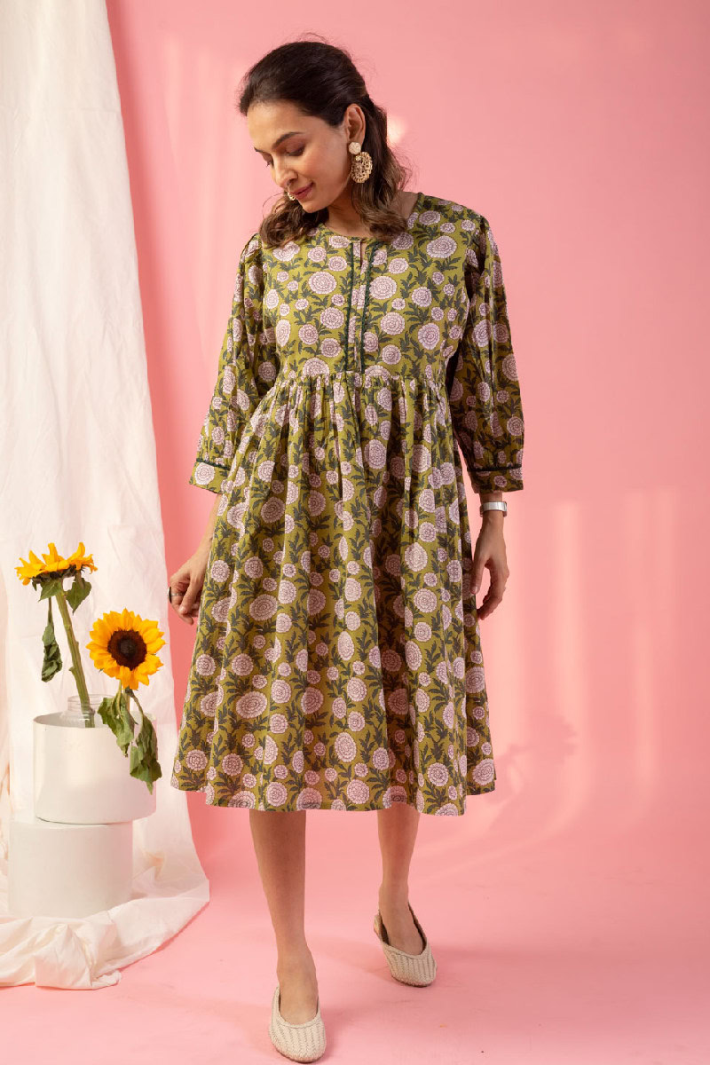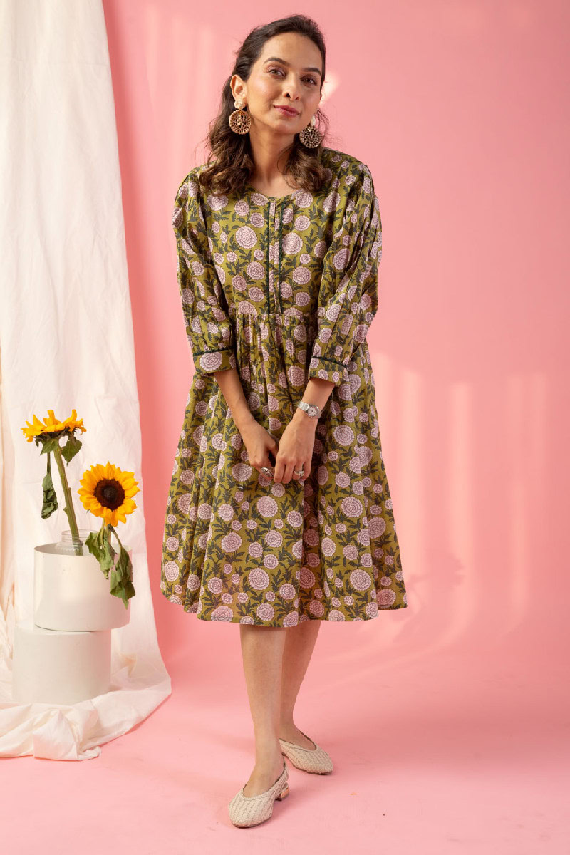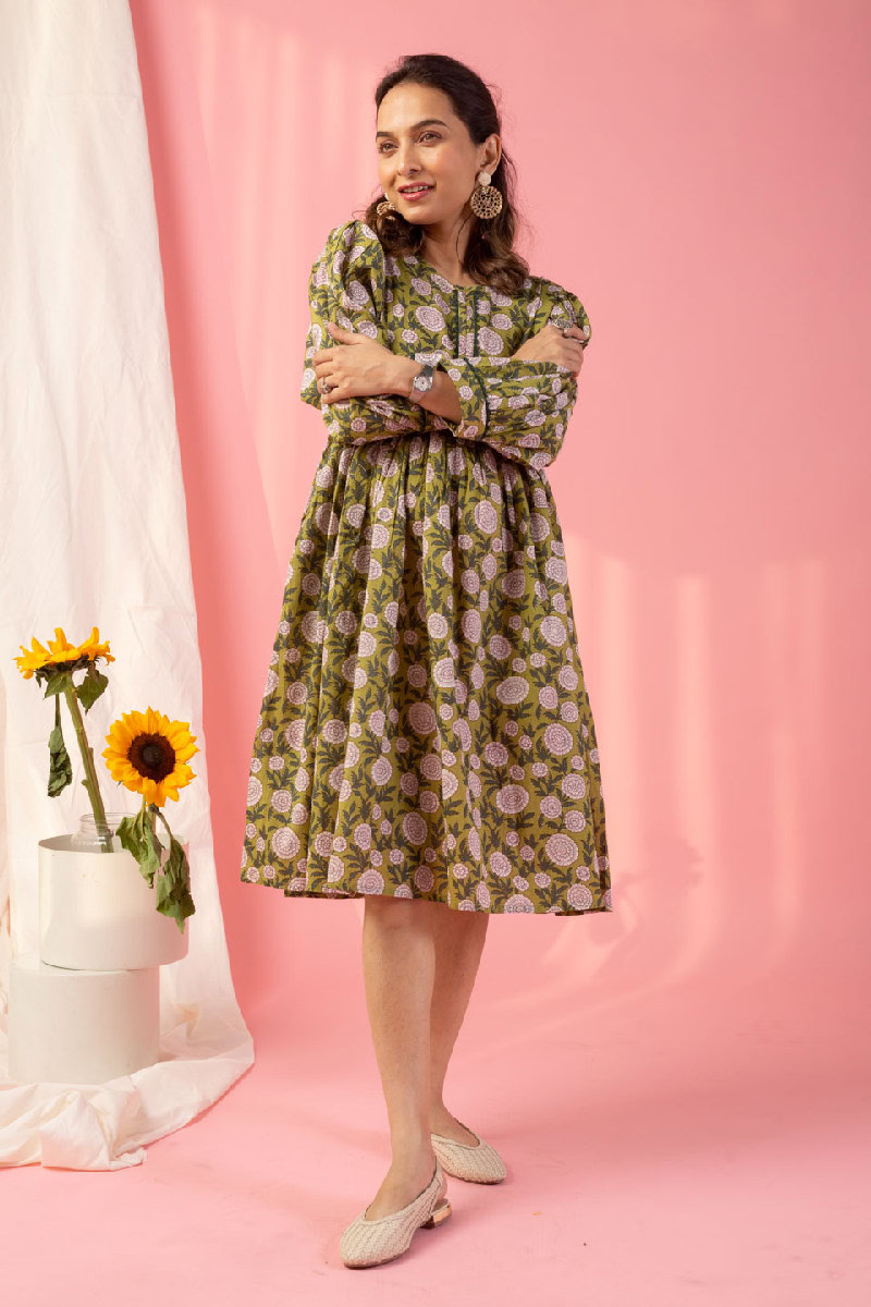 SKU: DR022 Embrace elegance with this green cotton dress featuring a vibrant multicolor block print. Designed with a round neck and a delicate eye-cut detail, it is adorned with a shell button for a subtle touch. The yoke and 3/4th sleeves are beautifully highlighted with schiffli lace, adding charm to its classic appeal. A side pocket enhances functionality, making it perfect for effortless everyday wear.
