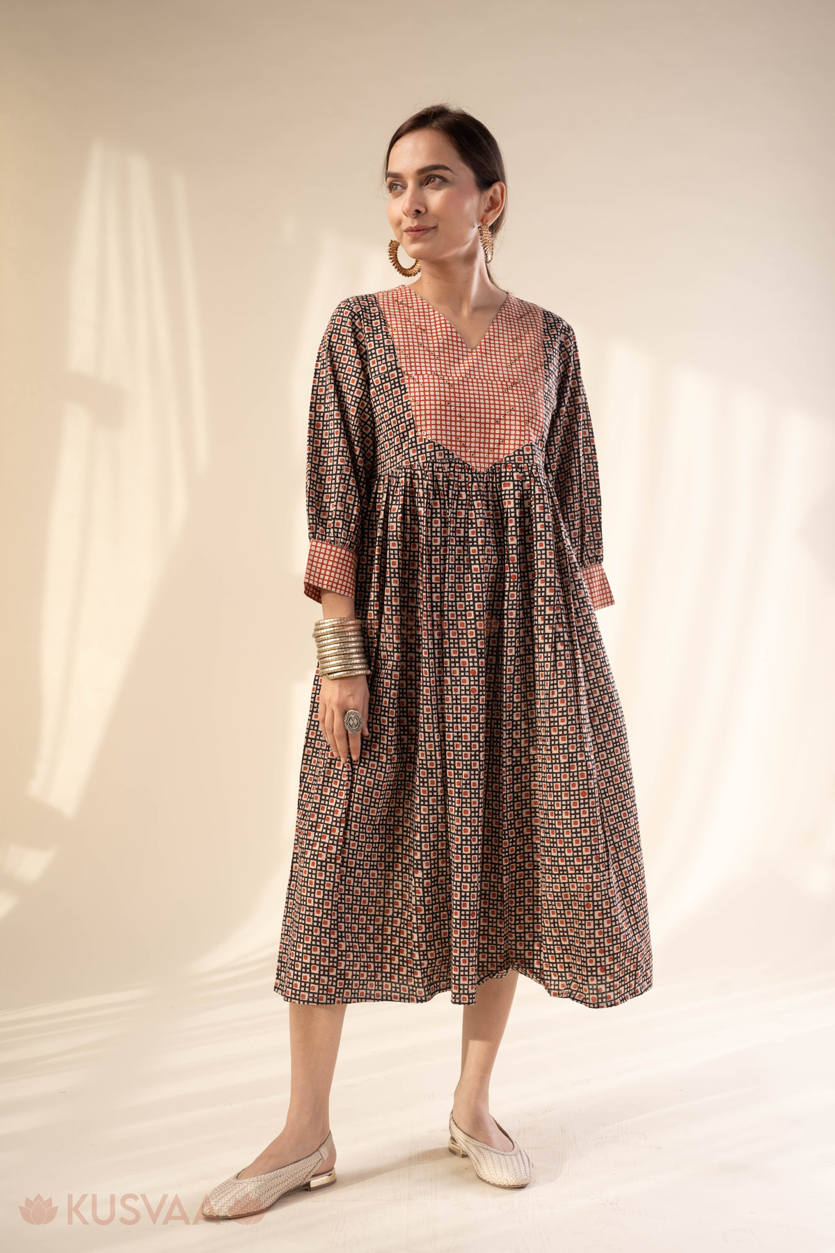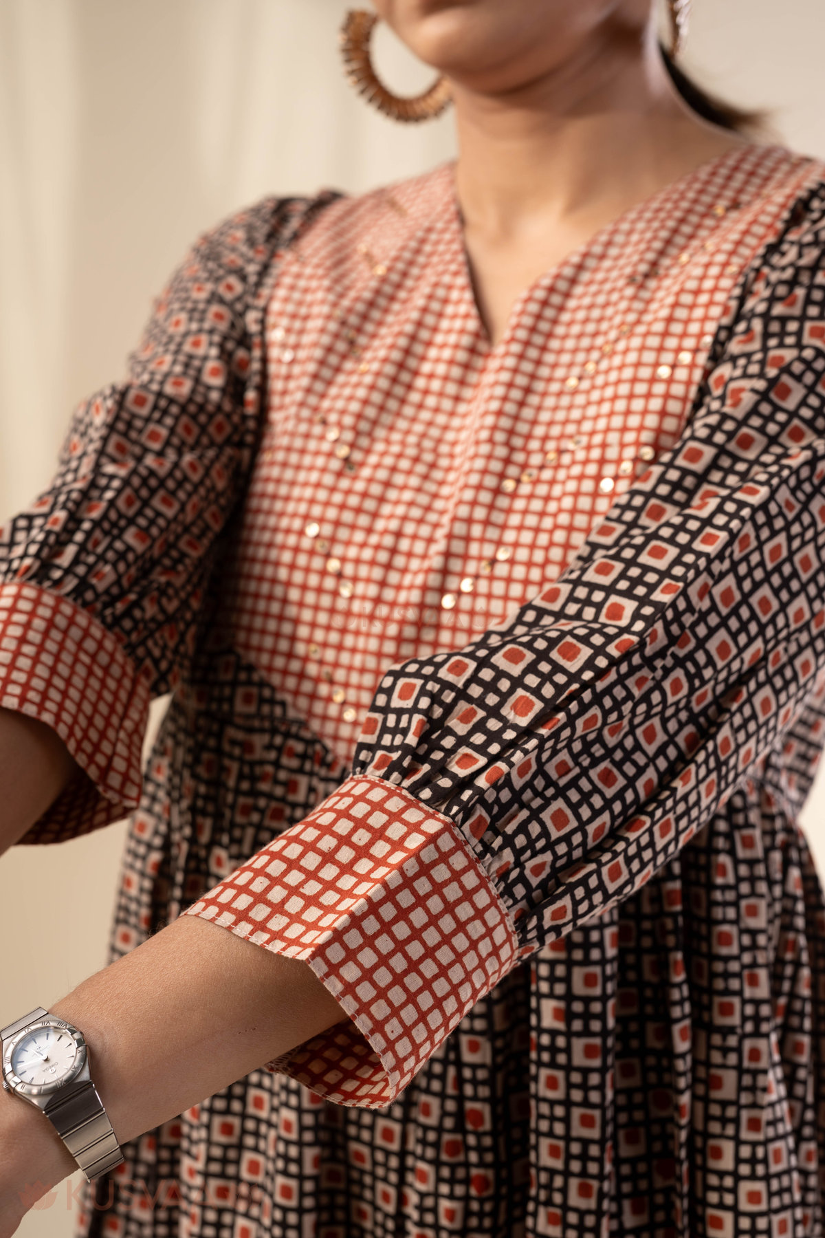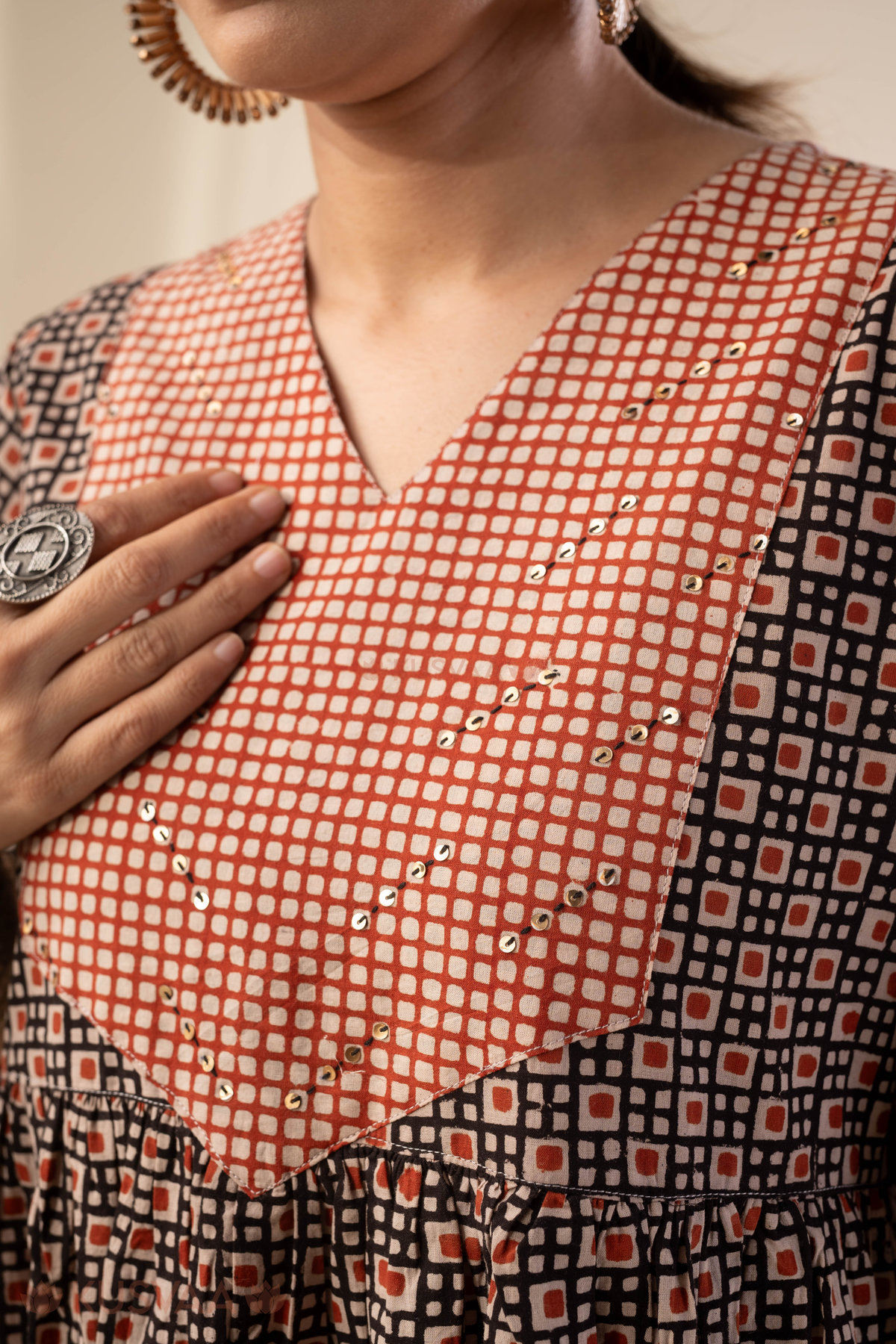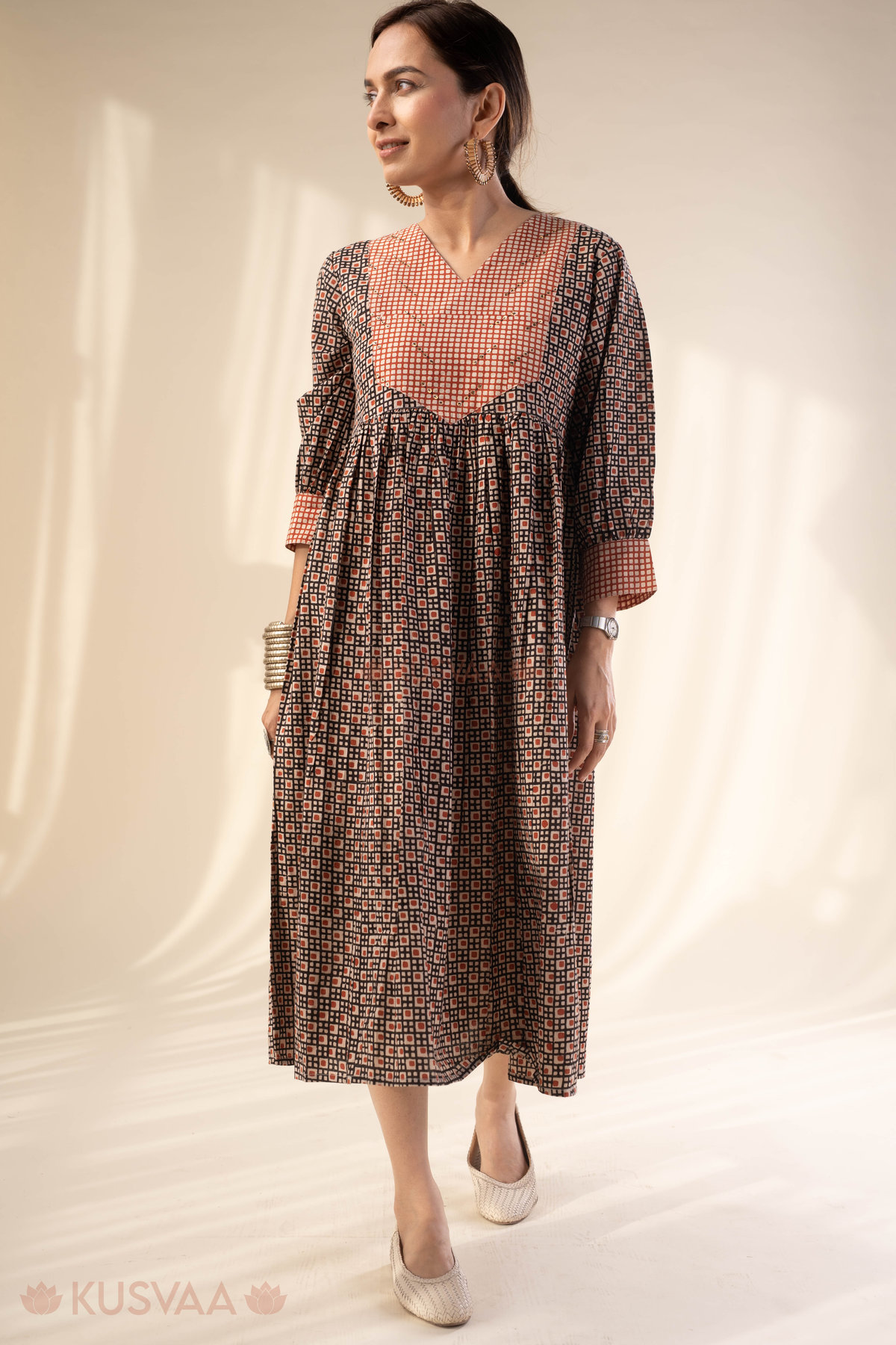 SKU: DR092 This elegant cotton dress comes in a warm rust and black color combination, featuring a beautiful handblock-inspired geometric print. The front yoke is highlighted with a contrasting pattern and subtle sequence detailing, adding a stylish touch. It has a flattering V-neckline and comfortable 3/4th sleeves for everyday wear. Designed with a practical one-side pocket, this dress perfectly blends style with functionality.