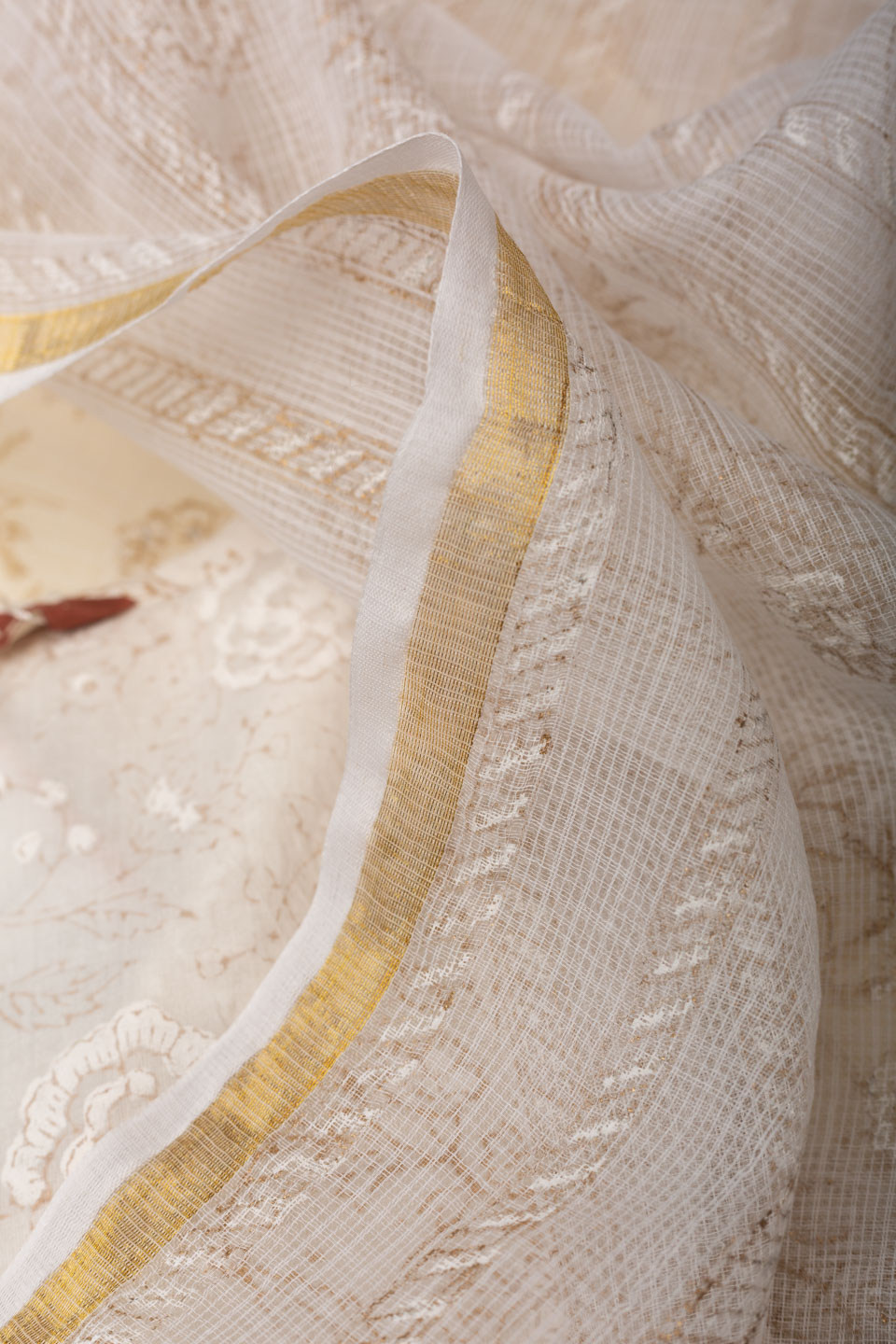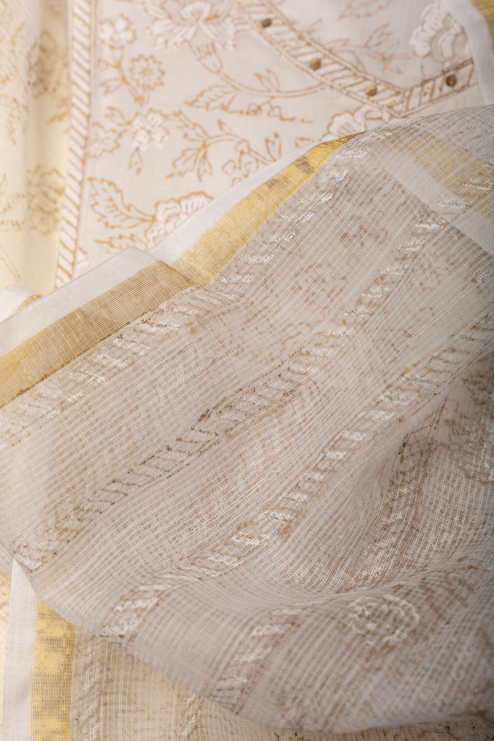 SKU: DUP166 Elegant off-white Cotton Kota Doriya dupatta featuring traditional Khadi print, offering a lightweight, breathable, and graceful drape.