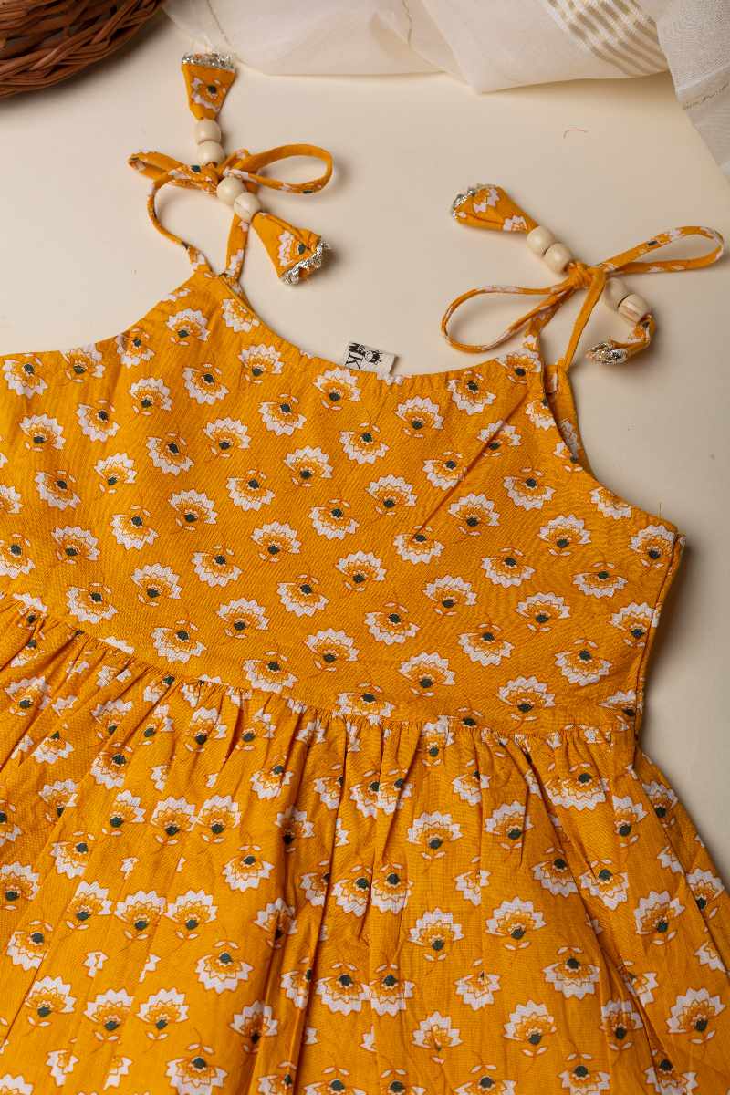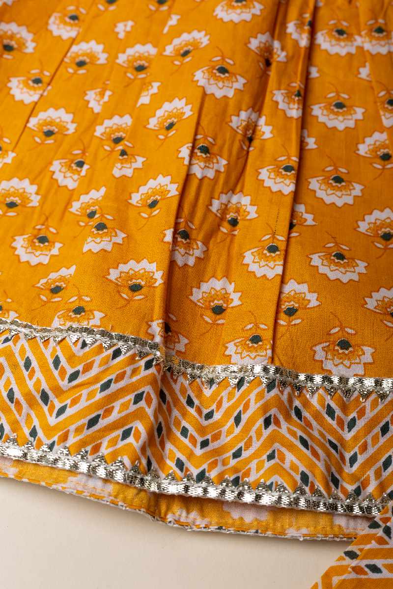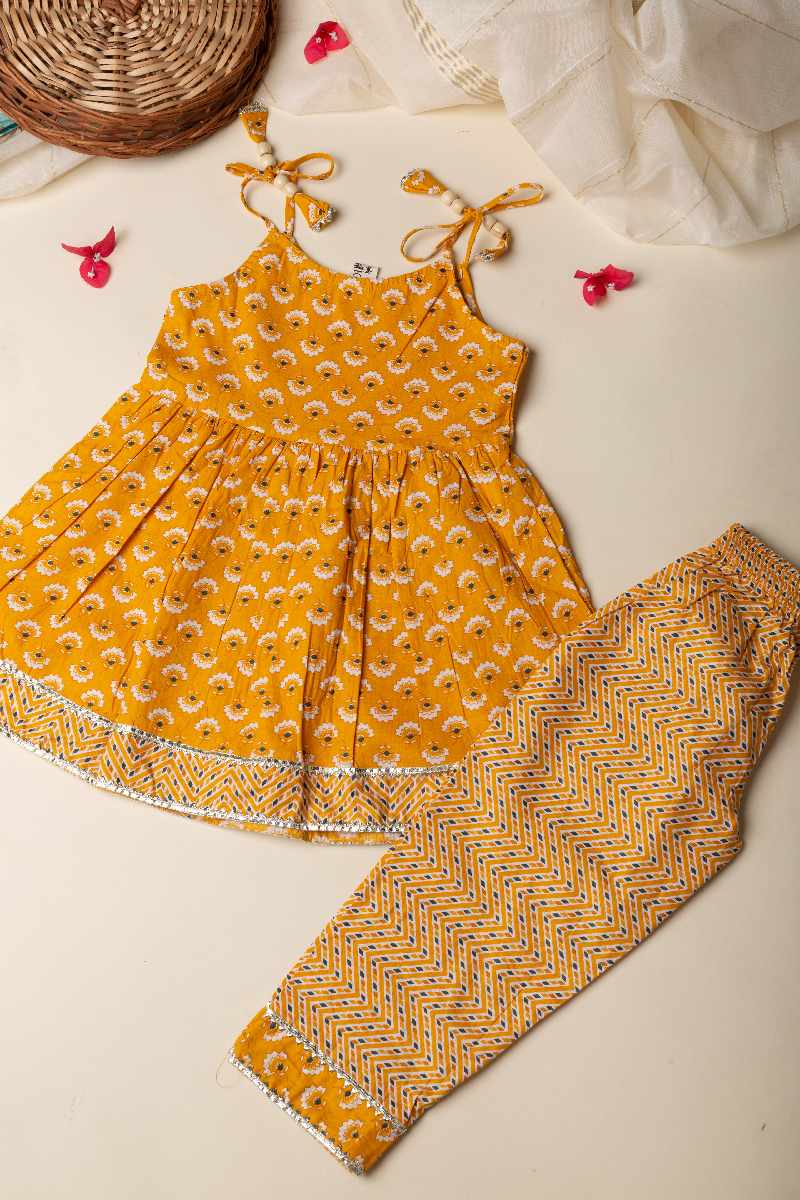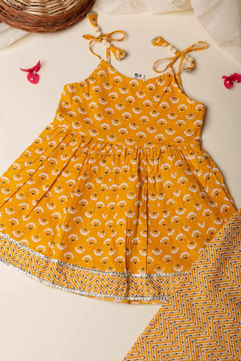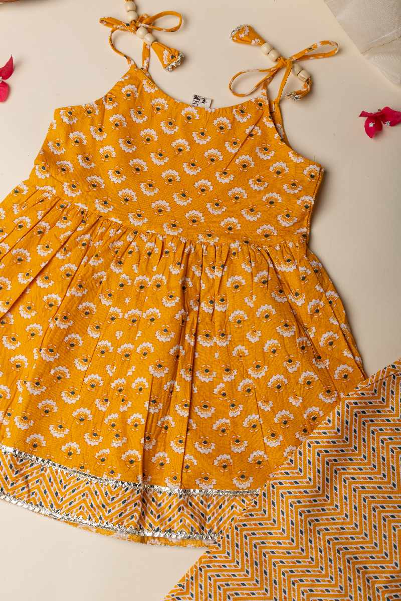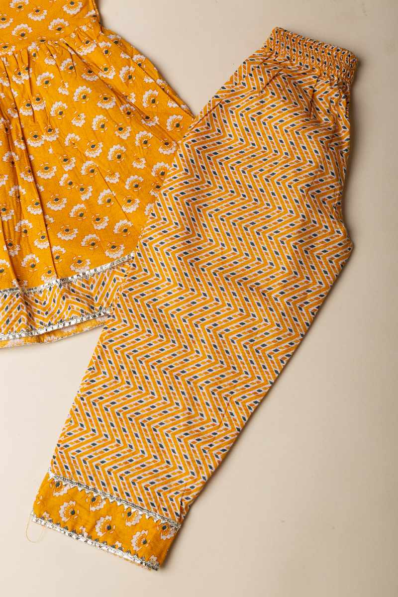 SKU: GRW007 This mustard-colored cotton kurta pant set for girls features a charming floral print and intricate gota patti lace work along the borders. The kurta’s delicate detailing is complemented by the comfort of the elastic waist pant, making it a perfect blend of style and ease for any occasion.