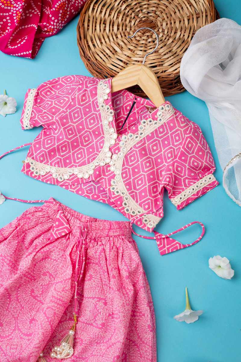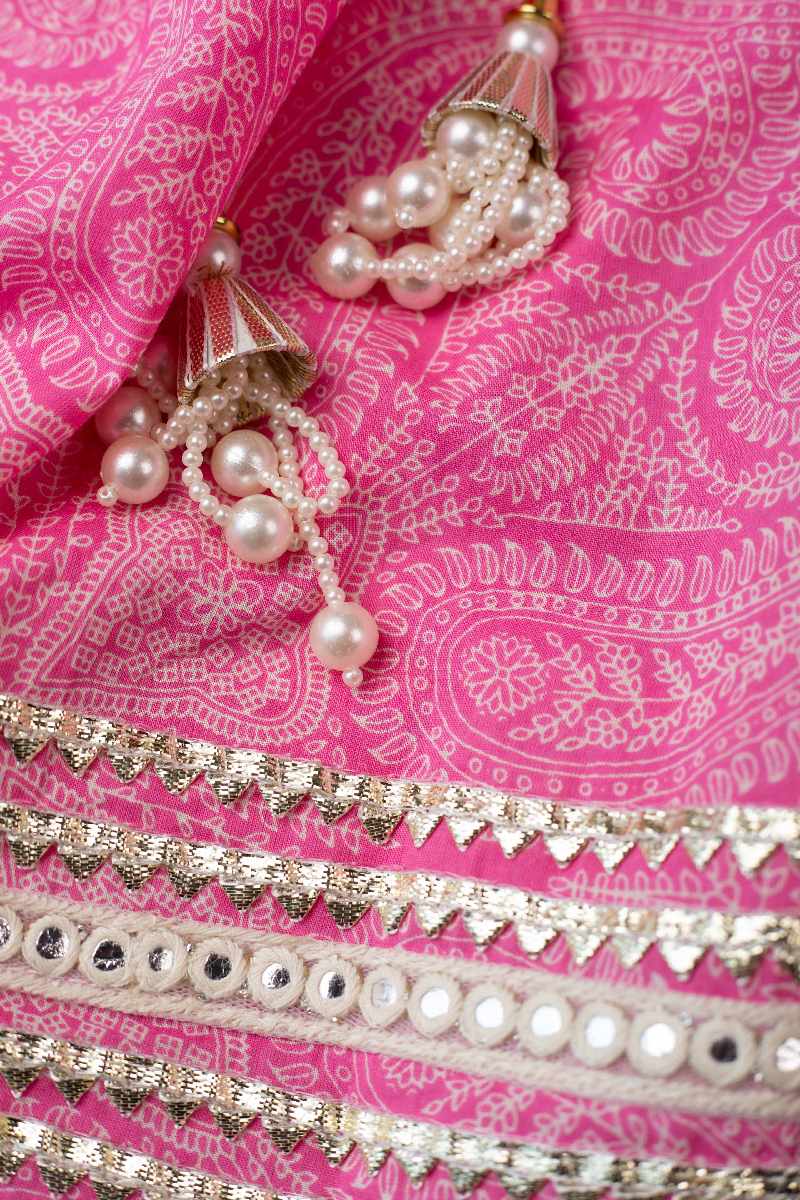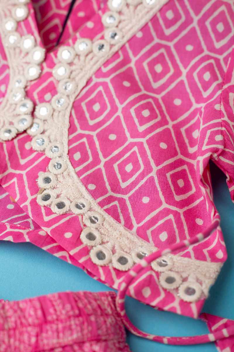 SKU: GRW010 This stylish cotton girls’ skirt, top, and dupatta set in a rich pink color features delicate printed patterns, intricate crochet and mirror work, and trendy pop sleeves. The skirt has an elastic waistband with tassel detailing, while the back of the top closes with a single button. Paired with a contrast white chiffon dupatta adorned with gotta lace work, this set is perfect for festive occasions.