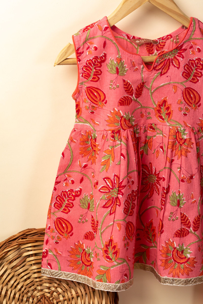 SKU: GRW075 This vibrant girls’ kurta pant set is crafted from soft cotton fabric in a lively pink shade. The kurta features a colorful floral print with delicate thread work and is finished with a shimmering lace border. Paired with matching printed pants that come with an elastic waistband and adjustable dori for a comfortable fit. Perfect for festive occasions and playful days alike.