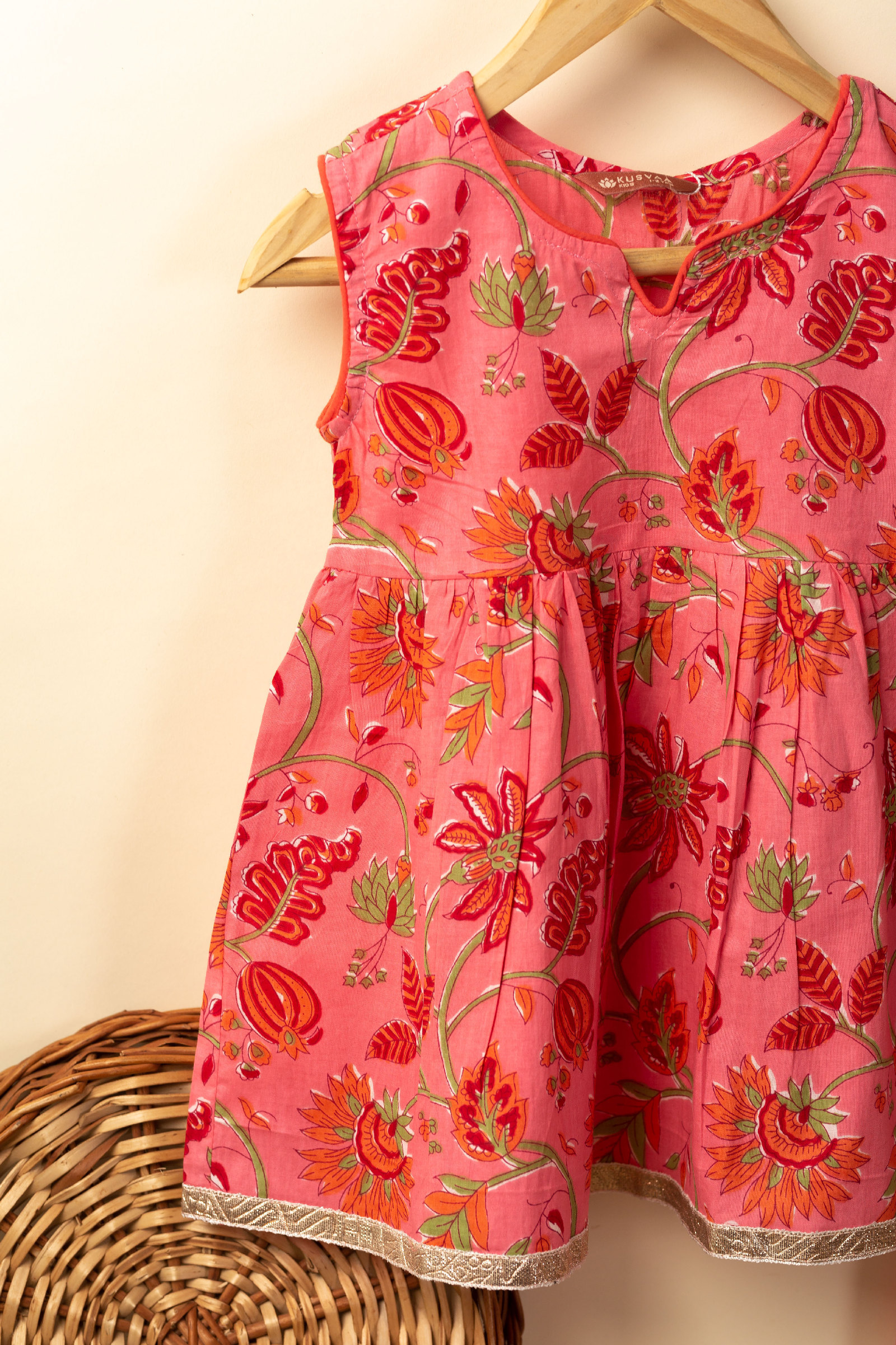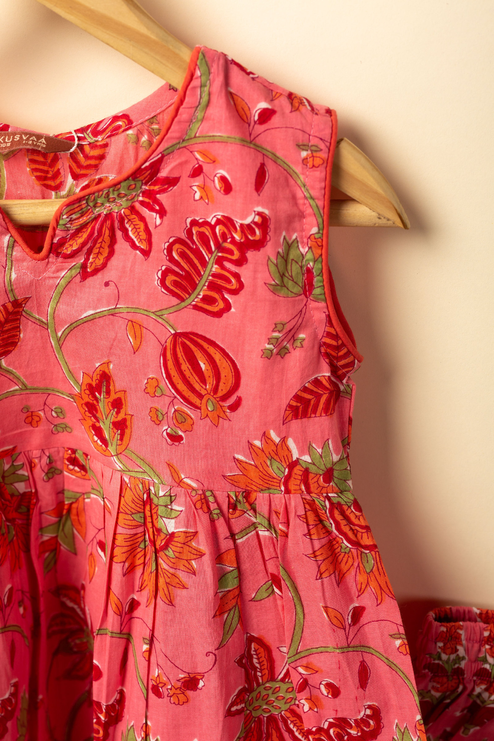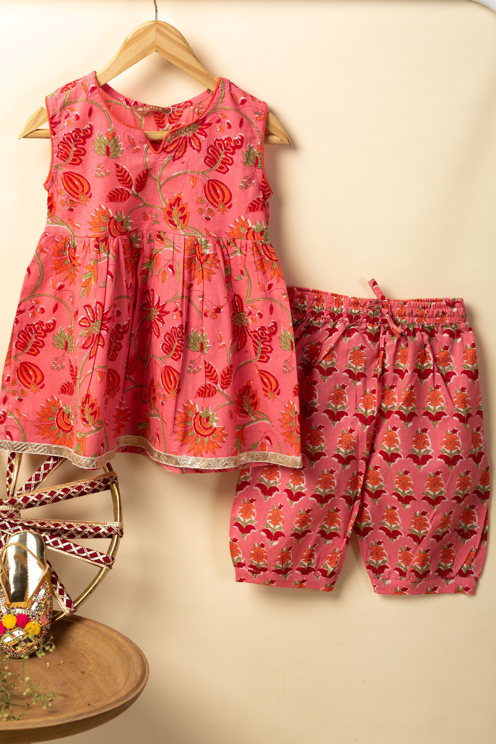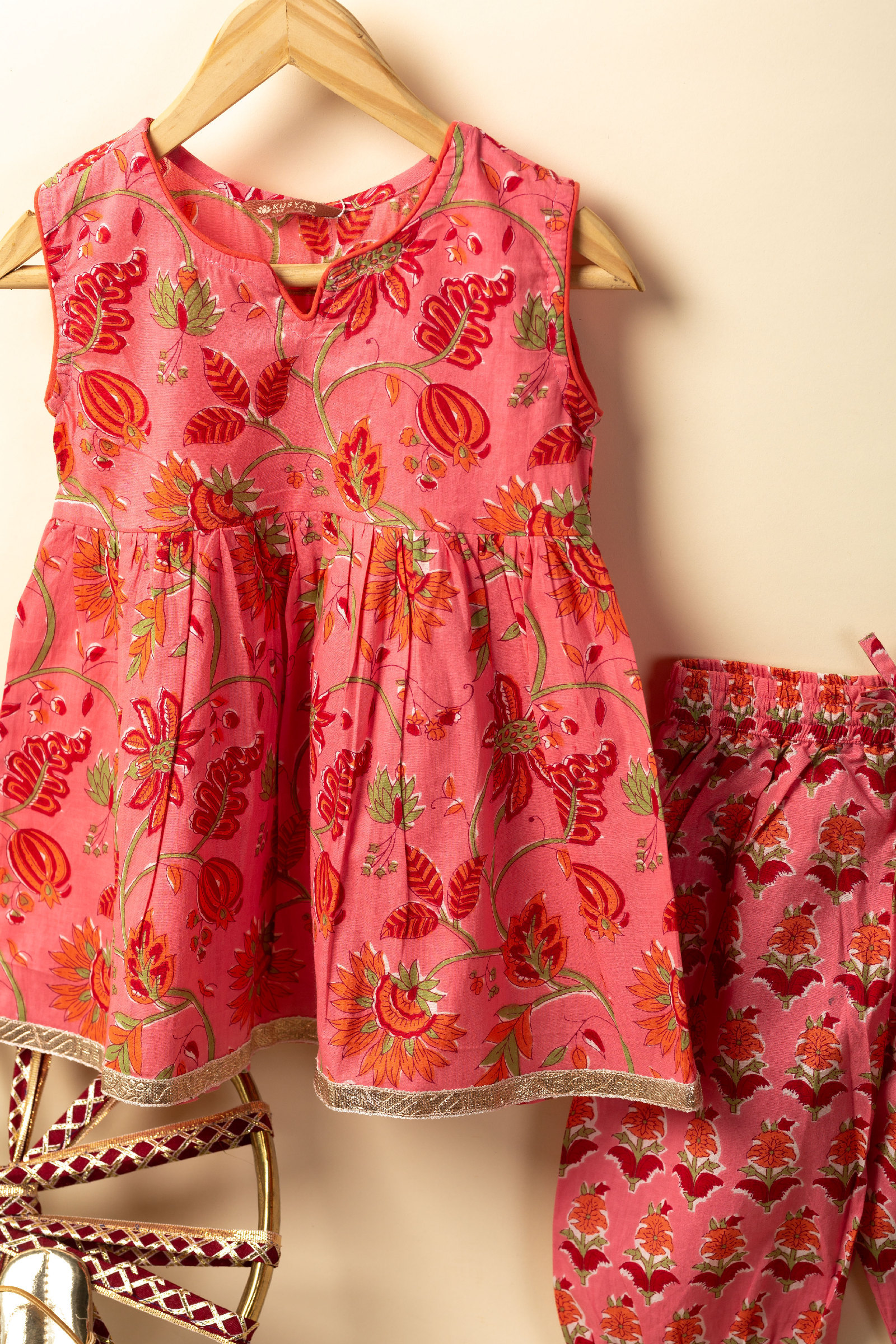 SKU: GRW075 This vibrant girls’ kurta pant set is crafted from soft cotton fabric in a lively pink shade. The kurta features a colorful floral print with delicate thread work and is finished with a shimmering lace border. Paired with matching printed pants that come with an elastic waistband and adjustable dori for a comfortable fit. Perfect for festive occasions and playful days alike.
