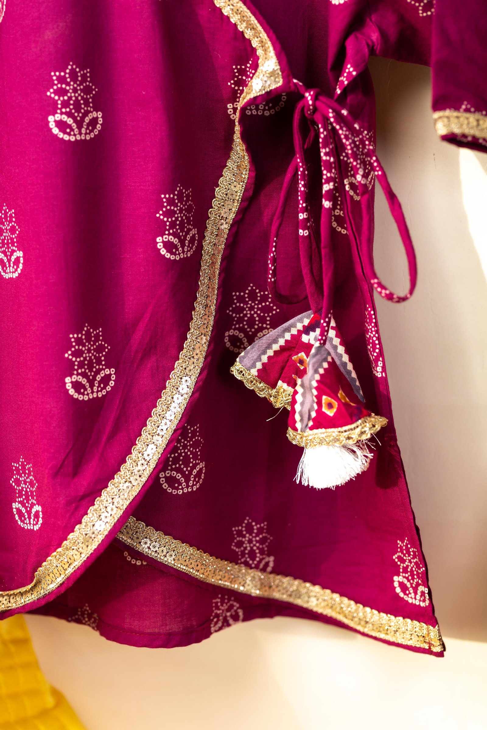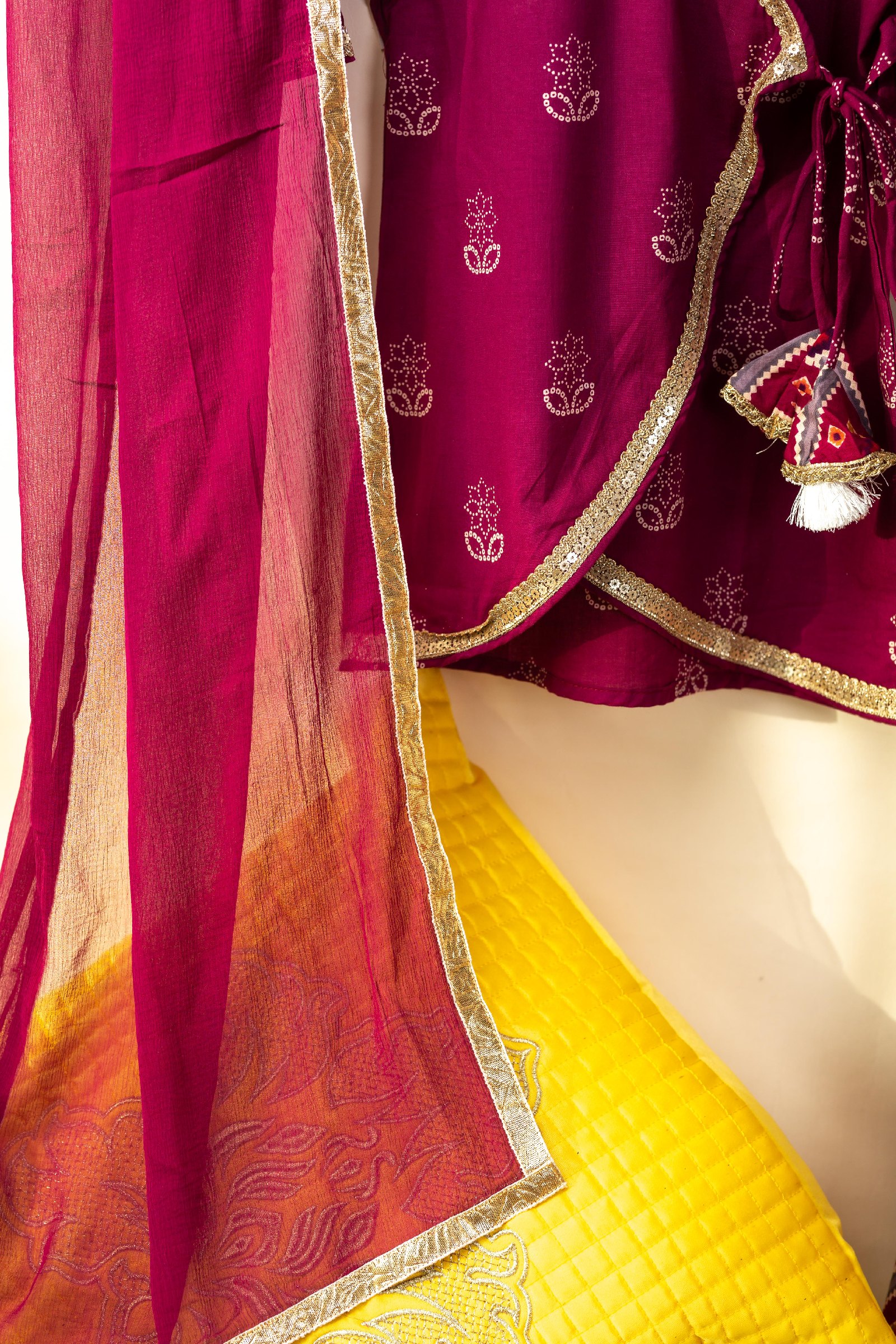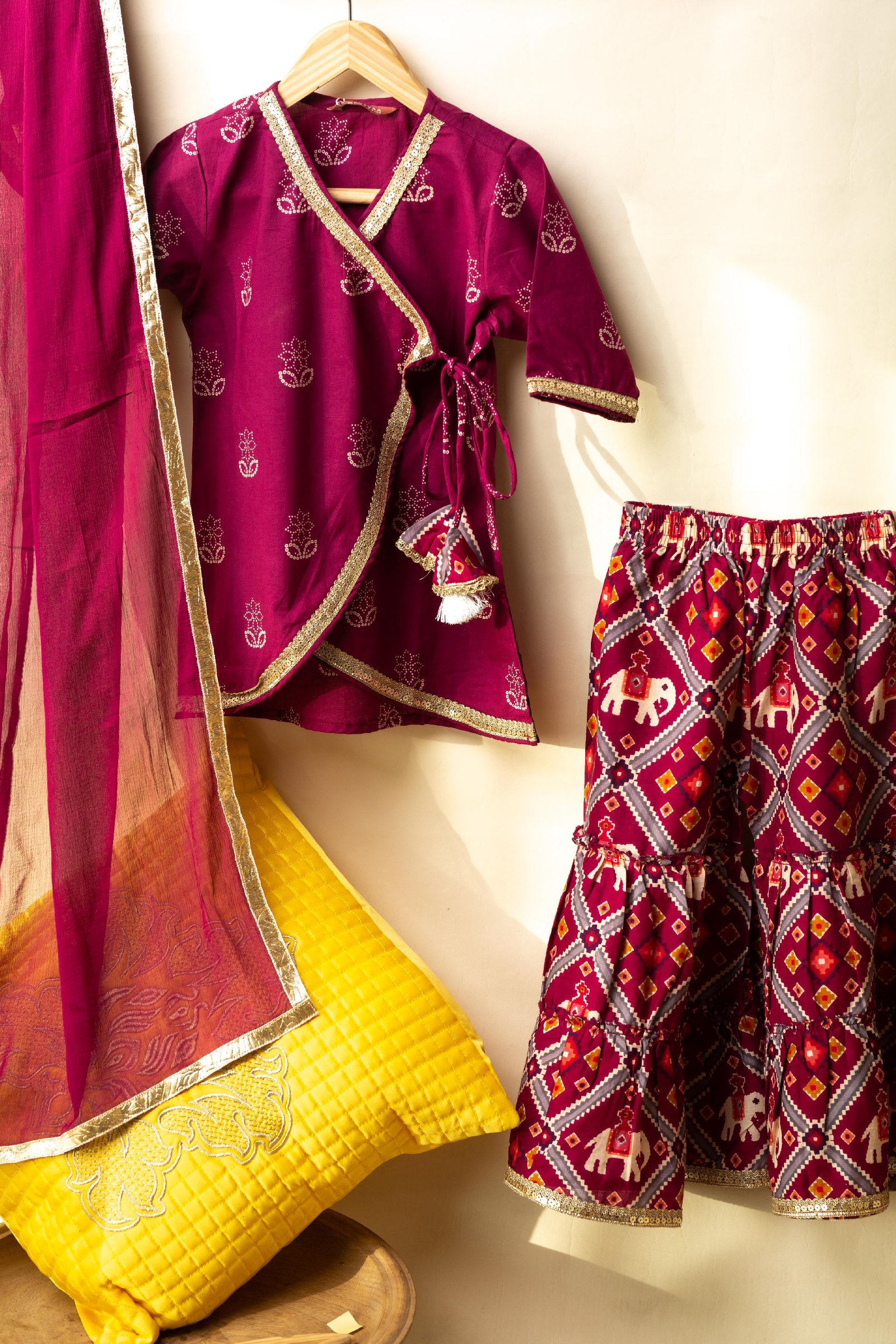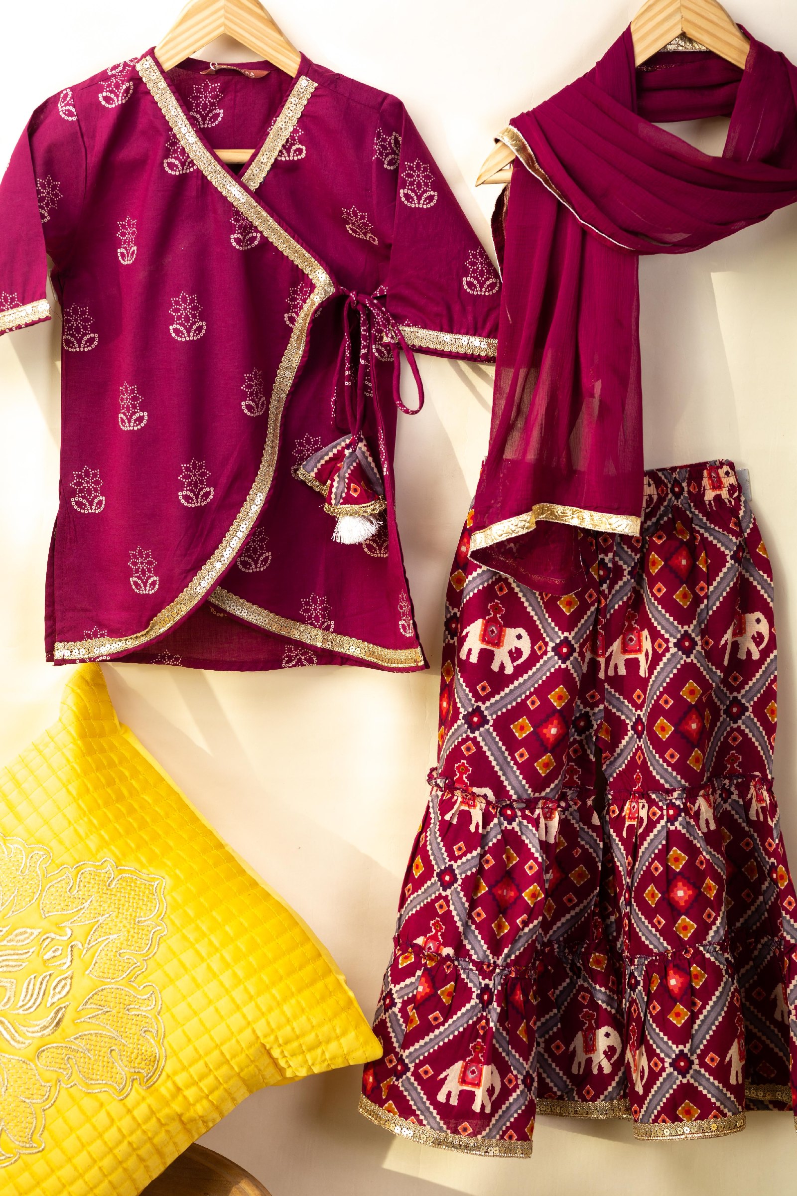 SKU: GRW098 This stylish girls’ cotton suit set comes in a rich wine color with delicate foil print motifs on the kurta. The wrap-style kurta features a V-neck, side tie-up with tassels, and 3/4th sleeves finished with gota lace. It is paired with a matching printed sharara pant in vibrant elephant and geometric patterns with an easy elasticated waist. A contrasting chiffon dupatta edged with gota lace completes the festive look.