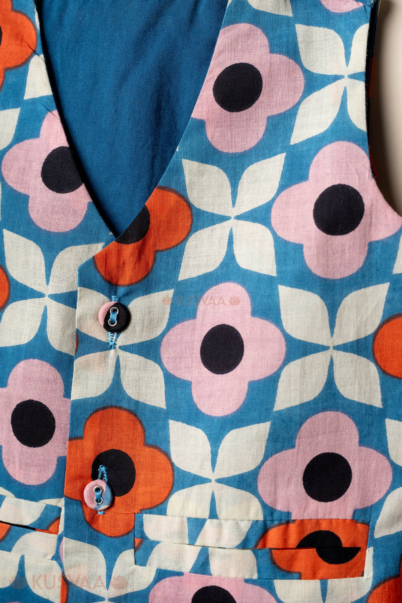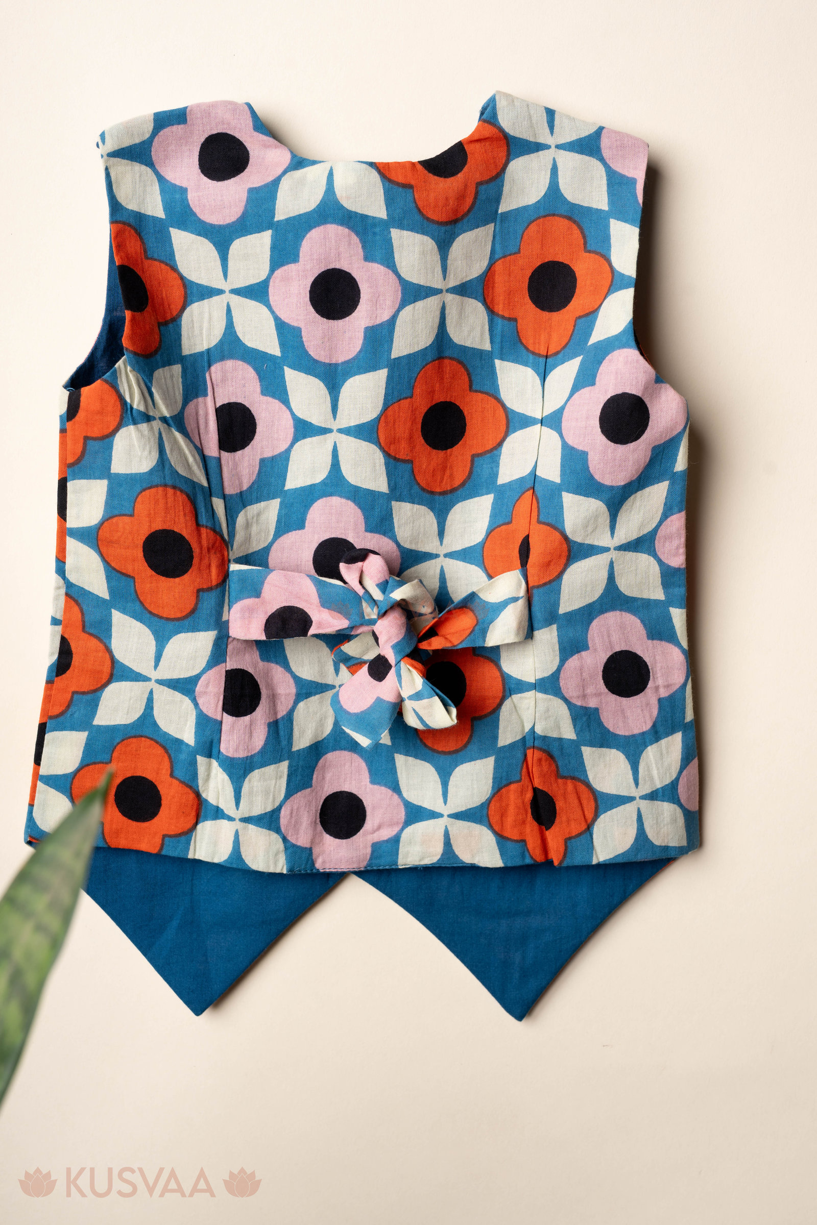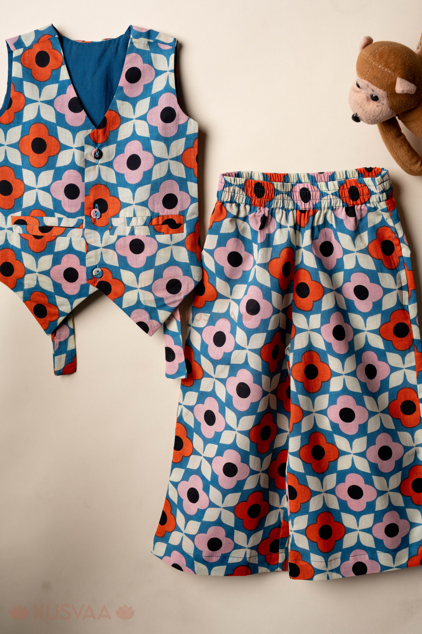 SKU: GRW109 This stylish cotton kids girls co-ord set features a beautiful blue base with vibrant red and pink floral print, giving it a fun and playful look. The sleeveless V-neck top comes with front buttons and both side pockets, finished with soft cotton lining for extra comfort. It is paired with matching pants with waist elastic and both side pockets, making it perfect for all-day easy wear