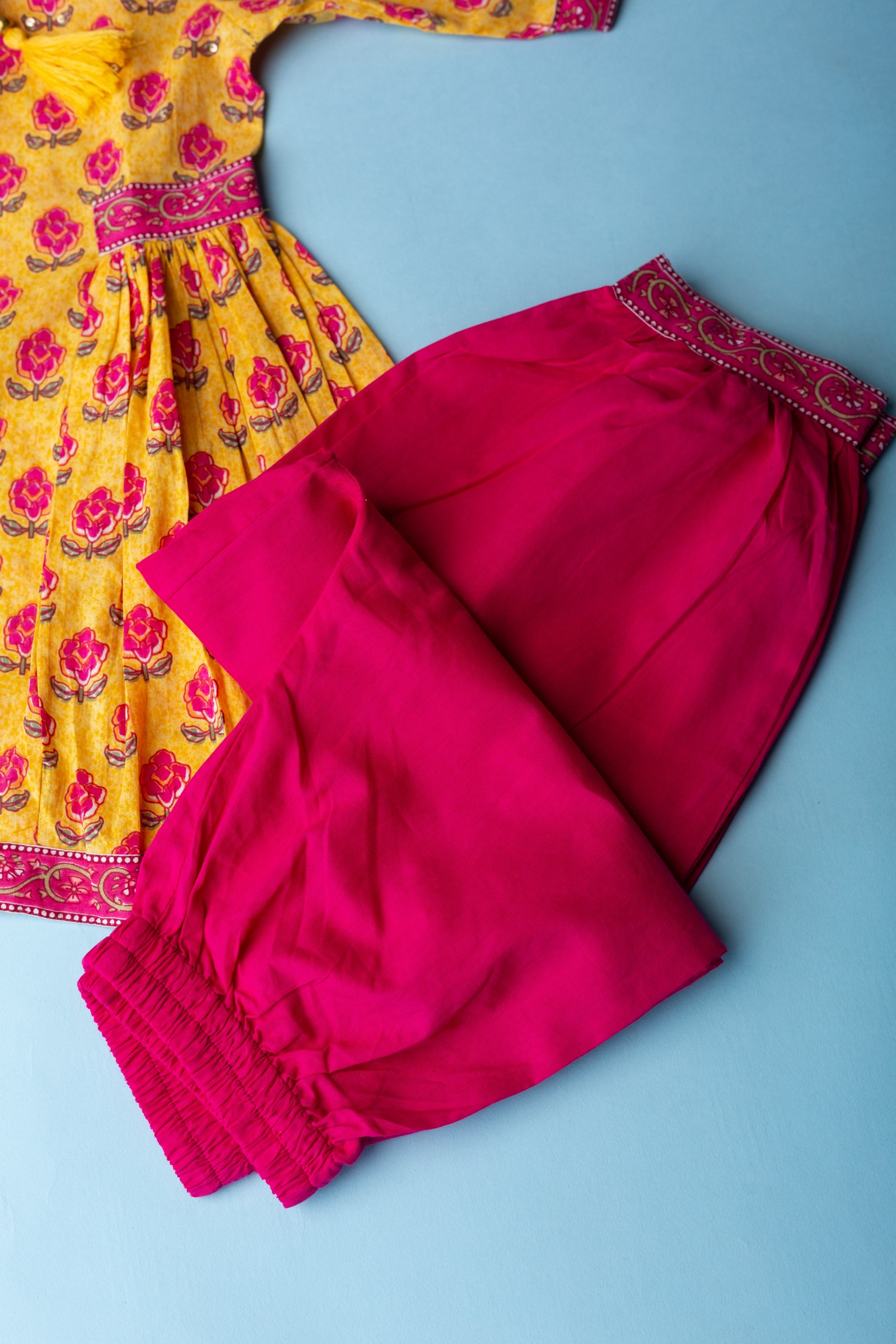 SKU: KNE10 This delightful cotton girl’s suit set in a sunny yellow color features an exquisite handblock print and intricate mirror work that adds a touch of sparkle. The kurta is designed with a round neck and 3/4th sleeves, offering a classic yet stylish look. Paired with contrasting pants and a dupatta, both highlighted with a delicate border, this set is perfect for any festive or casual occasion. Please Note: The set comes as a brother sister duo sets.