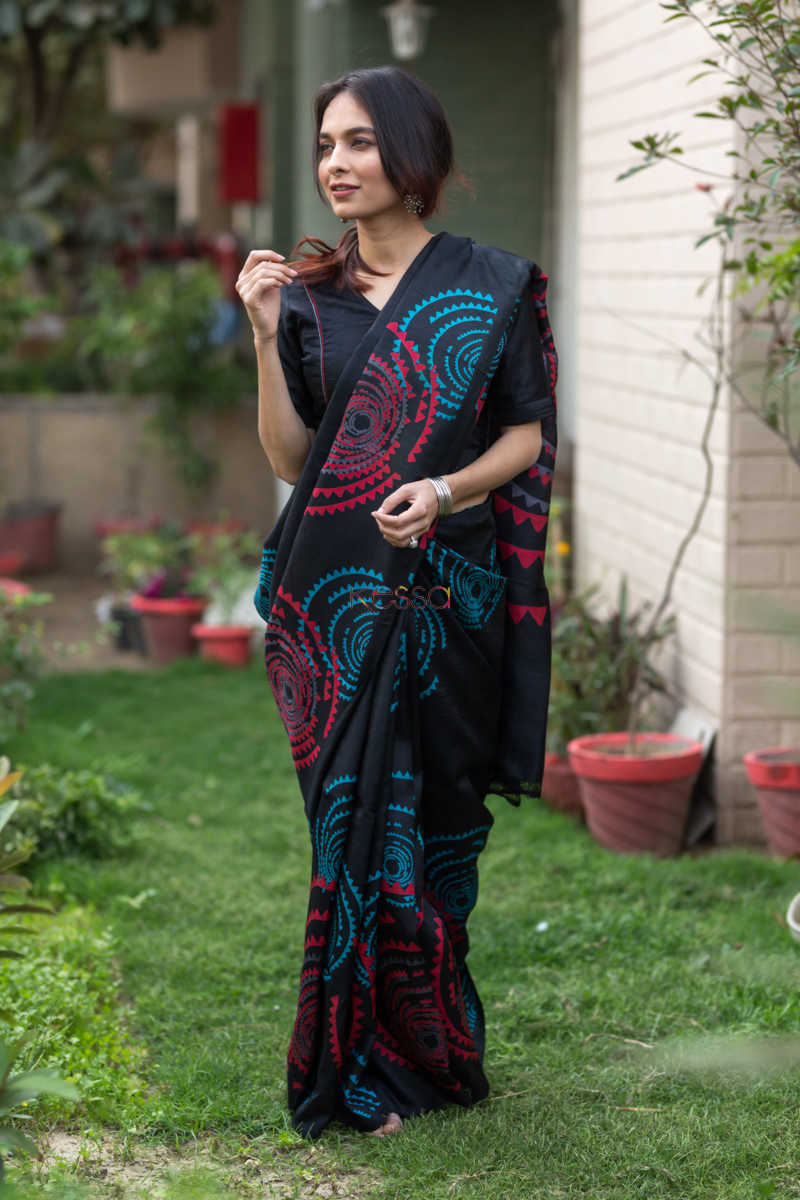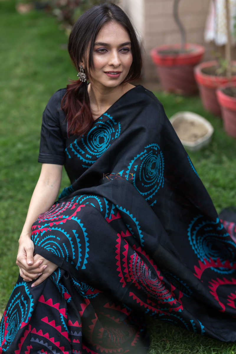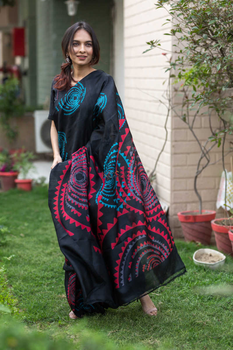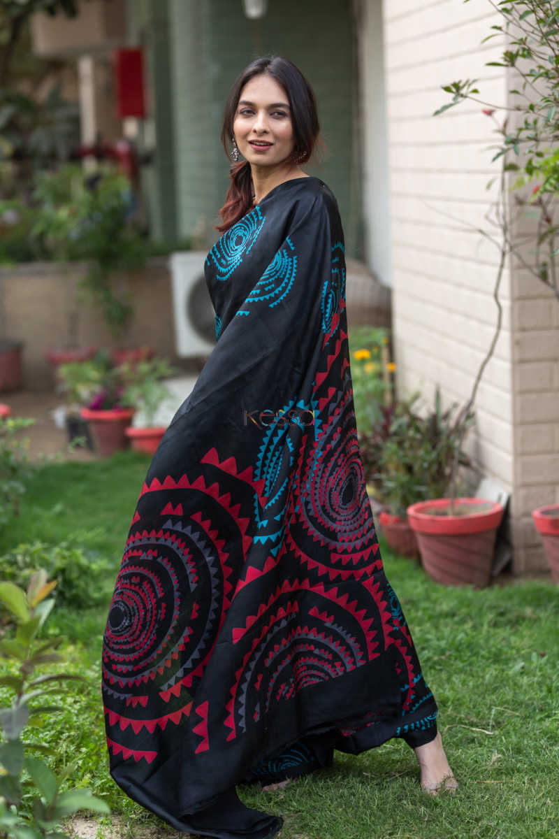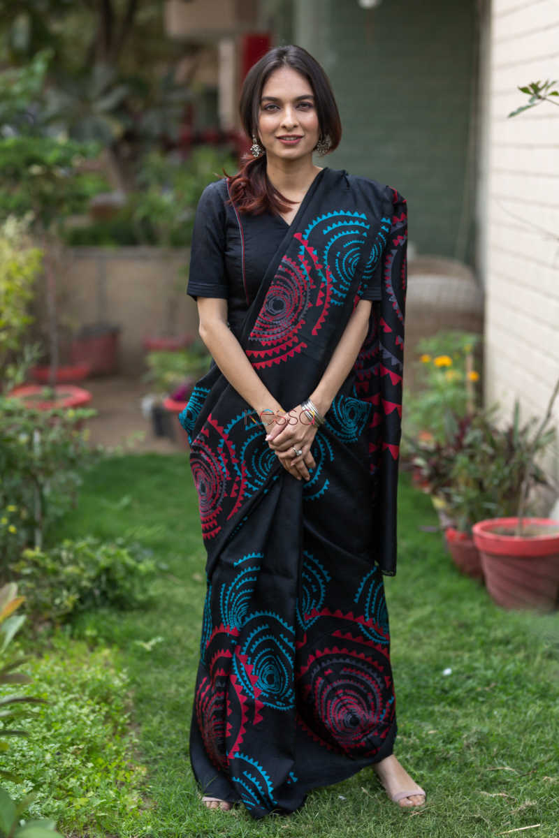 SKU: KUNF03 An alluring screen print of circular motifs in red and blue on the gorgeous black, Bengal Silk Saree. The softest silk, that is easy to drape and can be worn in all seasons due to its rare qualities. The saree comes with a coordinating black blouse.