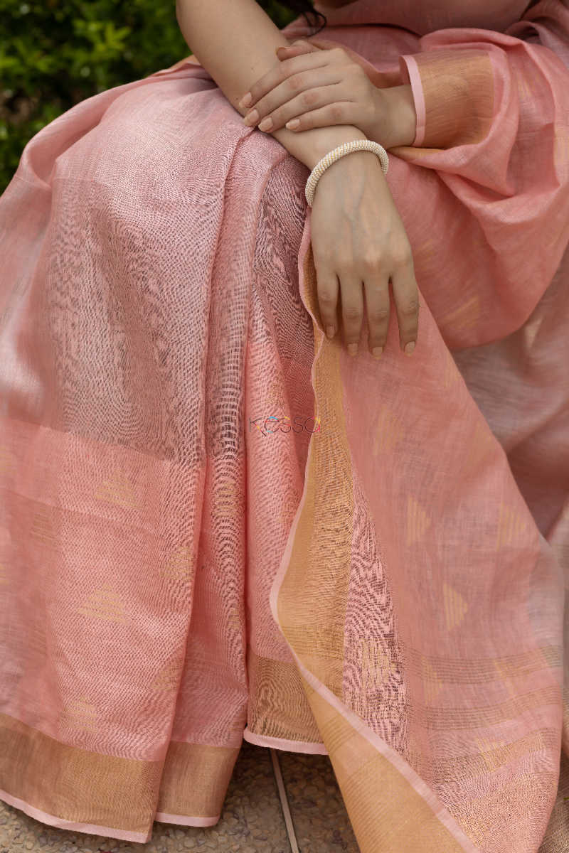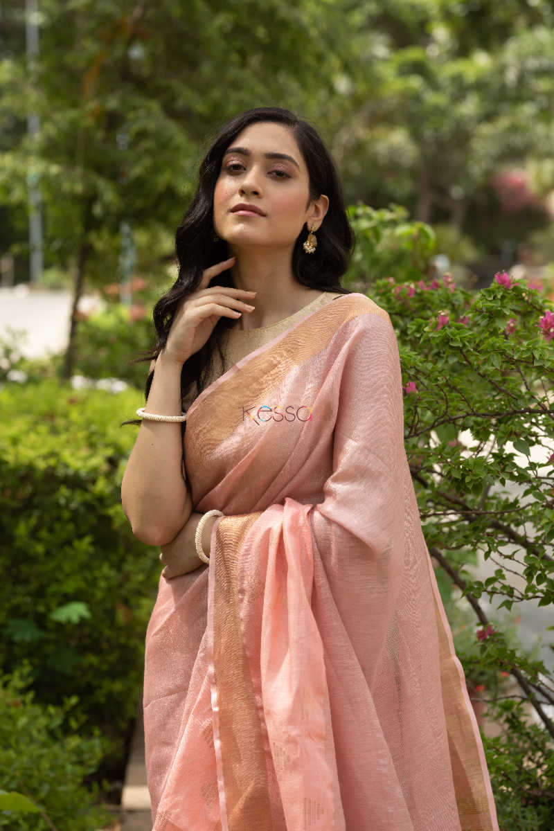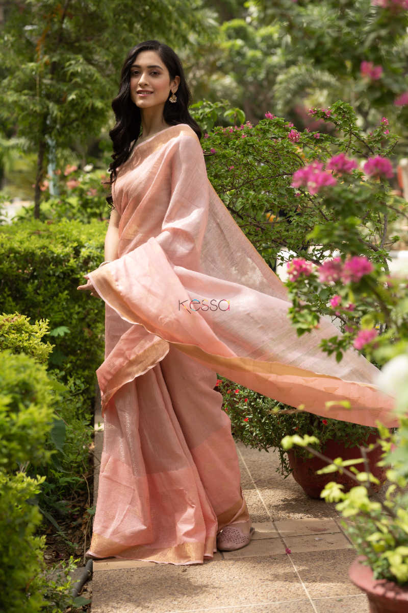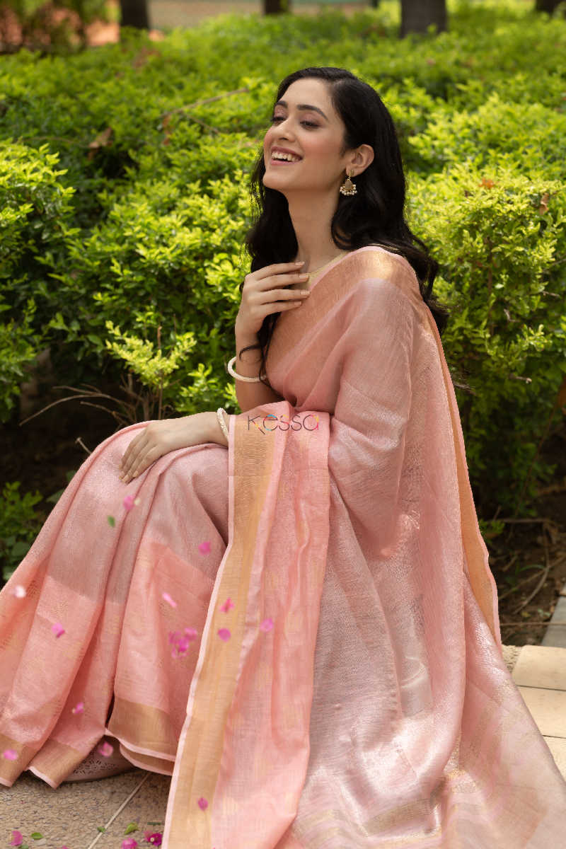 SKU: KURT08 Linen saree with zari border, an appreciable work by our artisians, the border comes with shade of peach with zari motif on the pallu and at the bottom of saree. This is a complete handloom saree and comes with same peachcolour blouse. A must have for your wardrobe