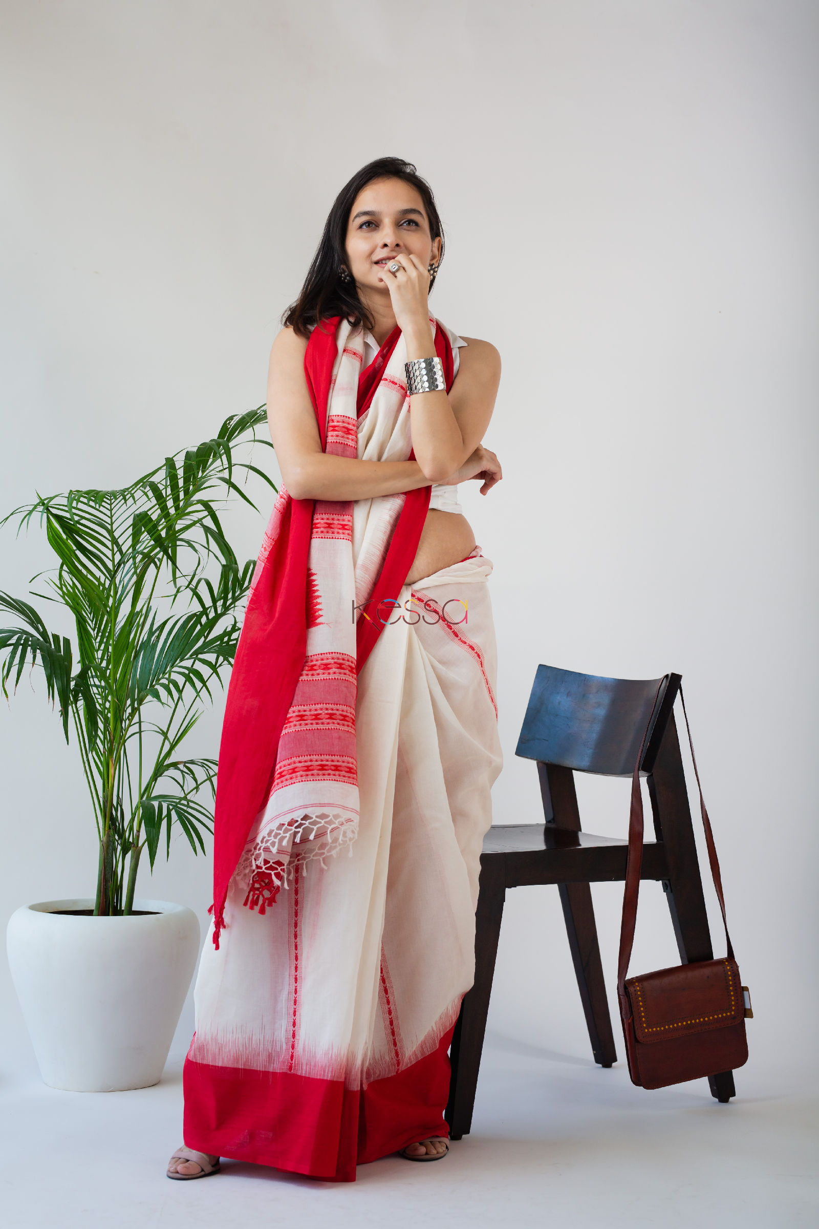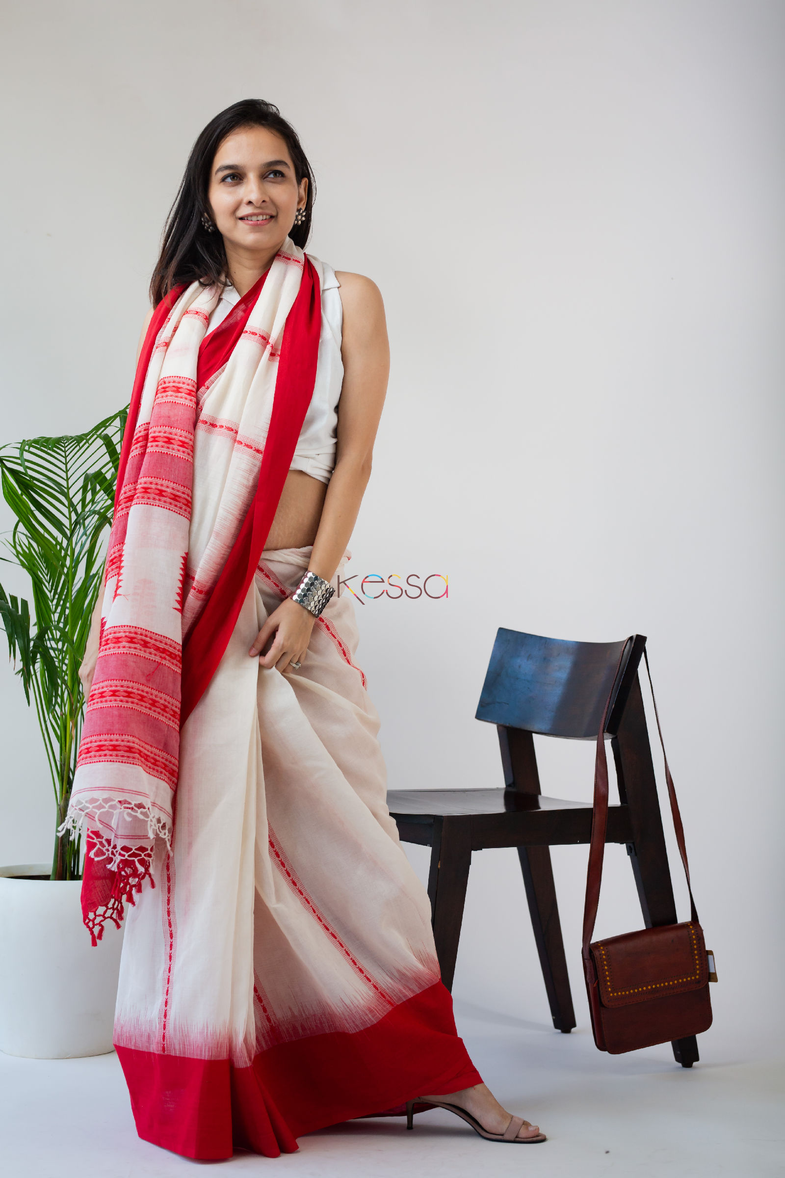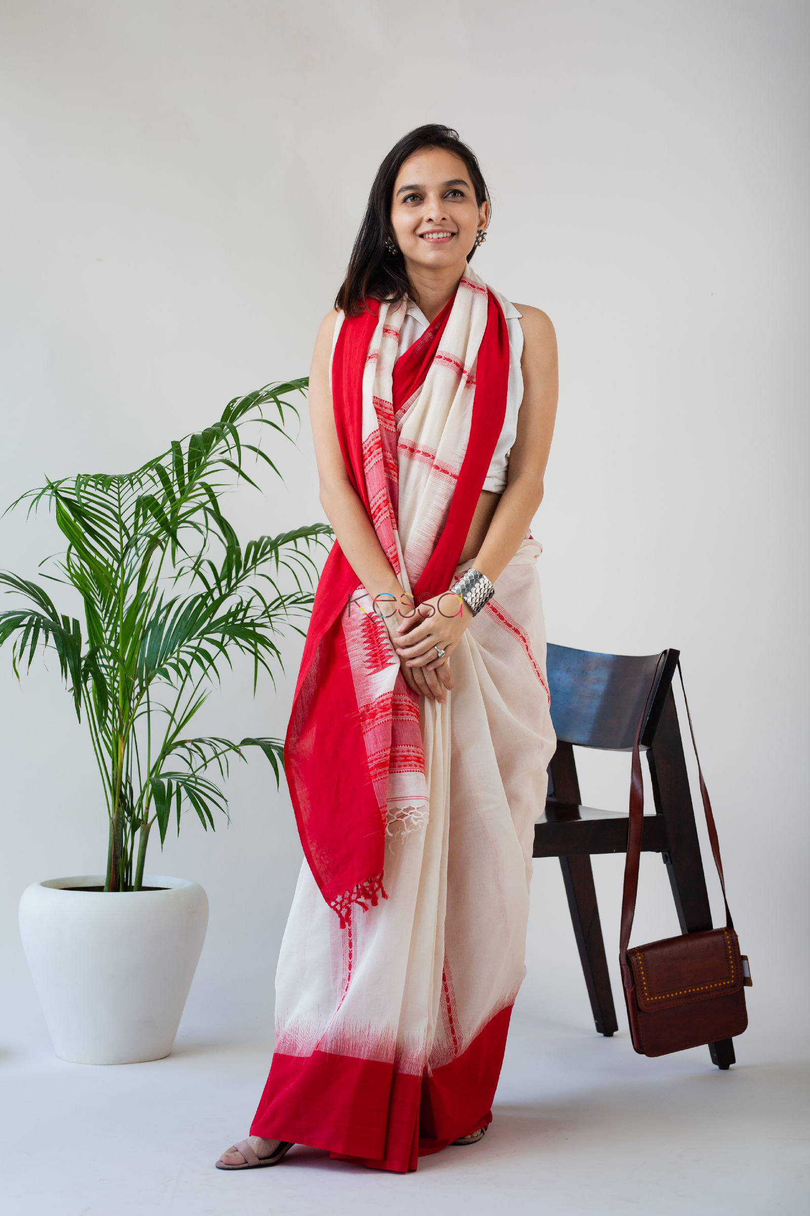 SKU: KUSS01 A handwoven cotton saree is a must purchase for your ethnic collection as office wear and festive wear. We have kept the saree fabric very soft and easy to wear. The saree comes with red handloom blouse fabric.