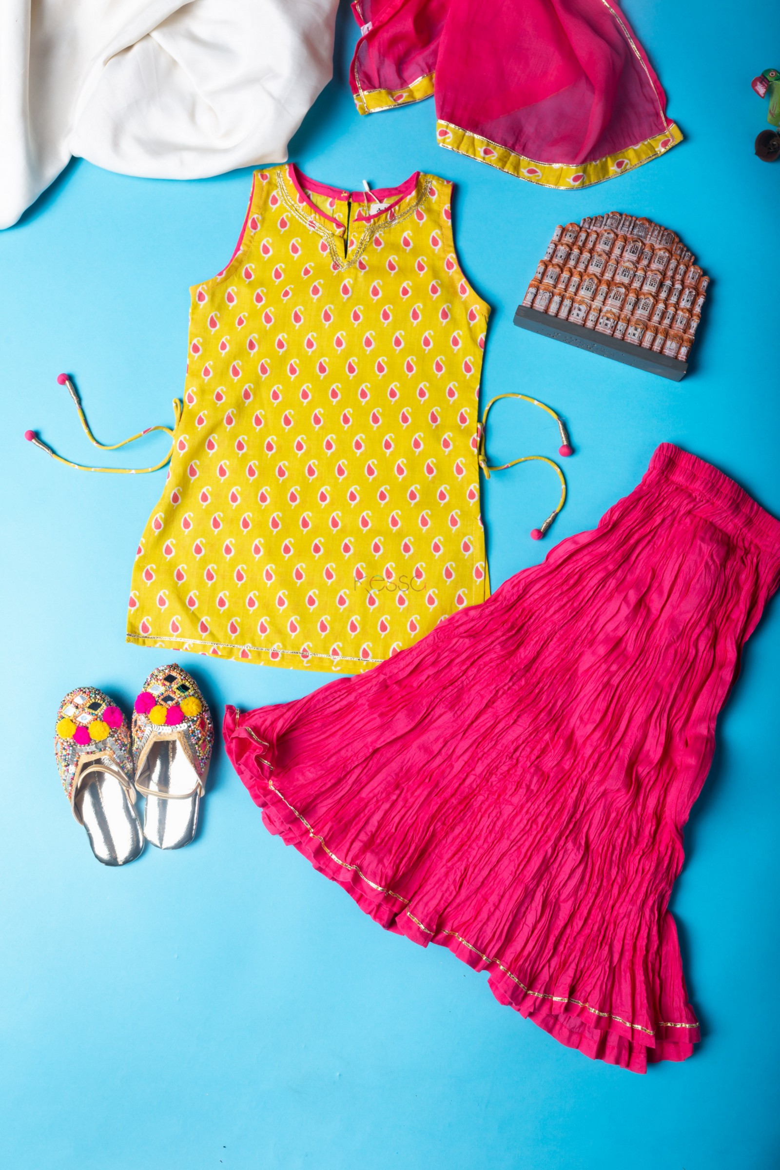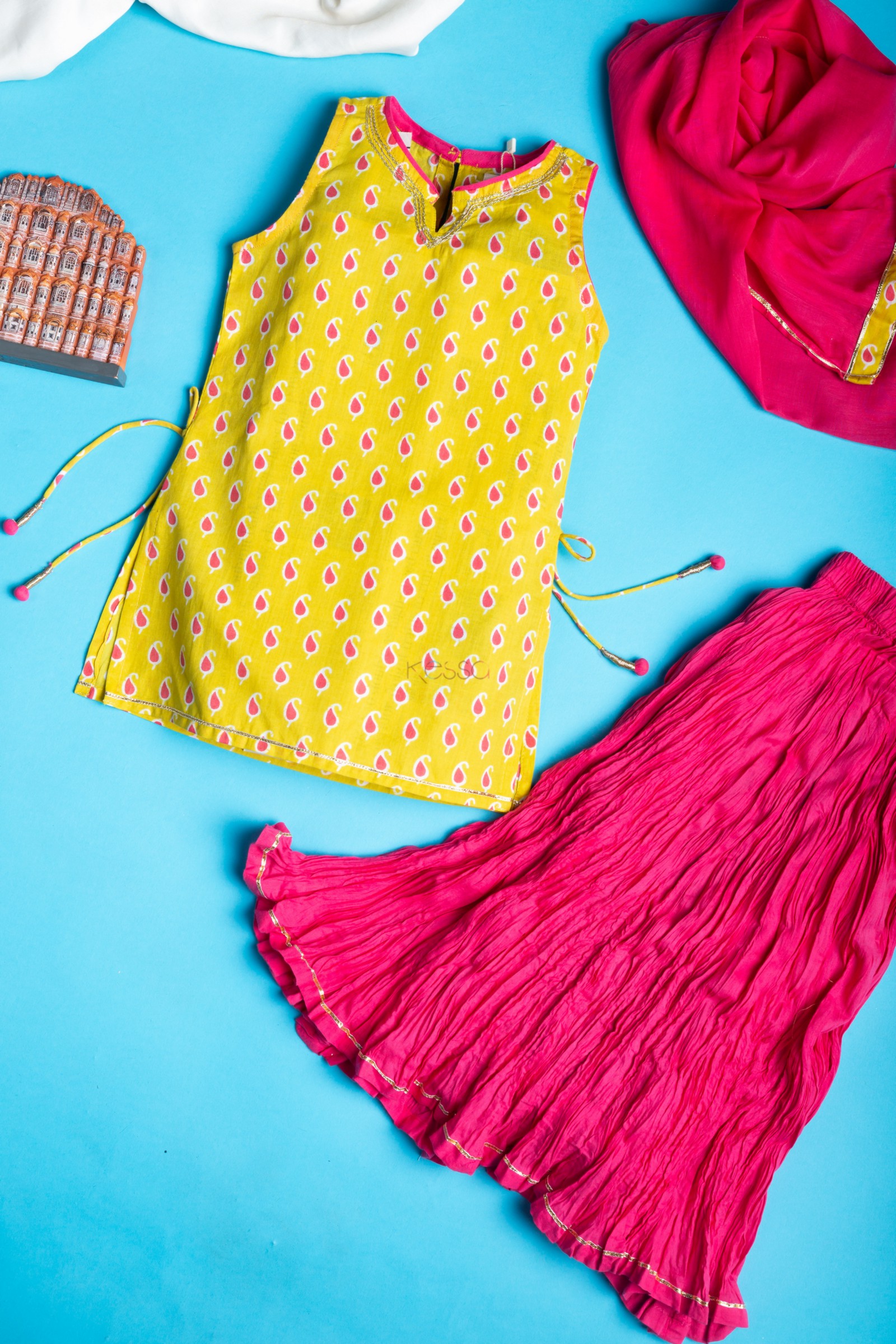 SKU: MBE87 The Cotton Skirt Set in a delightful peach and yellow combination showcases a charming butti print, creating a playful and vibrant look. The kurta’s neckline is elegantly highlighted with zari and piping, while the addition of side tassels adds a touch of whimsy. The pink skirt boasts panel highlights with gota detailing and features an elastic waist for a comfortable fit. The pink dupatta is adorned with fabric lace, and the ensemble is completed with a round V-cut neck and sleeveless design, making it a perfect summer outfit for young fashion enthusiasts.