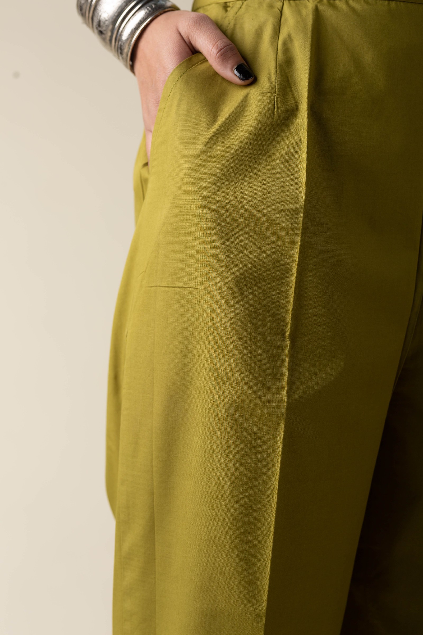 SKU: PNT006-mehendi-green These cotton poplin pants offer a comfortable and versatile fit, featuring a relaxed design with a back elastic waist for easy movement. They come with a convenient side pocket, perfect for casual, everyday wear.