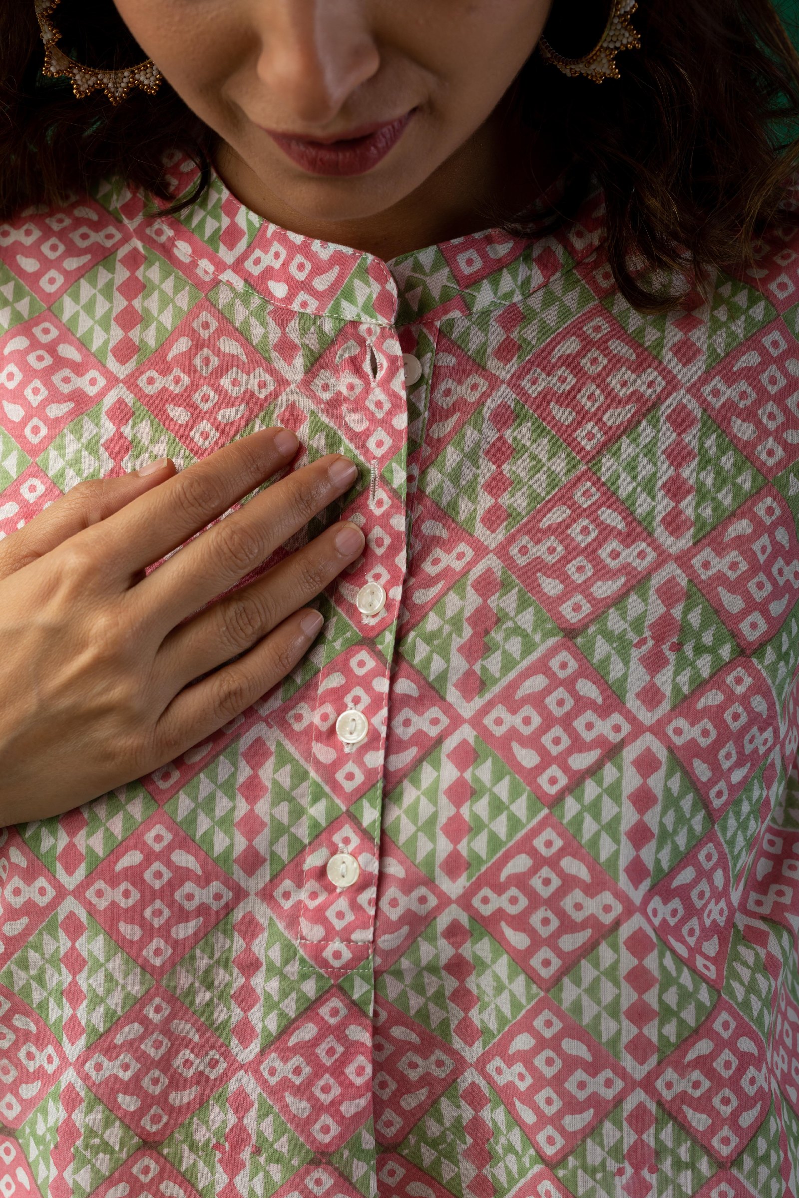 SKU: SHK027 This cotton short kurti features a vibrant red and green color combination adorned with traditional handblock prints. Designed with a smart collar neck and delicate shell buttons on the yoke, it adds a touch of elegance. The 3/4th sleeves and one side pocket offer both comfort and practicality, making it a stylish everyday pick.