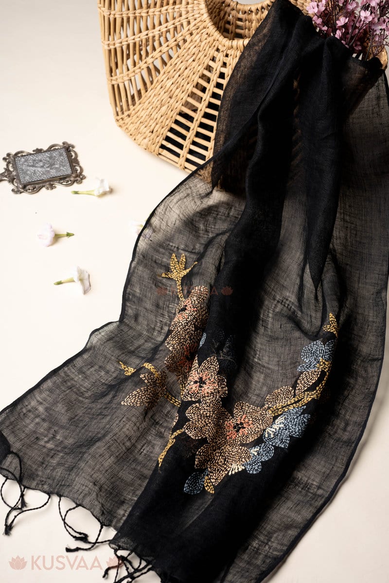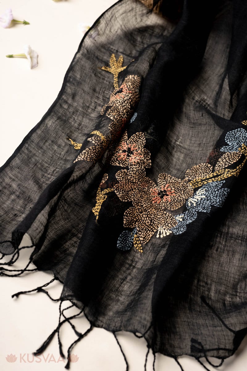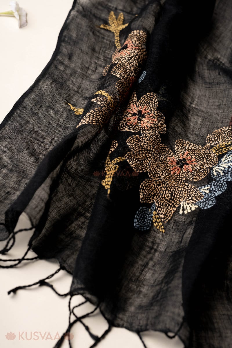 SKU: STO002 This linen stole is a classic, black fabric with an elegant embroidered floral pattern in pastel multi color. The delicate stitchwork features blossoms and vines that gracefully span the cloth, giving it a vintage, handcrafted charm. It makes a lovely accessory for adding subtle elegance to any outfit.