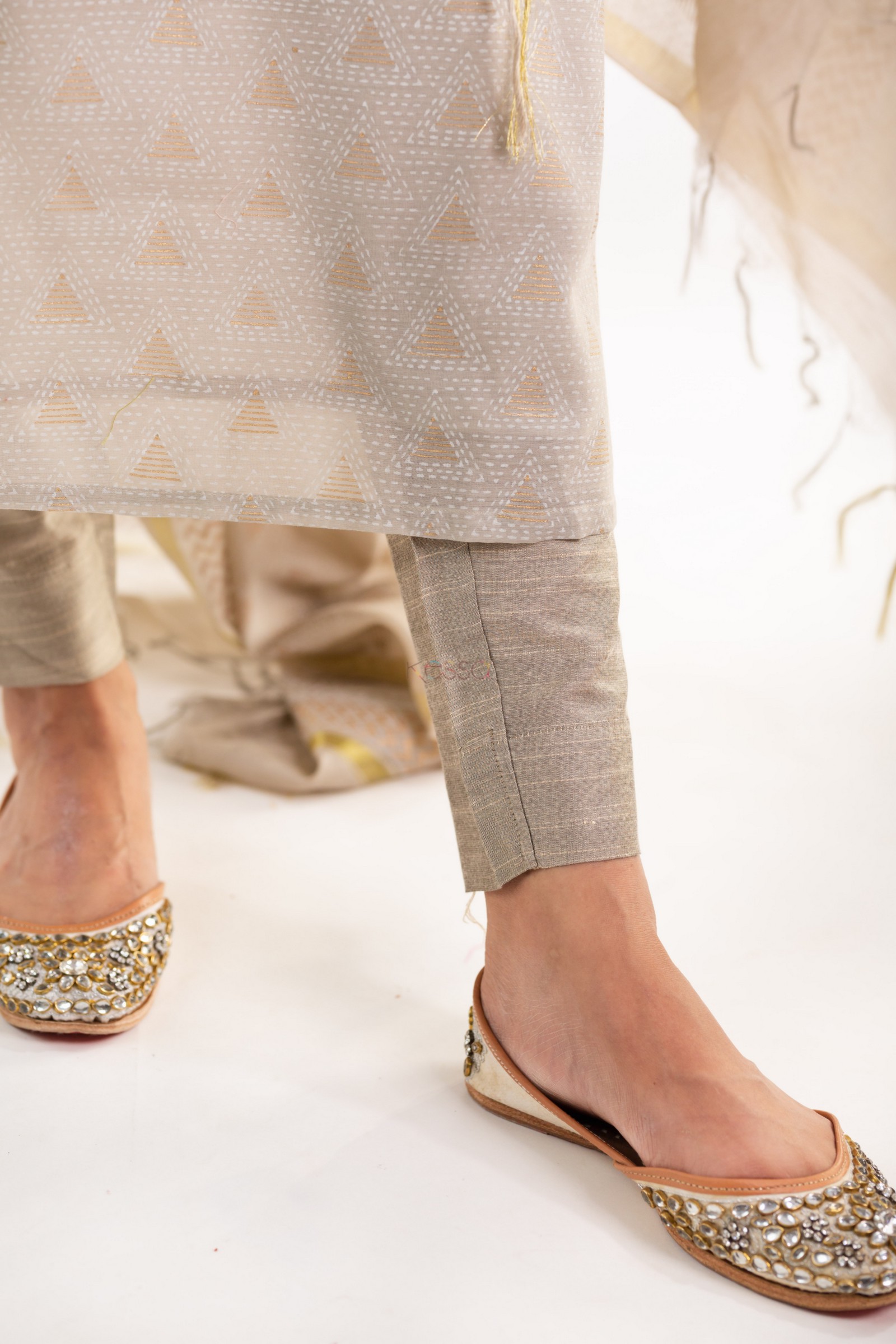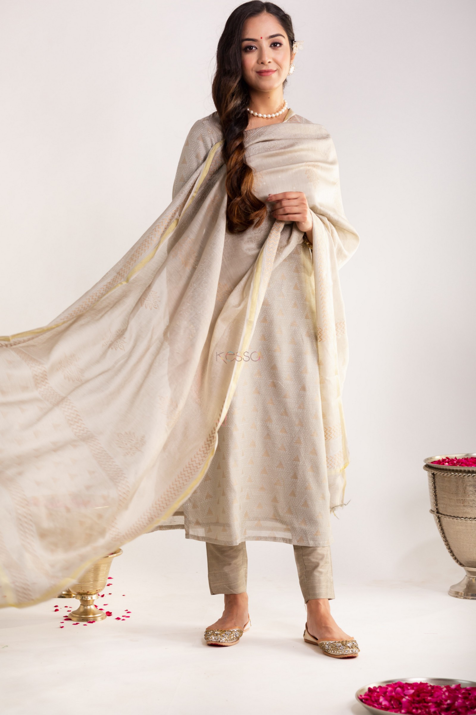 SKU: VCR151 Breeze through the day with the breathable comfort of 100% premium maheshwari silk. The sophisticated chanderi kurta grey of the universally-flattering straight kurta is adorned with intricate gold khadi motifs. The kurta is lit up with fine sequin, mirror, and zari work to some shimmering charisma. The classic v-neckline, and graceful 3/4th sleeves enhance the charm of nushi further. The set is complete with a lightweight Maheshwari dupatta with khadi jaal work. Pair it with our grey silk pants for an eye-catching outfit.