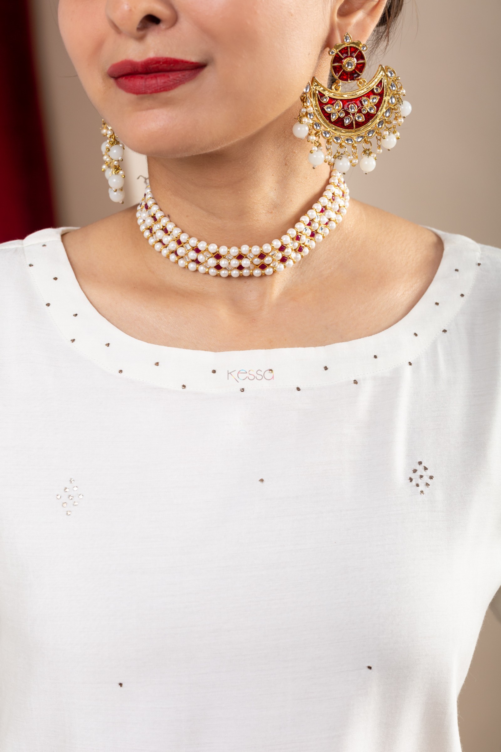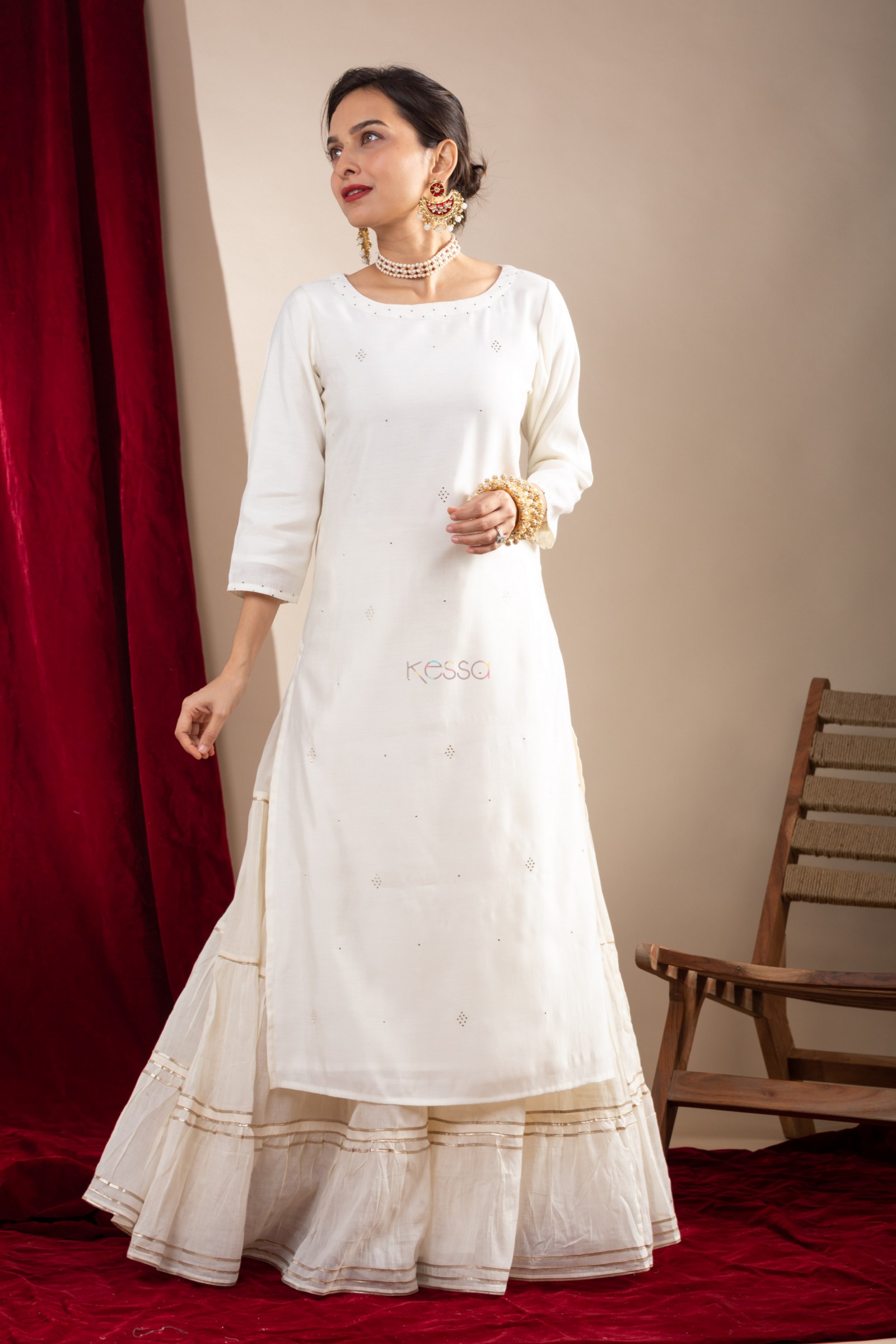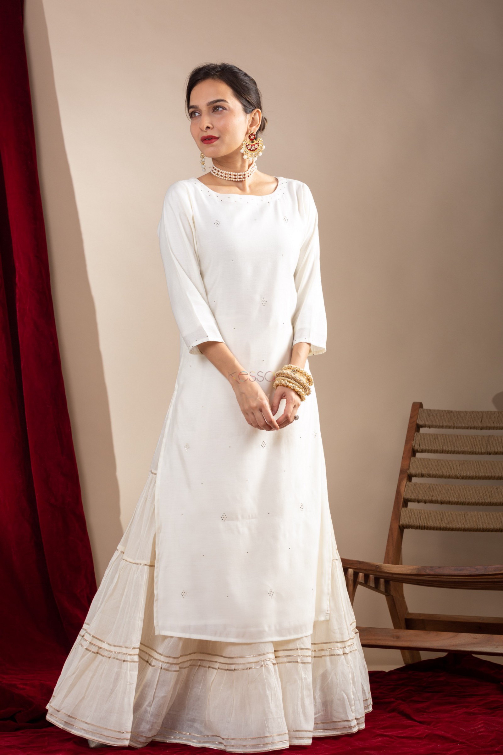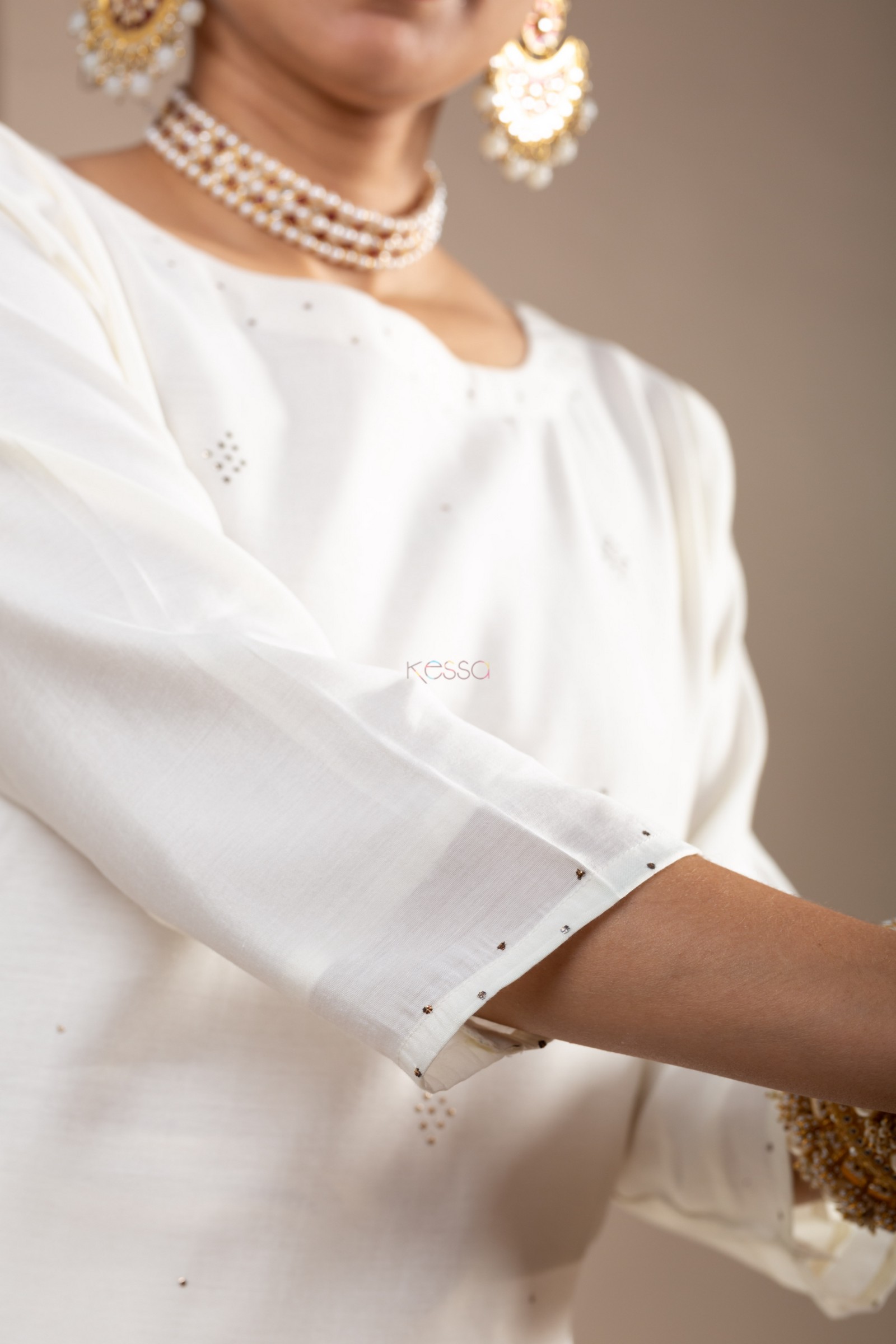 SKU: VCR221 Elevate your ethnic wardrobe with this exquisite off-white cotton silk kurta. Its straight fit design offers timeless elegance, while the boat neck and 3/4th sleeves add a touch of sophistication. The kurta is beautifully highlighted with intricate Mukesh work, combining traditional craftsmanship with contemporary style for a stunning, versatile addition to your collection. It features a cotton lining that ensures not only a beautiful drape but also a comfortable wear throughout the day. Pair it with our cotton Sharara for a cohesive look that exudes confidence.