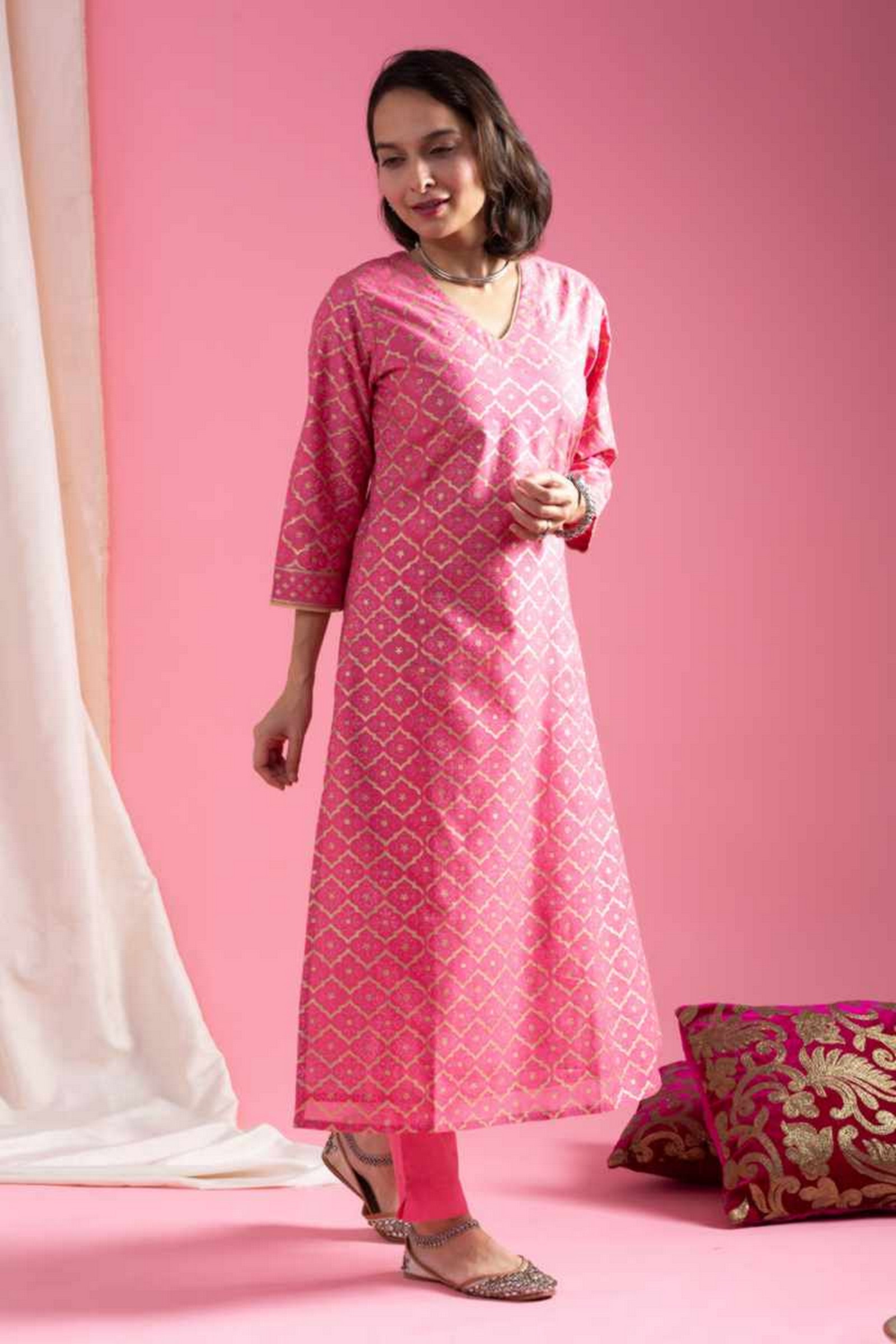 SKU: VCR227 Elevate your ethnic wardrobe with this exquisite Chanderi Kurta in a charming pink hue. The kurta features a shimmering neckline piping and intricate Khadi gold block printing, while the yoke sparkles with delicate sequin detailing. Shimmering piping along the sleeves and borders adds a touch of elegance. A flattering V-neck, and 3/4th sleeves, making this ensemble a perfect blend of traditional craftsmanship and contemporary style. Pair it with our Slub silk for a cohesive look that exudes confidence.