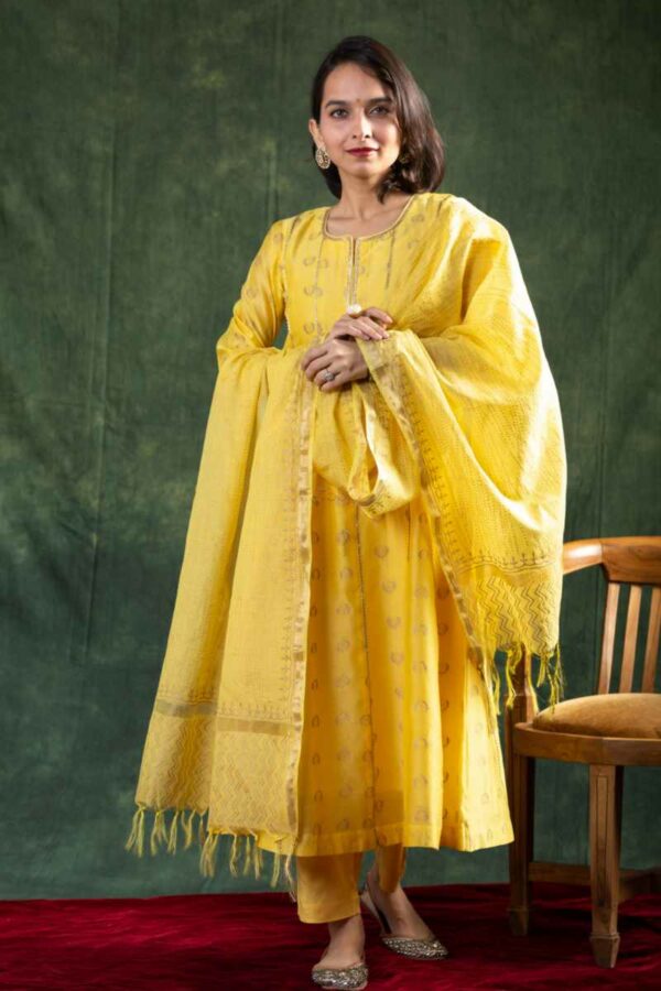 SKU: VCR231 Elevate your ethnic wardrobe with this enchanting Chanderi kurta and dupatta set in a radiant yellow hue. The A-line kurta boasts elegant gold khadi print and bijiya accents, while the matching dupatta features all-over gold khadi print for a coordinated look. With a round neck and a subtle V-cut, 3/4th sleeves, and the comfort of a cotton lining, this ensemble exudes timeless charm and grace. Pair it with our slub silk pants for a cohesive look that exudes confidence.