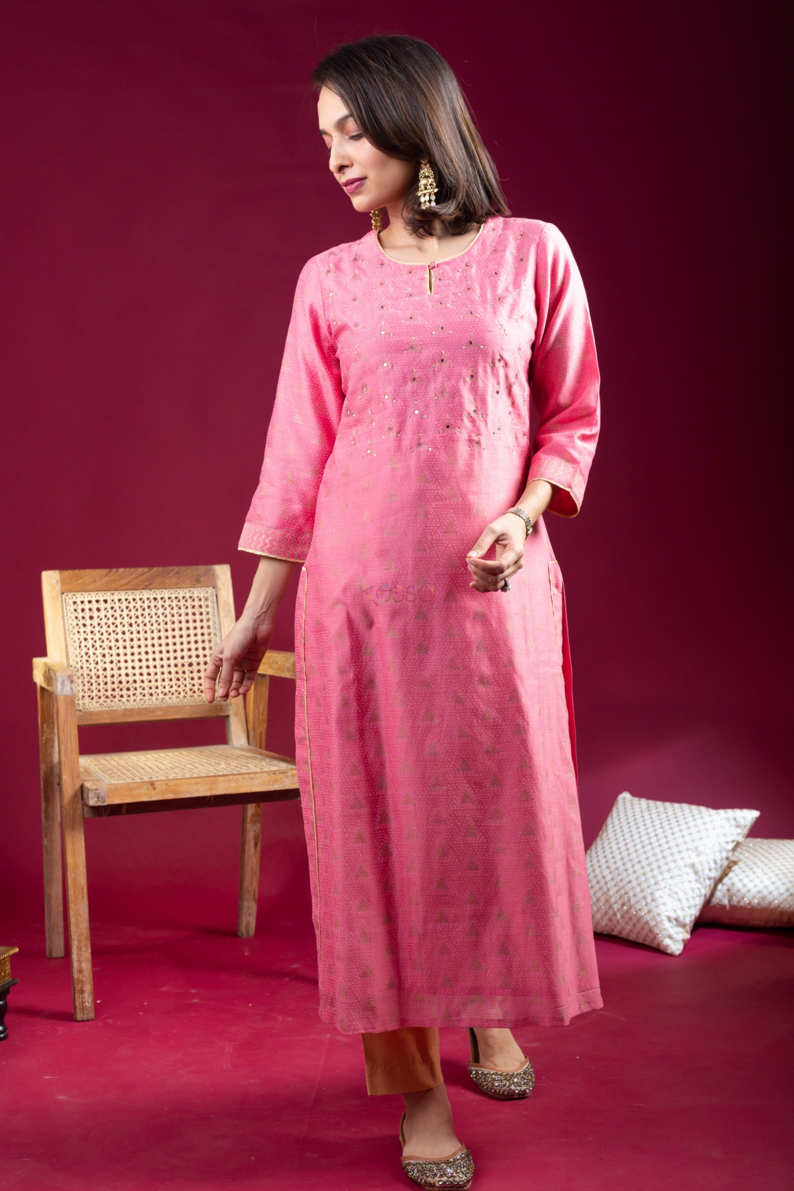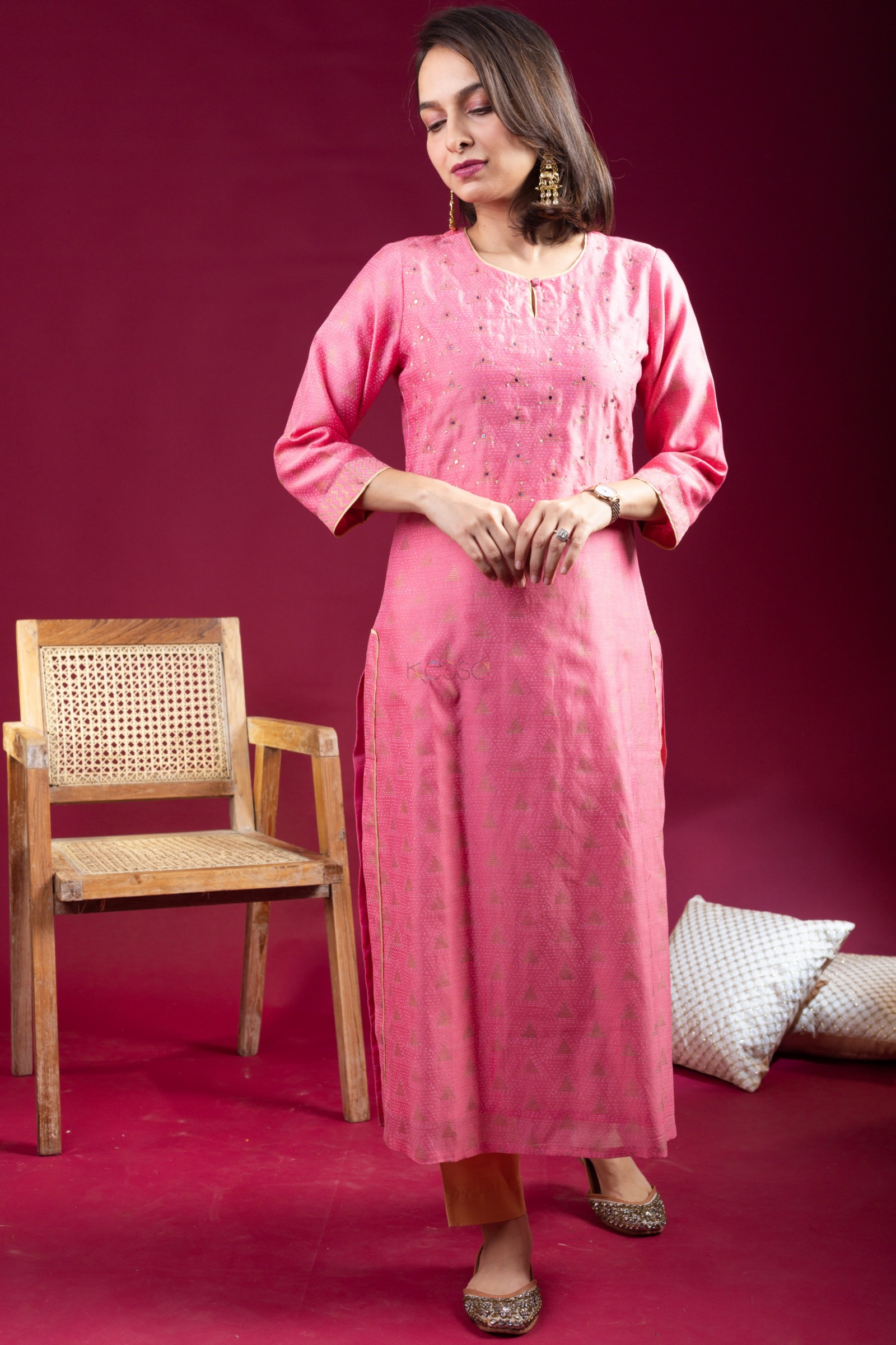 SKU: VCR248 The Chanderi kurta in a lovely pink hue boasts a graceful straight fit design. Its elegant yoke is adorned with shimmering sequins, delicate mirrors, and piping for a touch of sophistication. The 3/4th sleeves and panel are beautifully highlighted with border and piping details, adding a subtle yet striking contrast. The round neckline with an eye-cut design enhances its charm, while the cotton lining inside ensures comfort and breathability. This kurta is a perfect blend of style and comfort for any occasion. Pair it with our slik pant and silk dupatta for a cohesive look that exudes confidence.