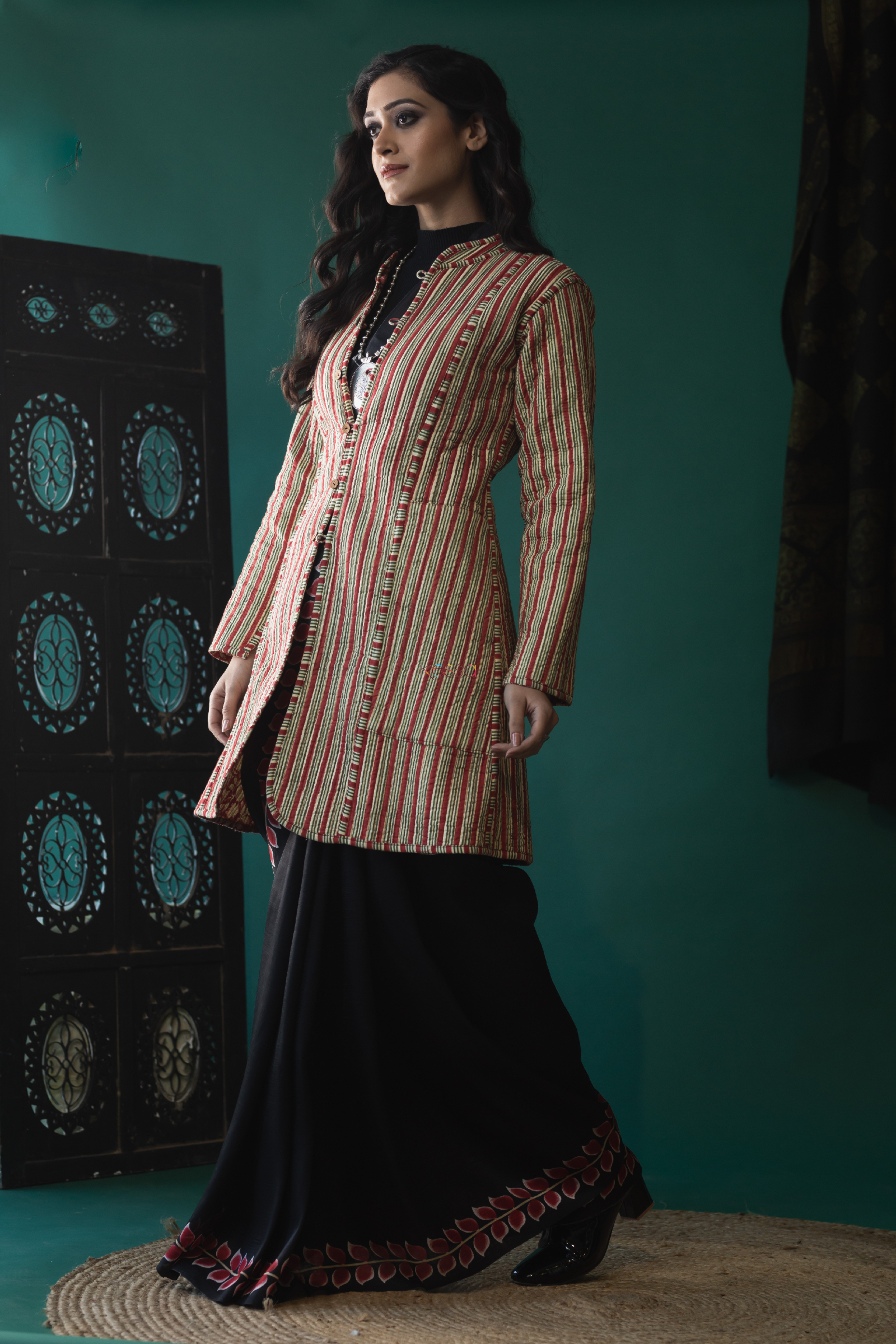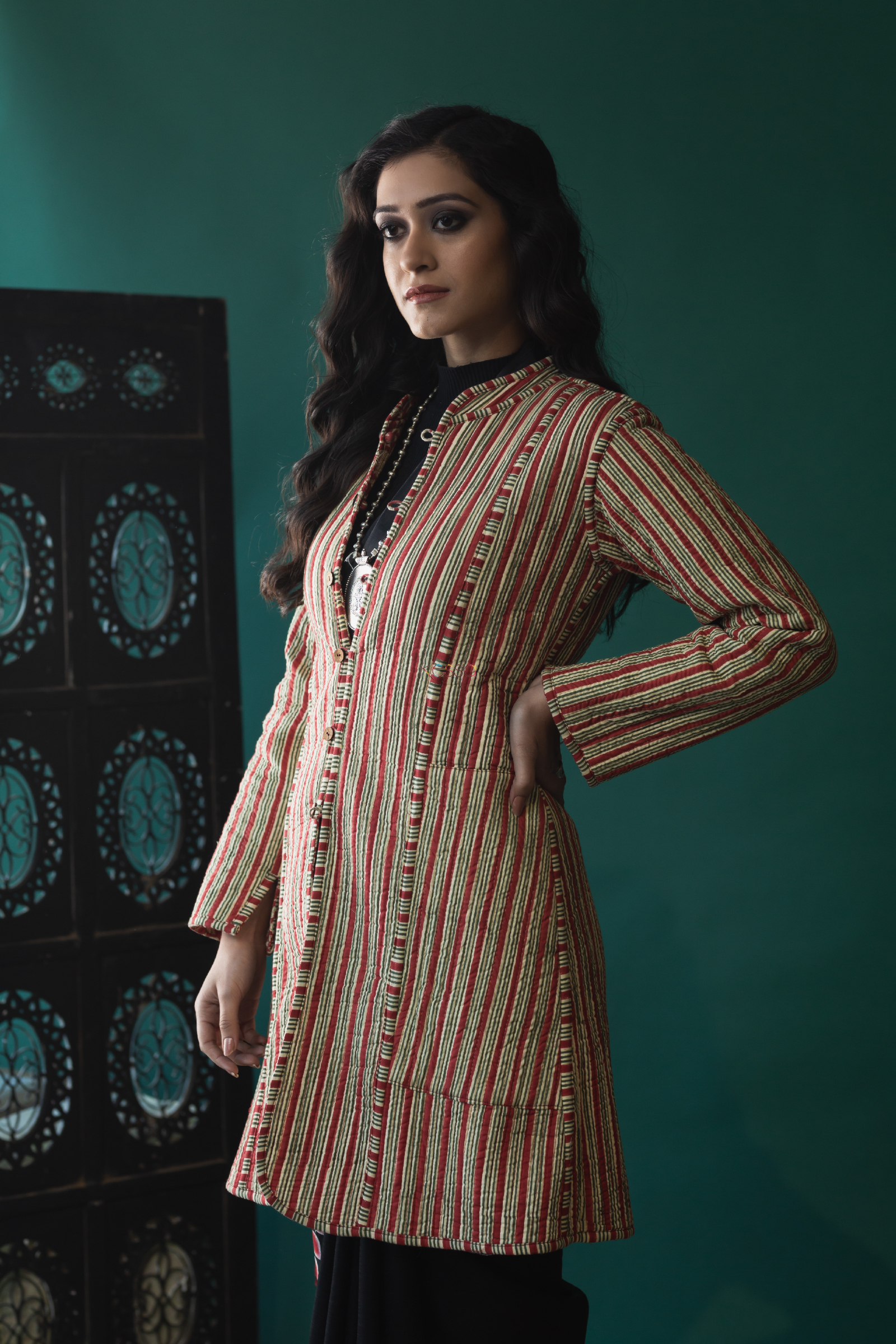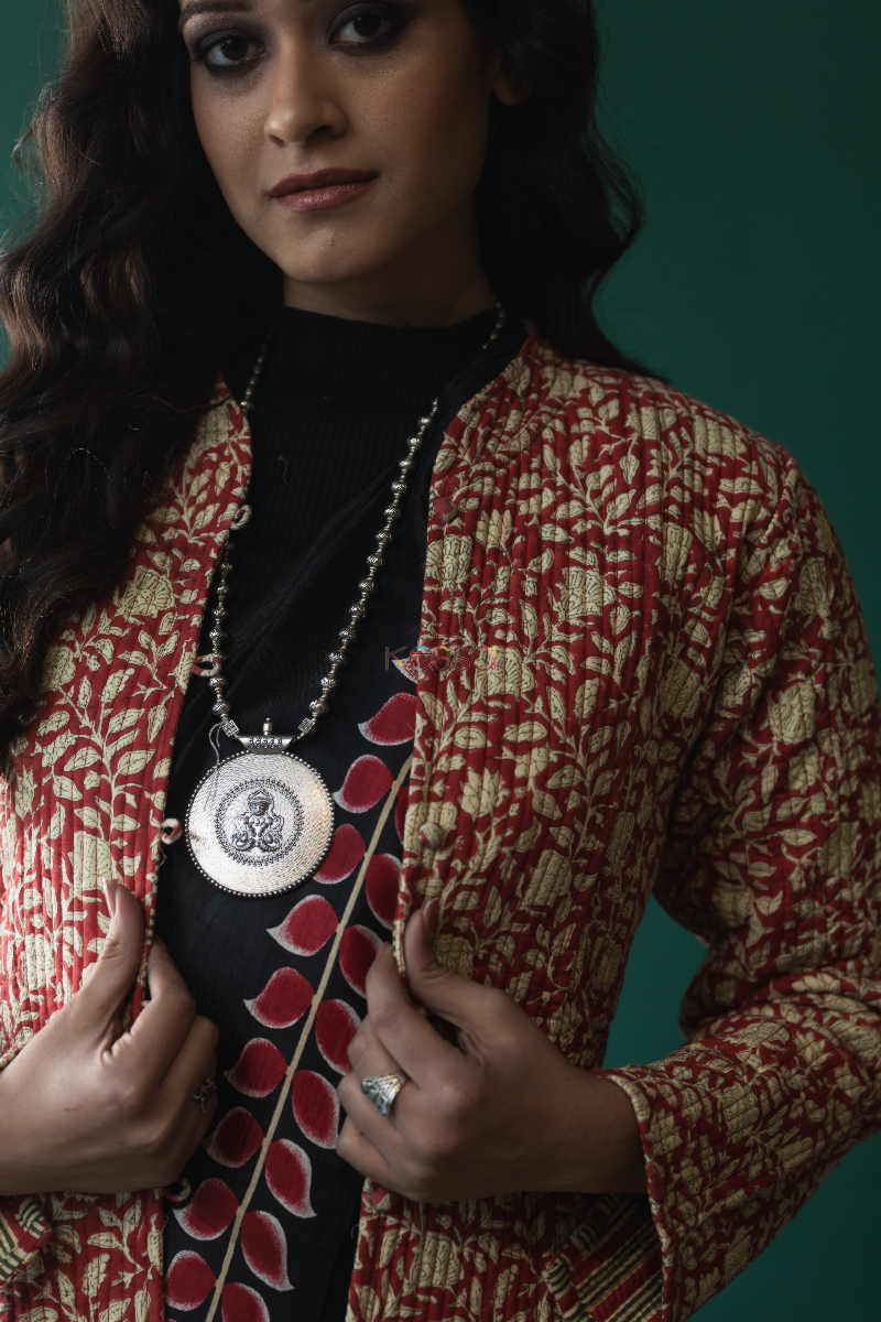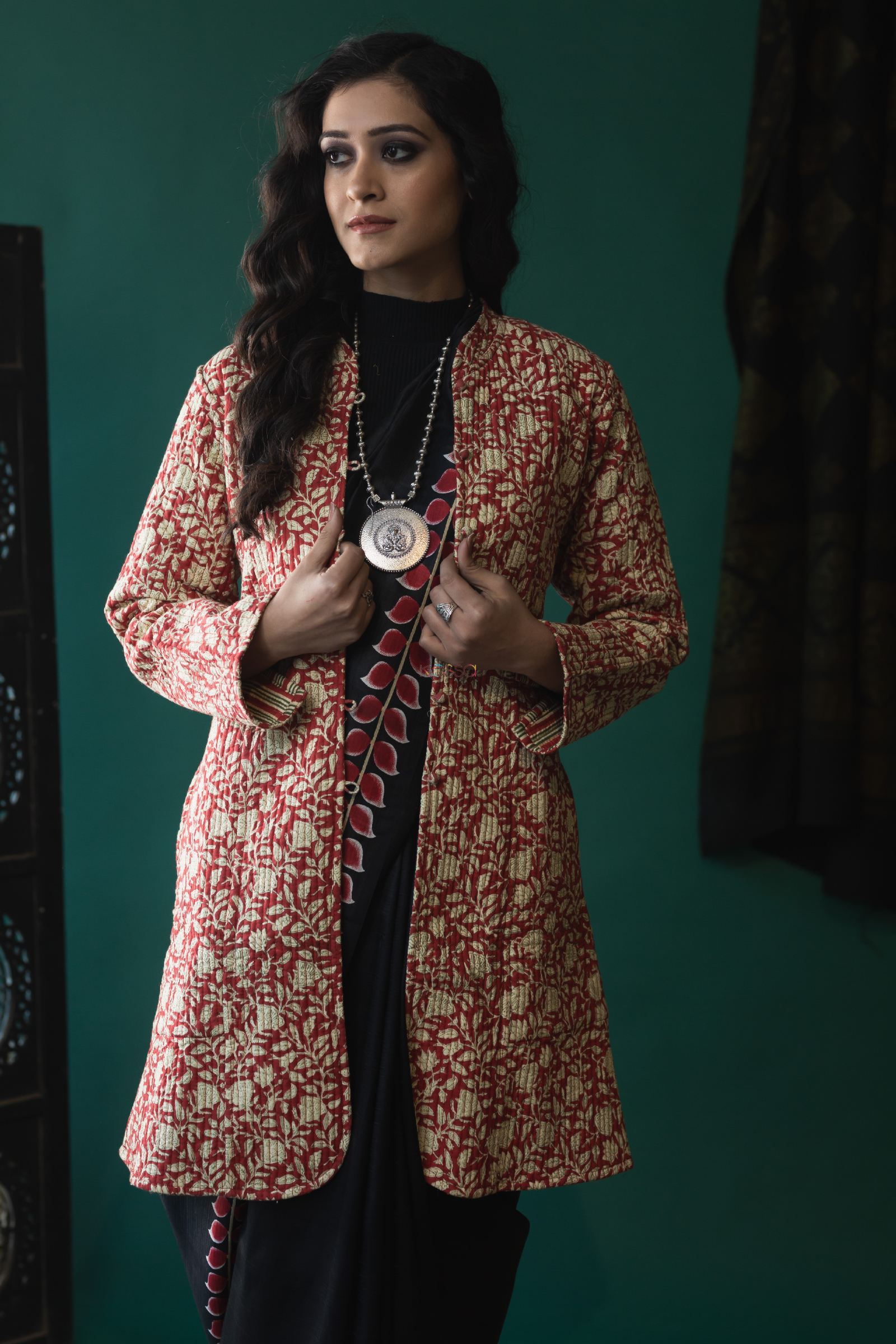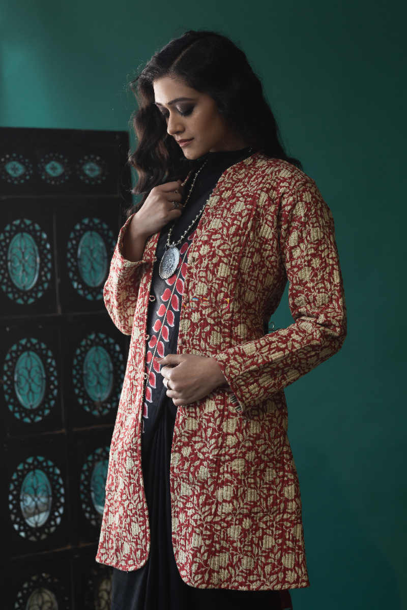 SKU: VJF02 This stylish collared-neck and quilted silk short jacket with cream and maroon color block-print goes well with most of the solid colored kurtas/kurtis. It is full sleeves and has 2 pockets on both sides. It comes with beautiful attached printed inside-lining, that is reversible.