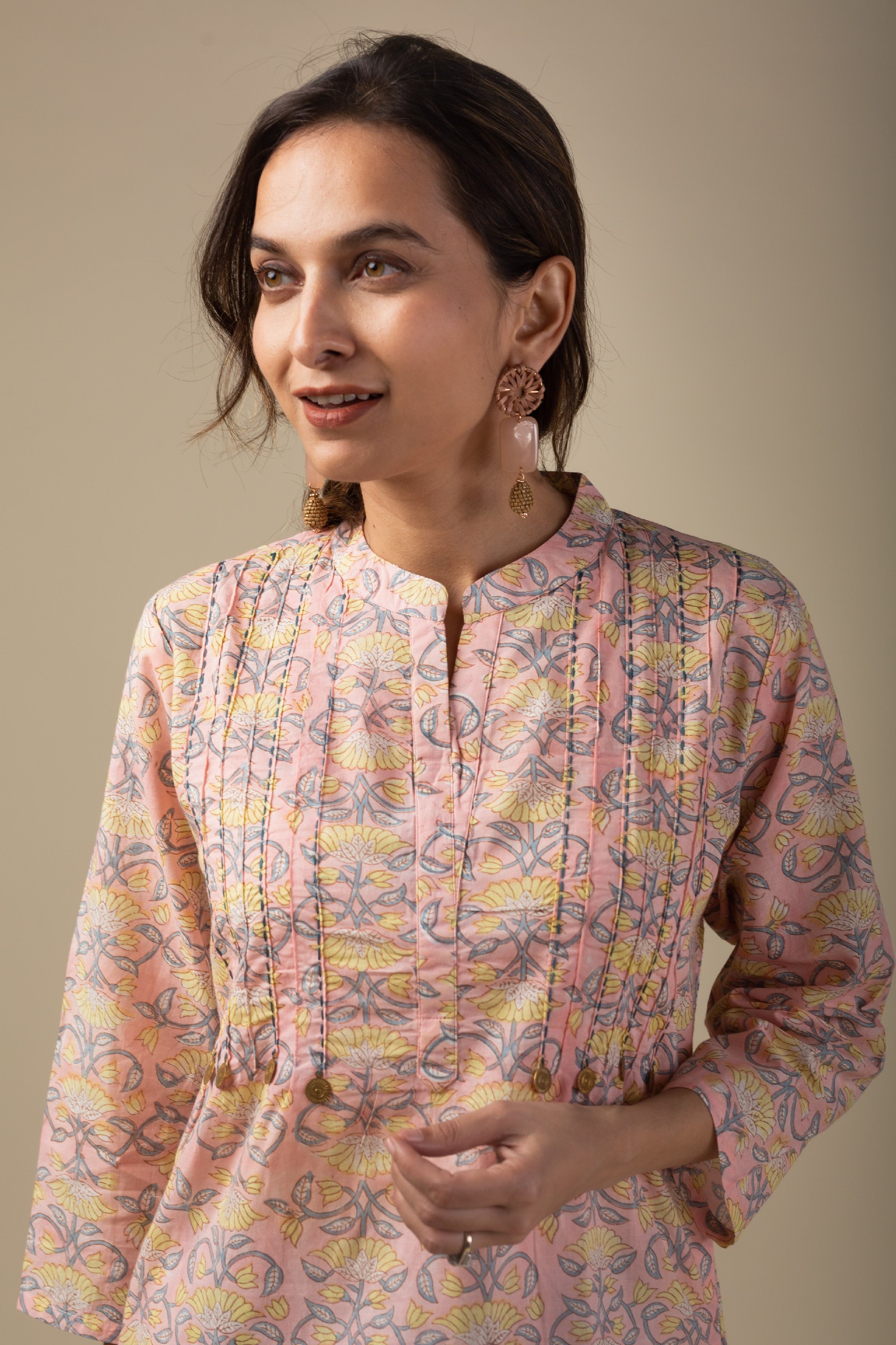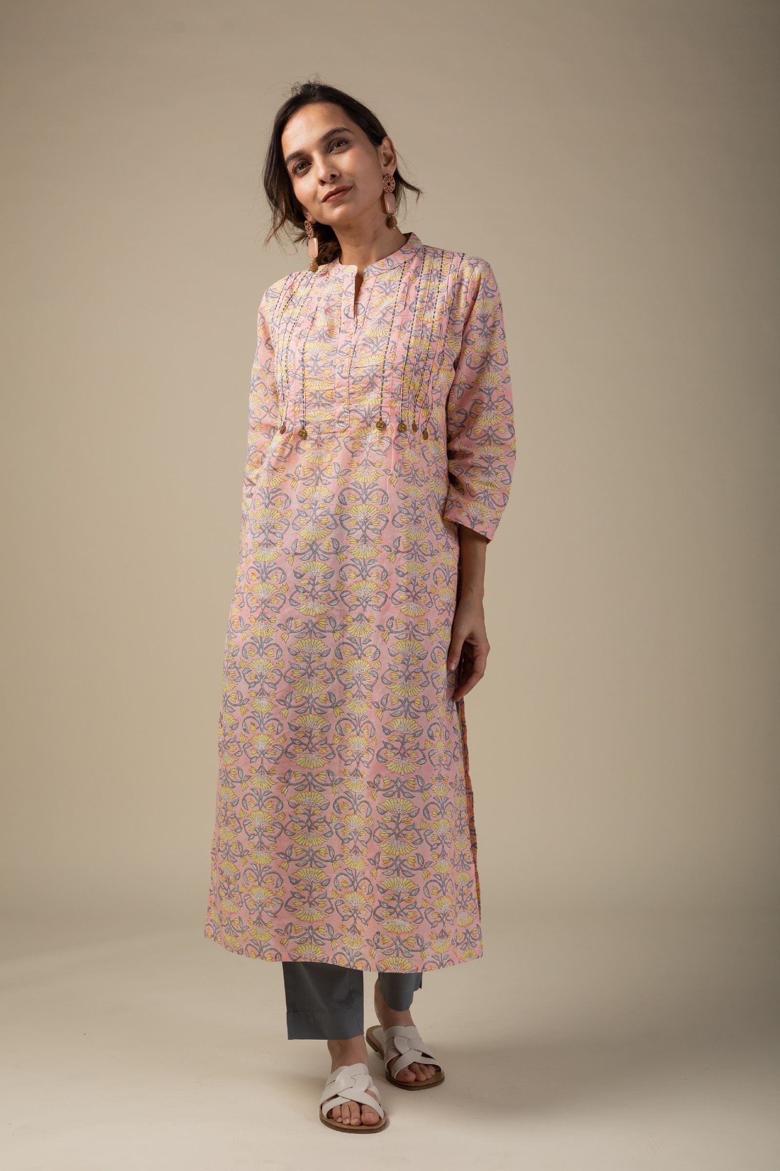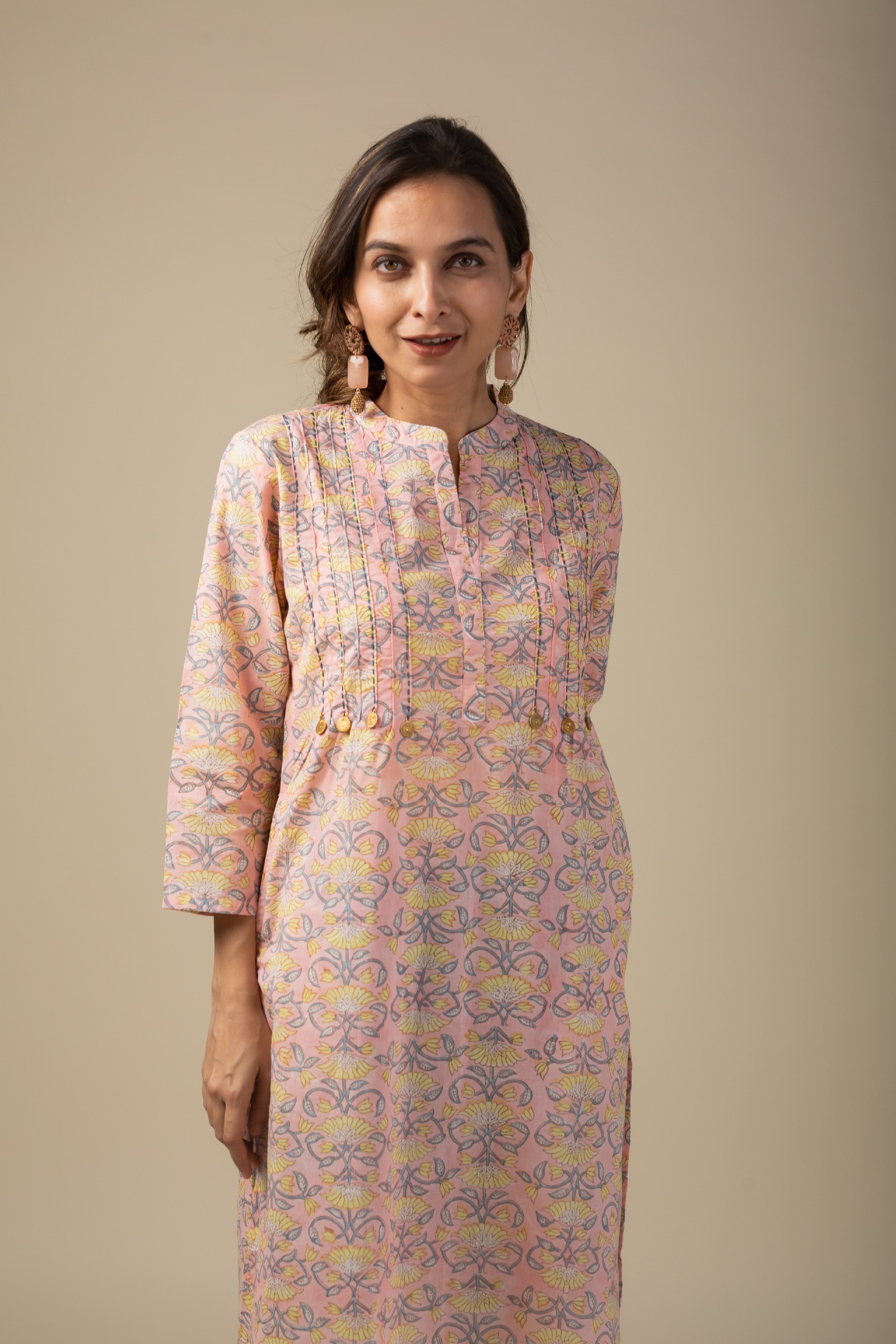 SKU: WKR010 This peach cotton kurta showcases a vibrant multi-color block print, adding a lively touch to its design. The yoke is beautifully accentuated with oxidized coins, intricate thread work, and a striking printed design. Featuring a stylish collar neck and 3/4th sleeves, it also offers practicality with both side pockets, making it an elegant and functional choice for any occasion. Pair it with our cotton pant for a cohesive look that exudes confidence.