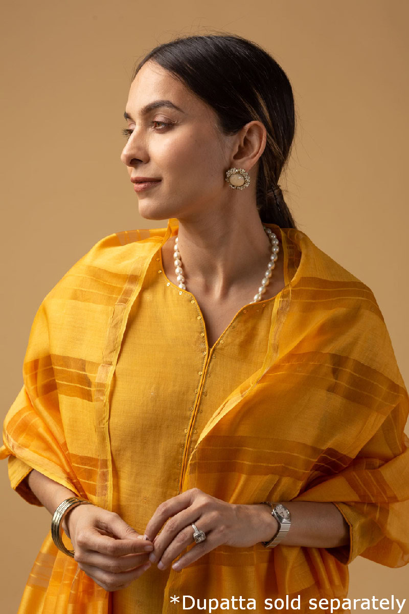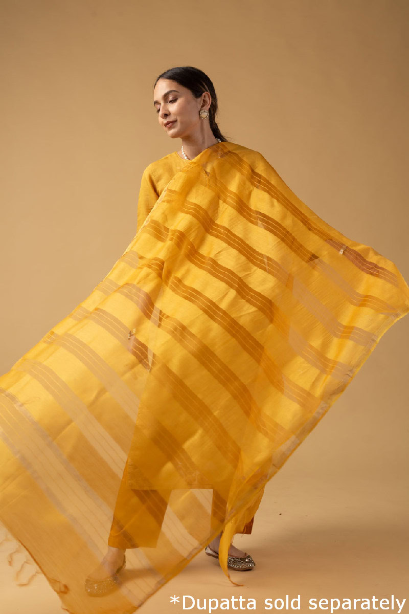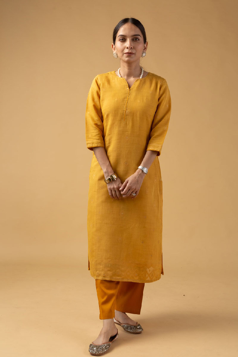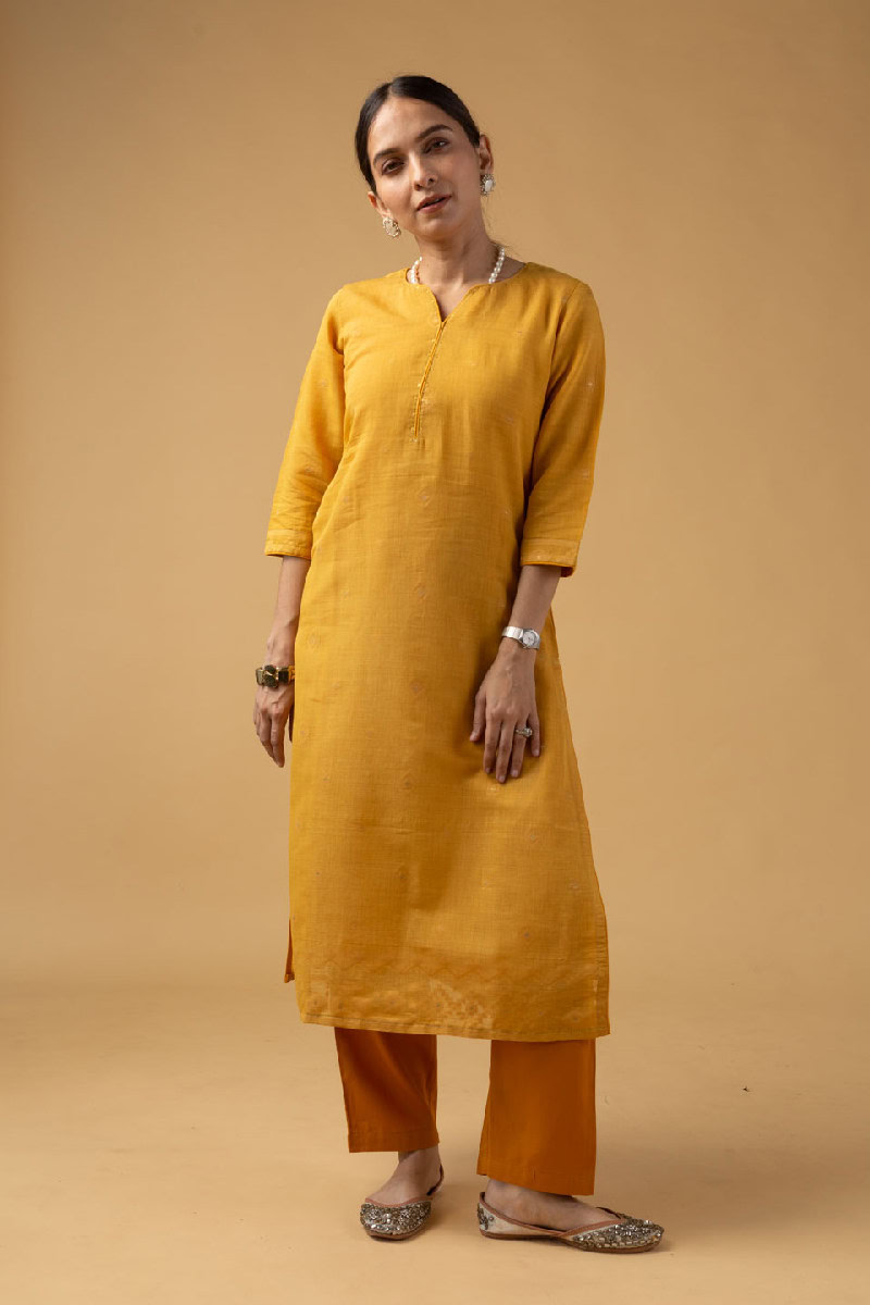 SKU: WKR079A This elegant Chanderi jamdani kurta pant set in a refreshing mustard color features a V-neck design with a yoke highlighted by delicate sequin work and piping details. The kurta comes with comfortable 3/4th sleeves and a soft cotton lining, ensuring breathability and ease. this kurta pairs beautifully with our palazzos or pants.