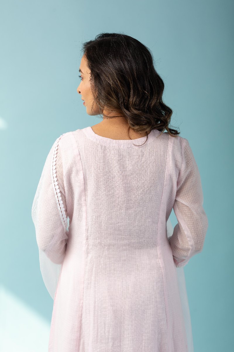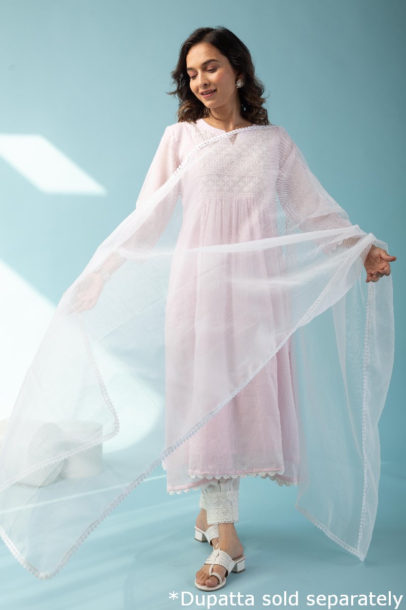 SKU: WKR116 This elegant Kota Doria kurta comes in a soft baby pink hue, featuring delicate white hand-thread embroidery on the yoke. Designed with a round neck and a subtle V-slit, it has 3/4th sleeves finished with graceful white lace. The kurta includes a practical side pocket and is lined with breathable cotton for all-day comfort, this kurta pairs beautifully with white salwer.