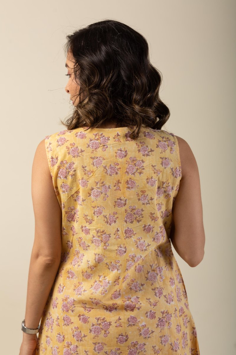 SKU: WKR147 This elegant cotton kurta features a sleeveless design with a flattering round neck and a jacket-style yoke highlighted with delicate beads for a subtle touch of sophistication. The charming floral print in pastel tones adds a graceful appeal, while the A-line silhouette ensures comfort. Designed with functionality in mind, it also includes a convenient one-side pocket. Perfect for casual or semi-formal occasions. Pair it with our cotton palazzo for a cohesive look that exudes confidence.