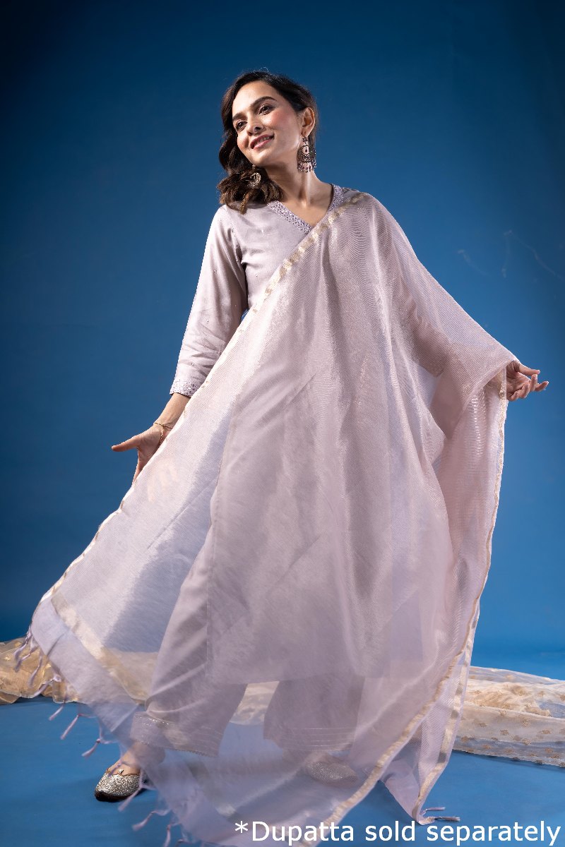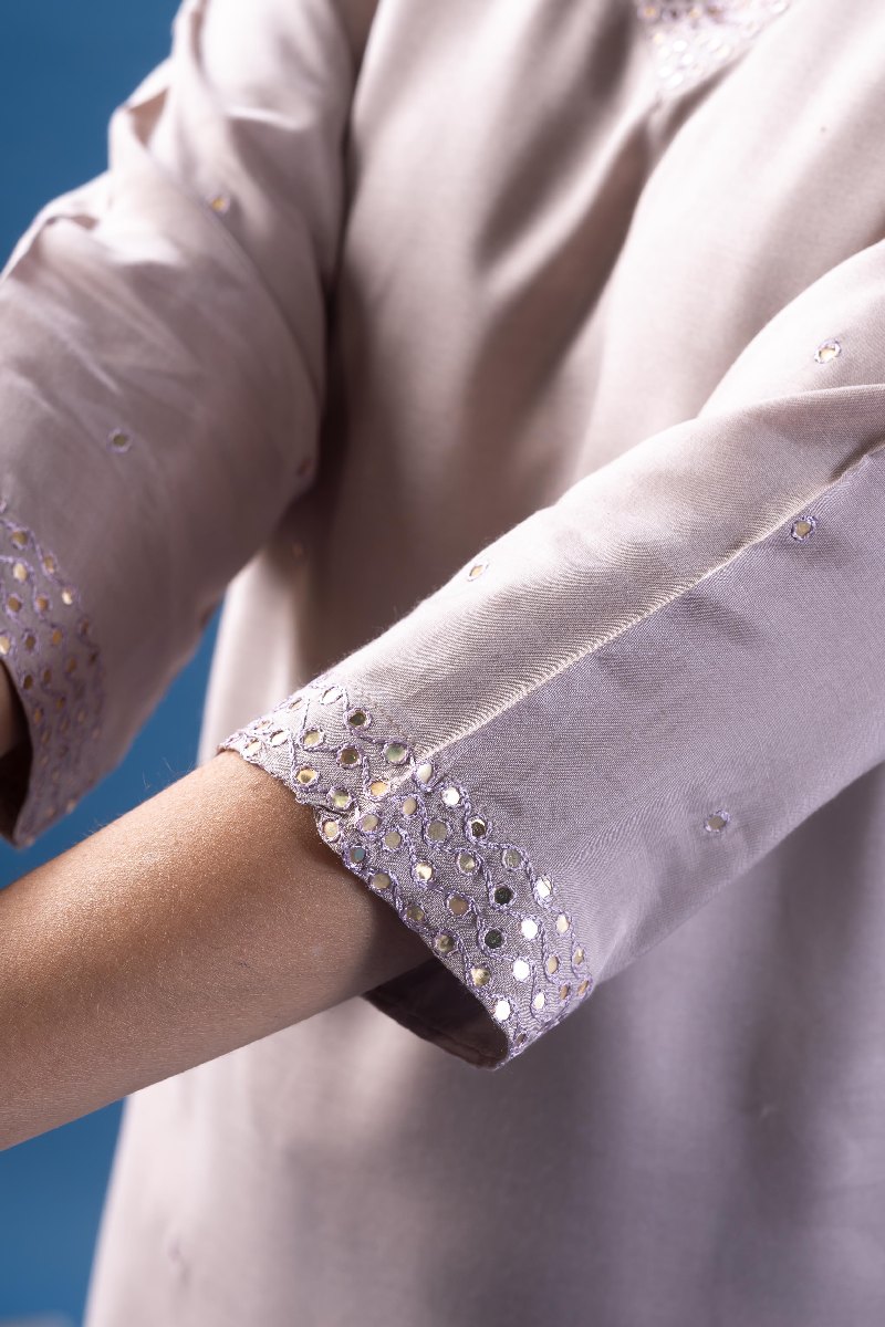 SKU: WKR184 This elegant kurta is crafted from soft lavender Chanderi fabric with a comfortable cotton lining. It features delicate sequin handwork scattered all over, a V-neck highlighted with mirror work detailing, and 3/4th sleeves adorned with matching embroidery. Designed with a straight fit and one side pocket for added functionality.