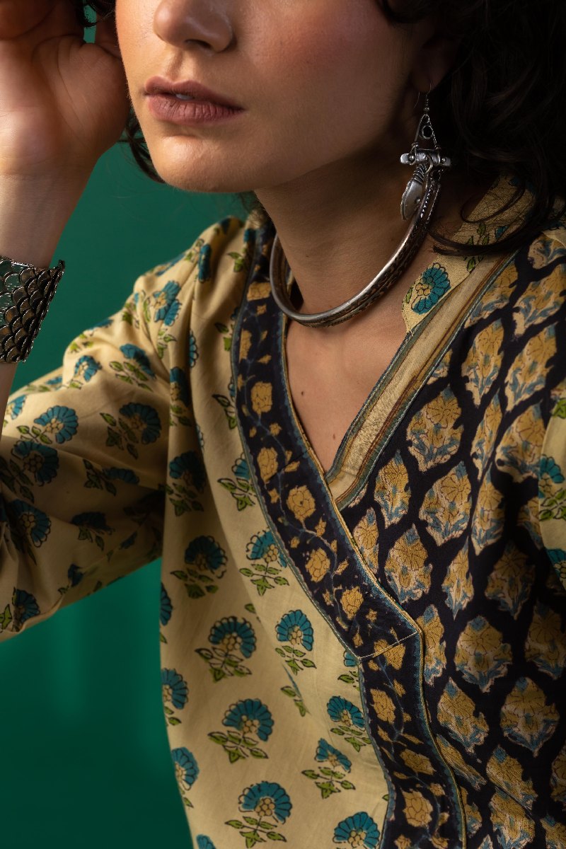 SKU: WKR193 This beige cotton kurta is adorned with multicolor handblock prints, giving it a vibrant yet elegant appeal. It features a collar neck with angrakha-style detailing and 3/4th sleeves highlighted with a contrasting border. Designed in a flattering A-line silhouette with a functional side pocket, it blends traditional charm with everyday comfort.